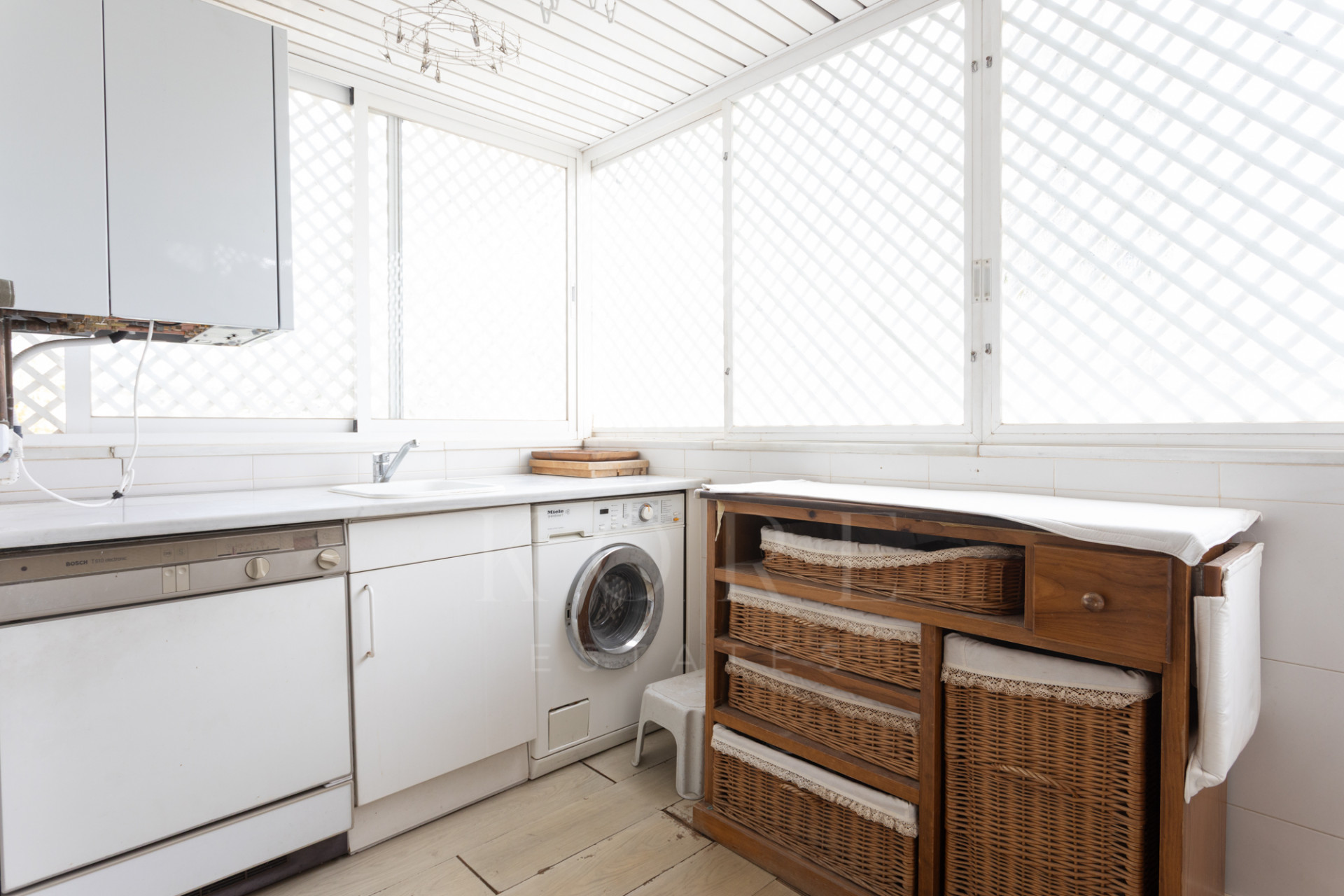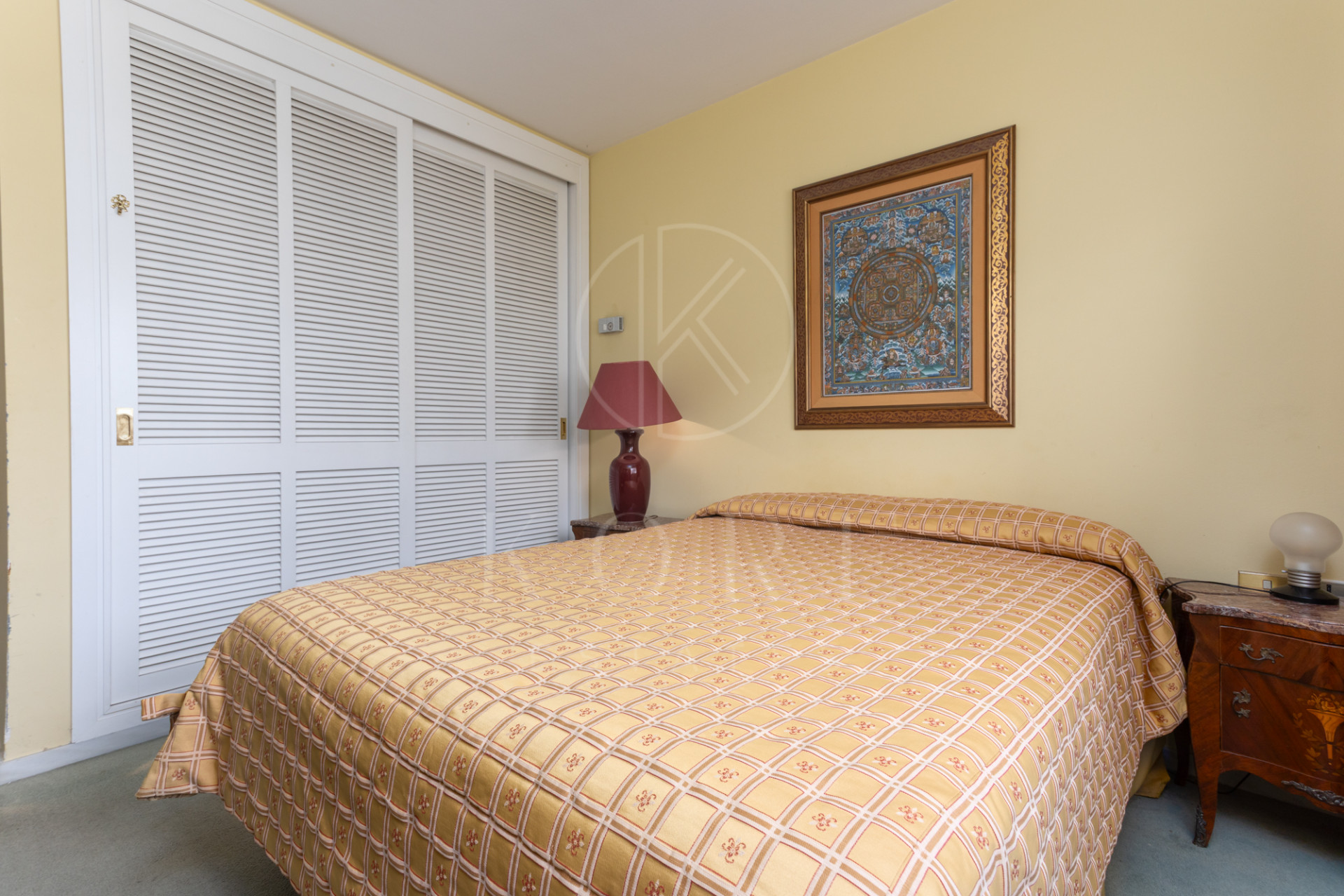 In excellent condition, the apartment is finished to a high standard with marble floors, air conditioning, central heating, electric shutters, fitted wardrobes, and a reinforced security door. A private parking space in the underground garage is included in the price.