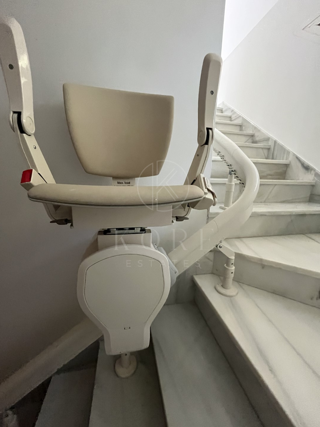 Solarium level: summer kitchen, three bedrooms (two en-suite), three bathrooms, spacious solarium terrace with private pool, barbecue area, and stunning open views. The pool is equipped with a lift chair for people with reduced mobility, and the duplex also features a private stair lift for convenient access between floors.