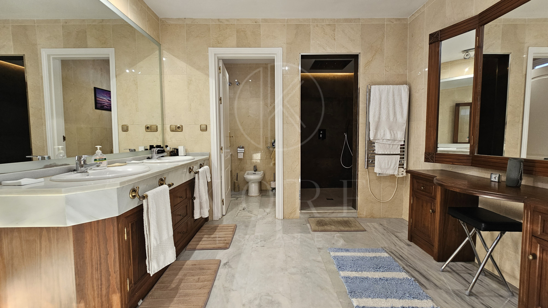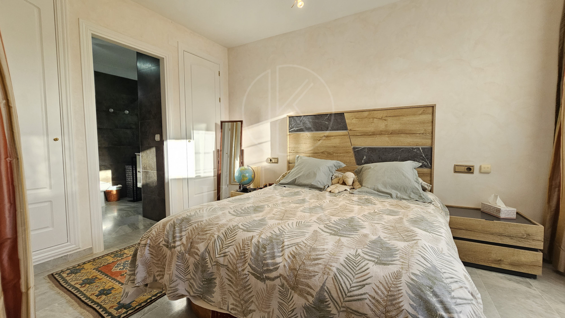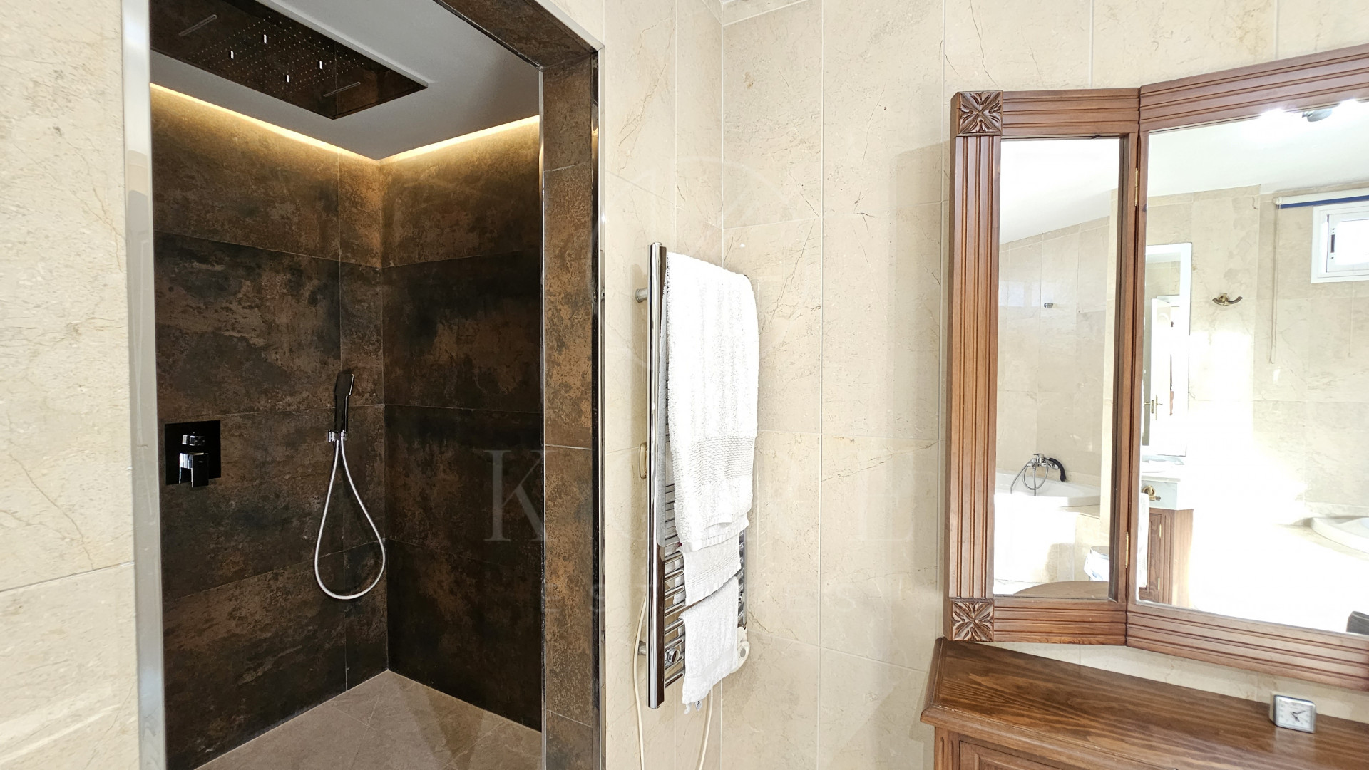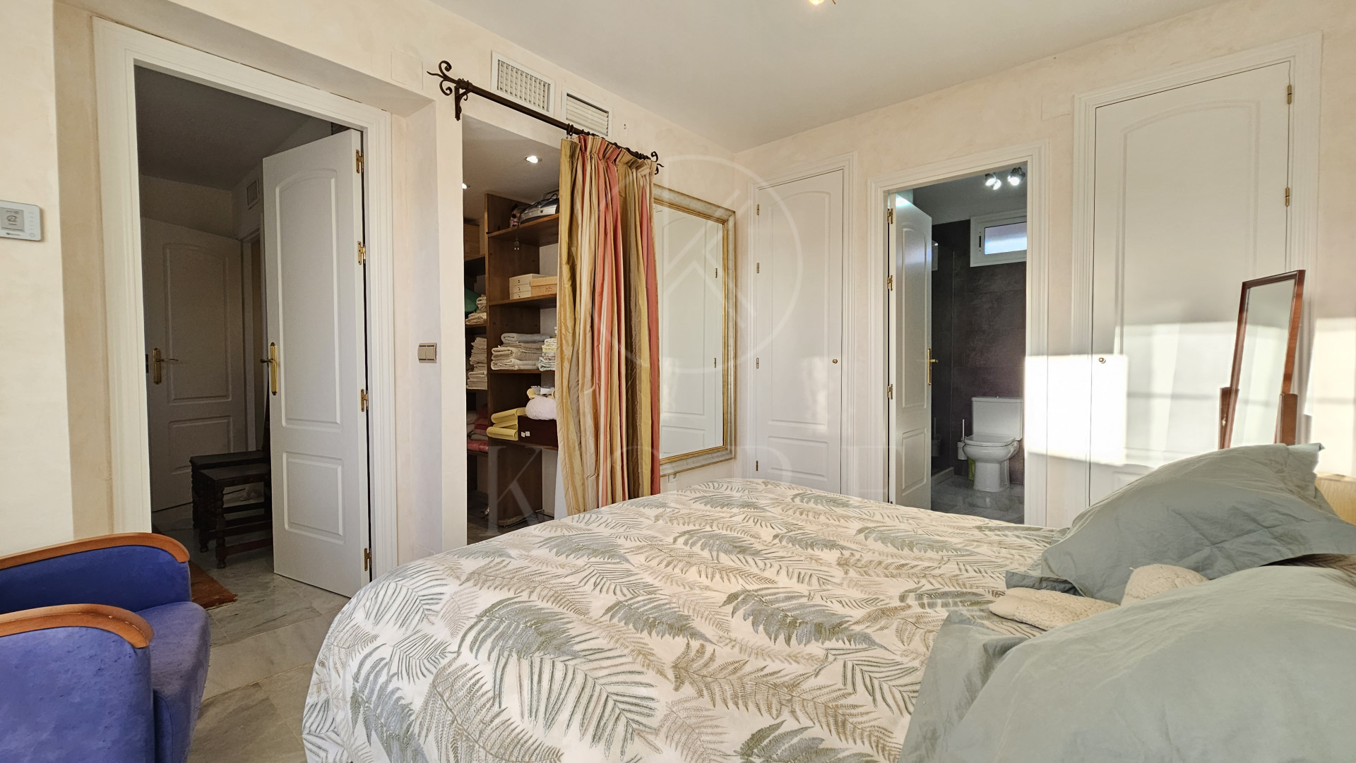 The penthouse features three expansive bedrooms, each designed with comfort in mind, and four modern bathrooms, including a multifunctional rain shower for a spa-like experience. The interior exudes elegance with marble flooring throughout, a cosy fireplace in the living room, and a dedicated study and office room. The walk-in closet and utility room add to the practicality of this home. Double glazing by Kommerling ensures energy efficiency, while the ‘Airzone’ remote-controlled air conditioning system provides tailored climate control for each room. The property has been recently renovated, presenting itself in impeccable condition, ready for immediate occupancy.