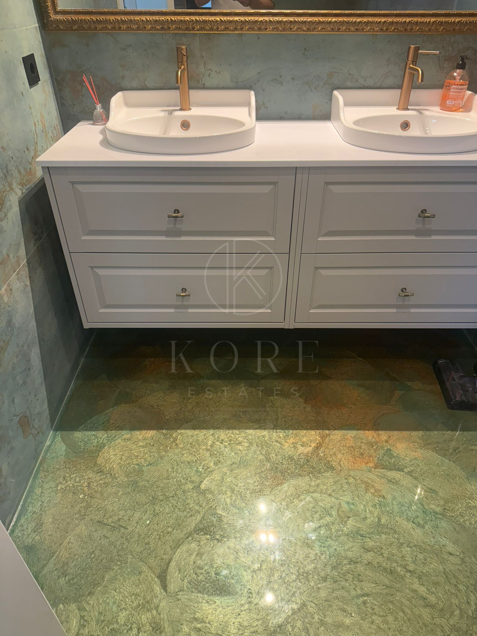 Spanning 90 m² of meticulously redesigned space on the first floor (no lift, interior position for added privacy), this east-facing gem has undergone a complete renovation this year: new electrical and plumbing systems, state-of-the-art air conditioning units, sleek resin flooring throughout, innovative folding windows for seamless indoor-outdoor flow, premium marble countertops and sink in the kitchen, and new aluminium windows enhancing energy efficiency and natural light. The layout features two spacious bedrooms with fitted wardrobes, two modern bathrooms, a bright living-dining area with sea views from the window, and a private entrance adding exclusivity. Step out to the beautiful communal pool, offering stunning vistas over the golf course and sea—ideal for relaxation or entertaining.