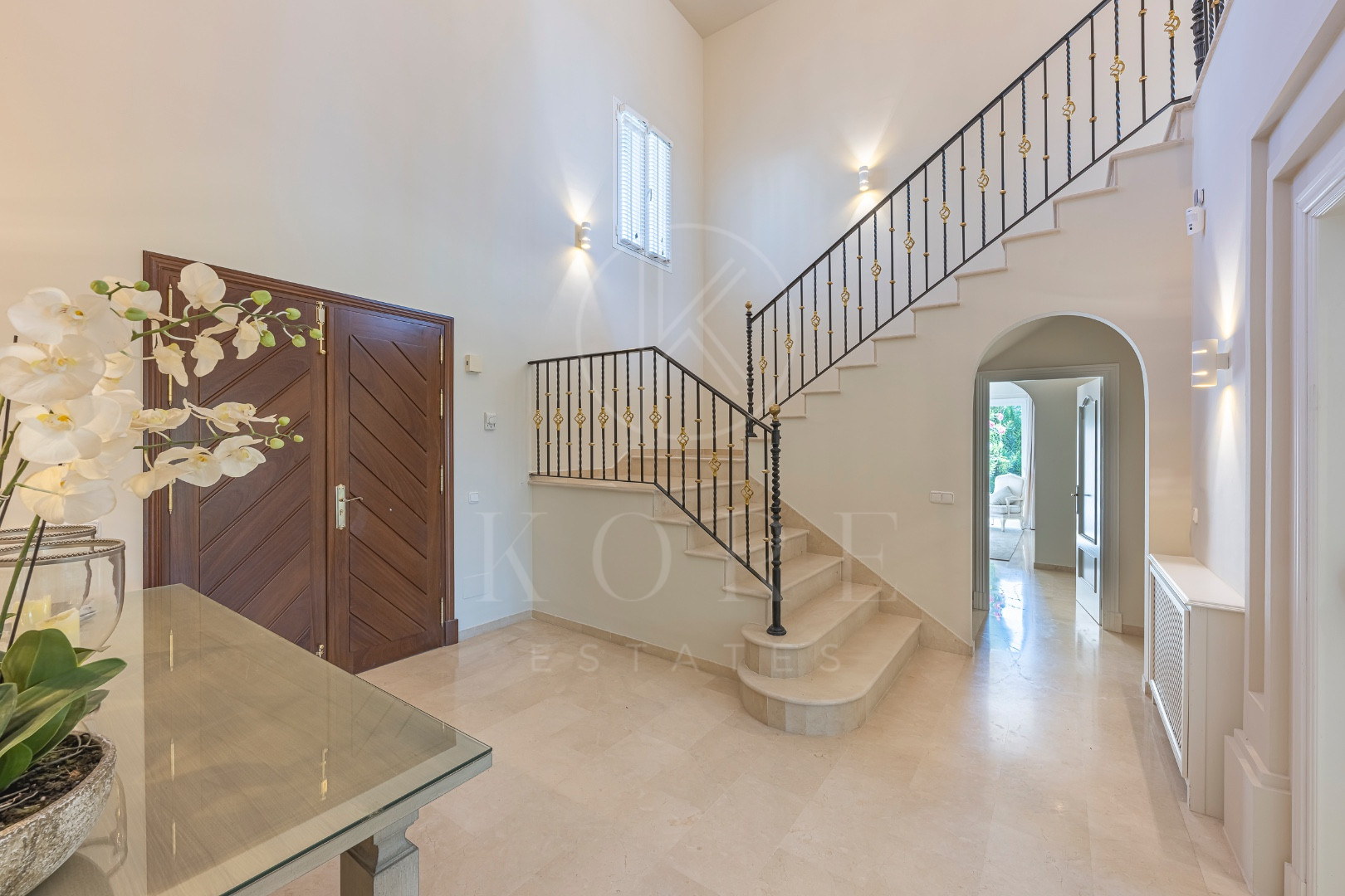 Nestled in the heart of La Reserva de La Quinta, one of the most exclusive gated communities in Benahavís, this classic Andalusian-style villa enjoys a privileged frontline golf position, surrounded by lush nature, total privacy, and timeless elegance. From the moment you enter through its grand double-height foyer, the home conveys an immediate sense of spaciousness and harmony, with a layout designed to ensure comfort and seamless flow between the indoor and outdoor living areas.