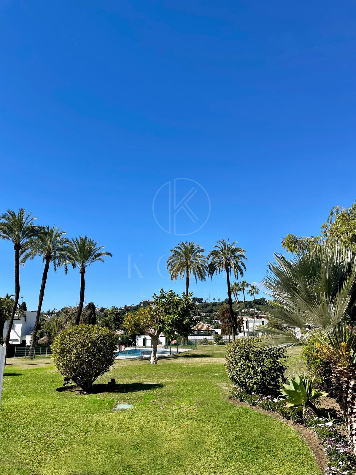The charming Andalusian-style gated urbanization boasts expansive mature gardens with palm trees, a large swimming pool, and a covered carport parking lot, also gated.