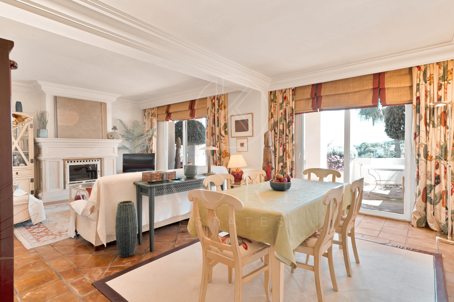 The spacious living and dining area leads to a front terrace with stunning panoramic views of the golf course and the sea, while the rear terrace provides serene vistas of La Concha Mountain, the landscaped gardens, and the pool.