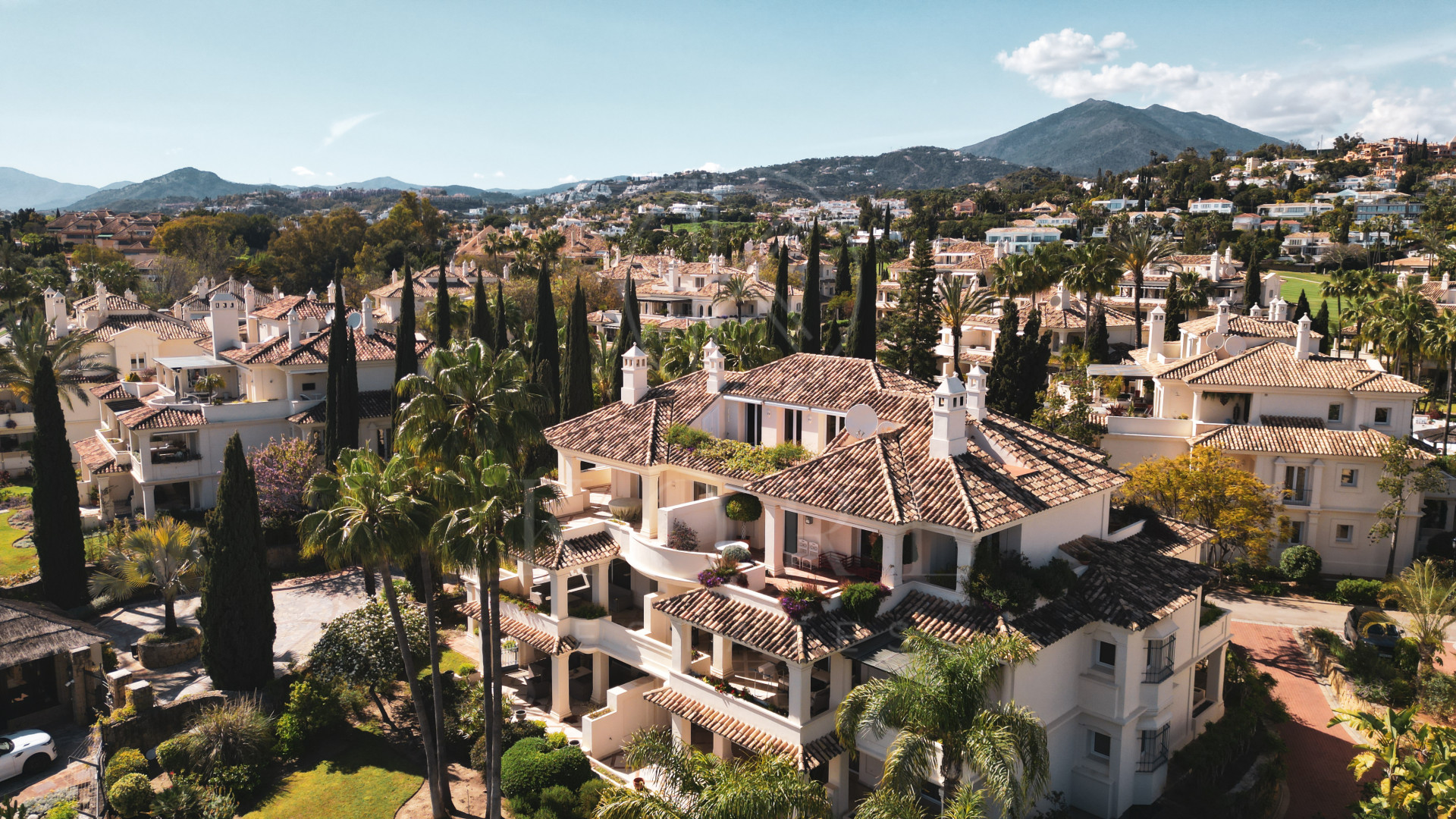 The spacious living and dining area leads to a front terrace with stunning panoramic views of the golf course and the sea, while the rear terrace provides serene vistas of La Concha Mountain, the landscaped gardens, and the pool.