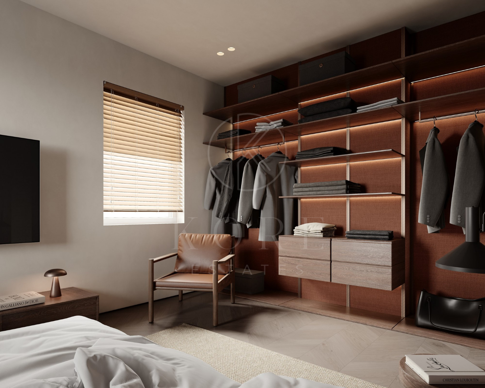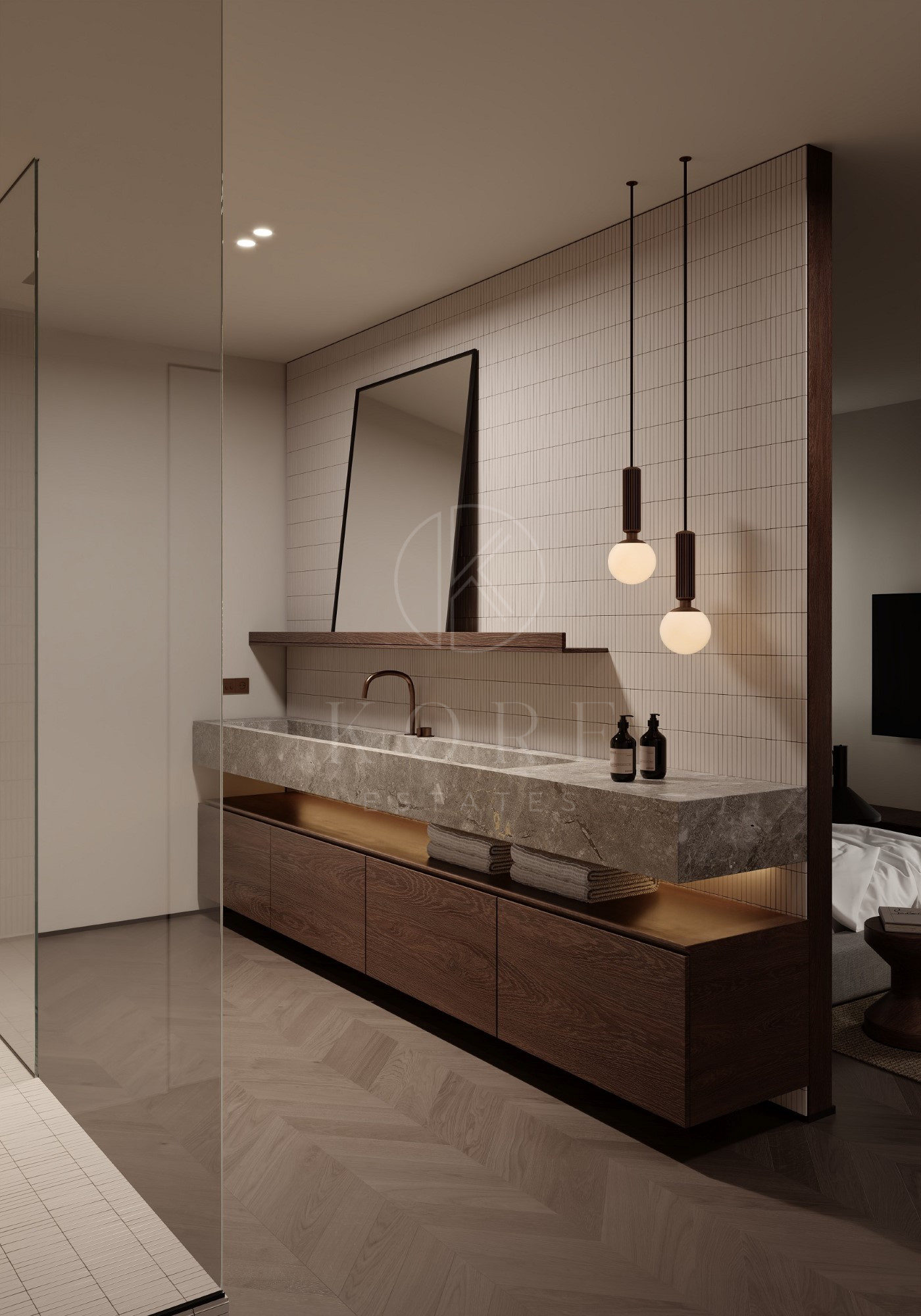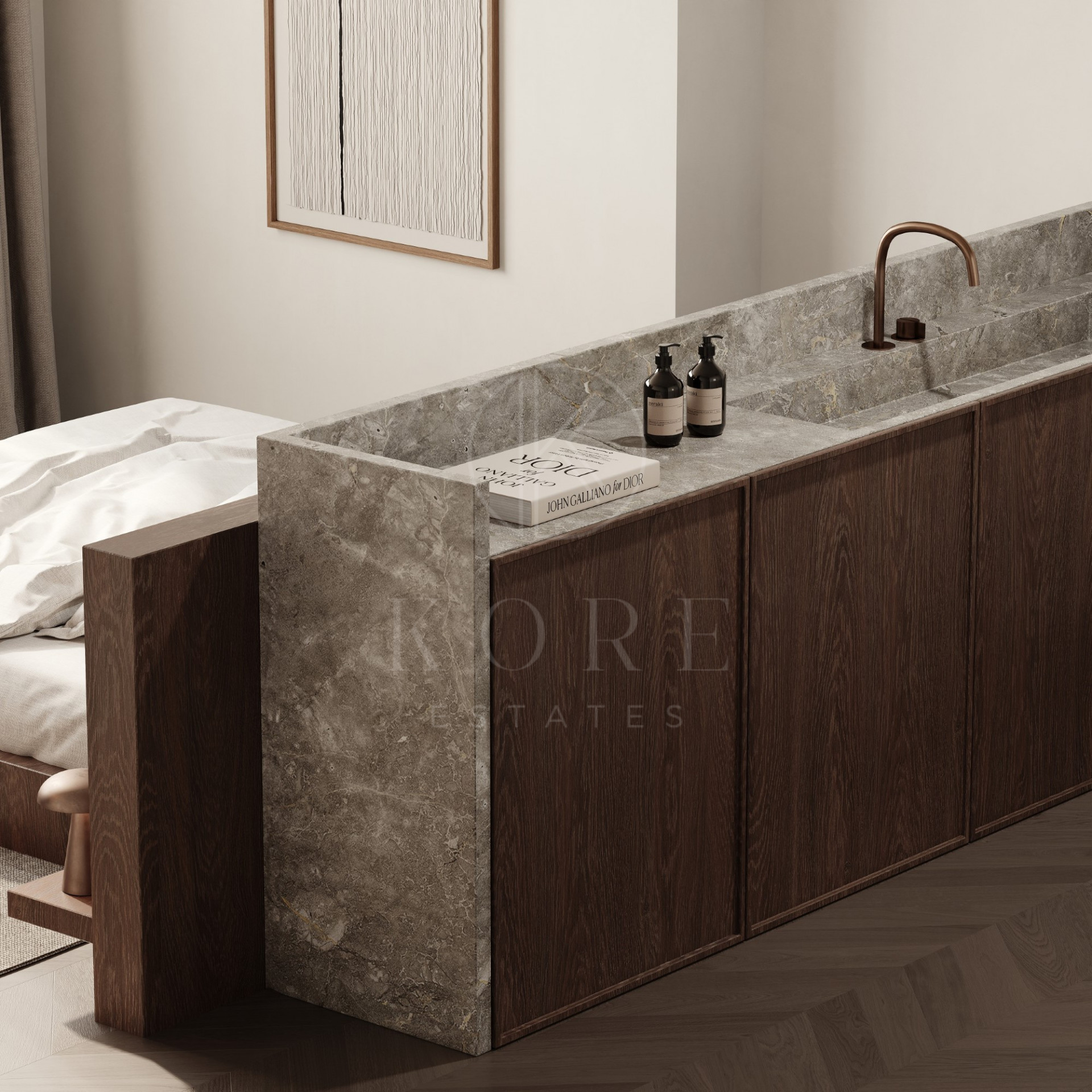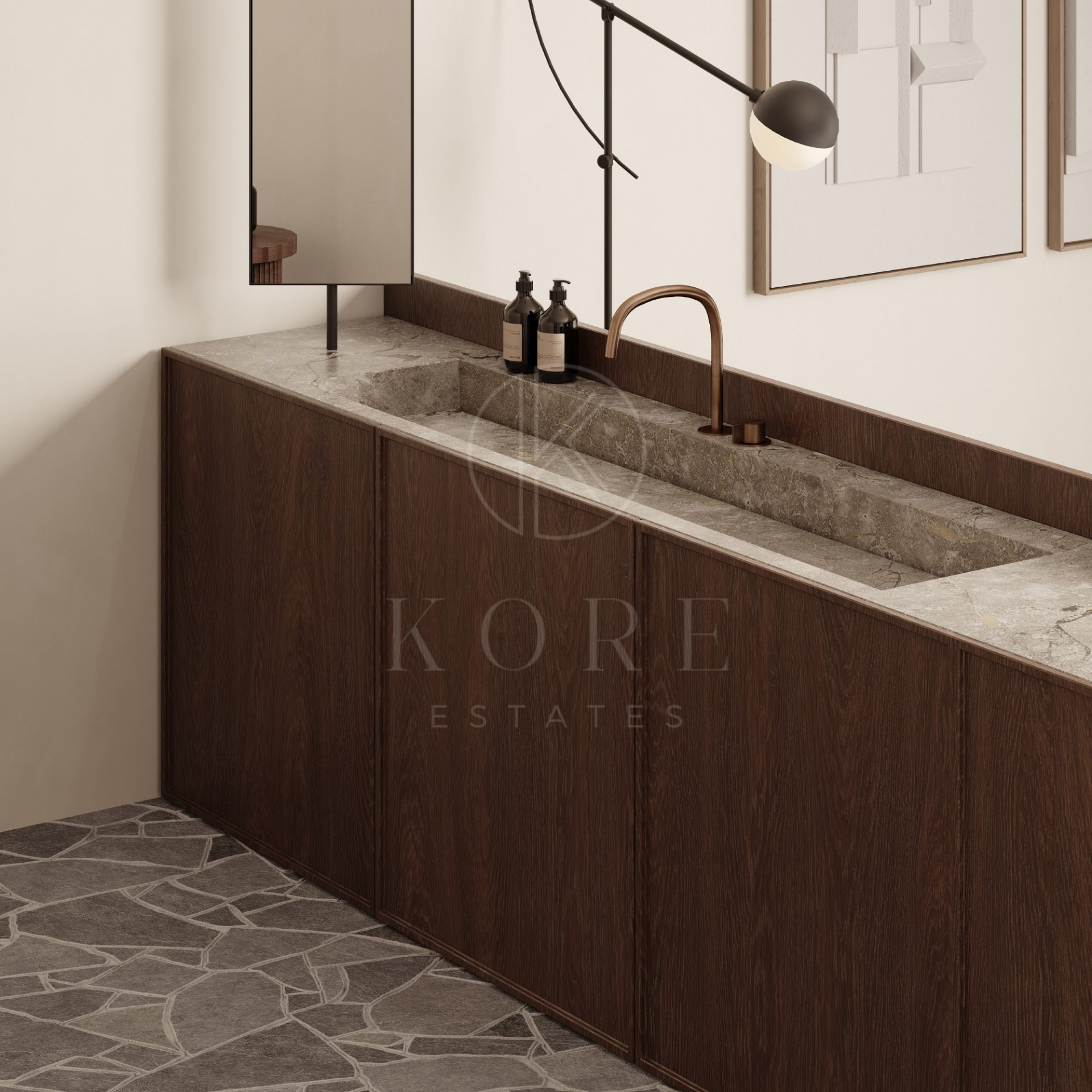 The selection of materials featured the rich allure of dark oak wood, the timeless charm of parquet flooring, complemented by small-format tiles and touches of olive and royal green.