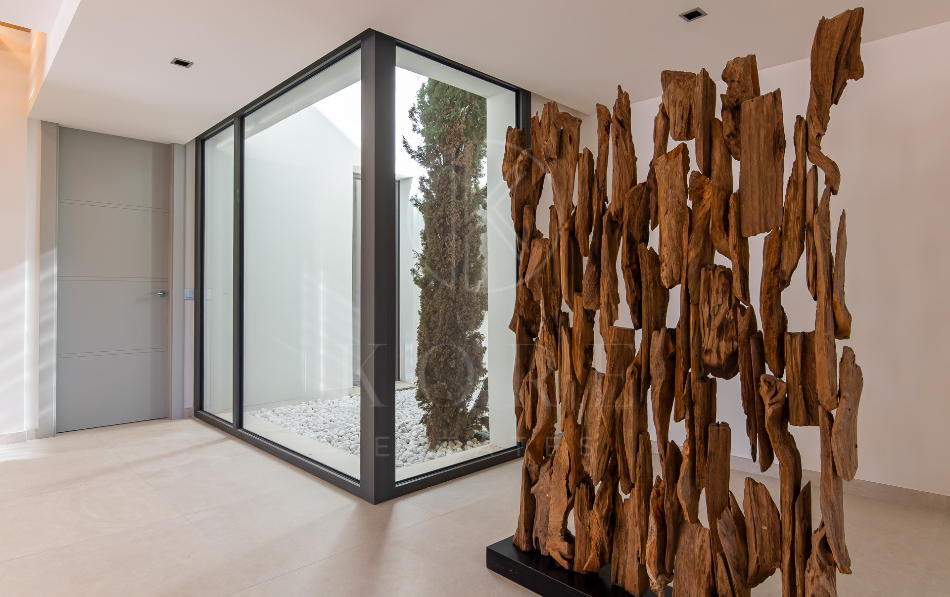 Up the wide timber stairs, you enter an open gallery area that connects the light-filled upper floor with the panoramic surroundings, perfect for an open-plan office or indoor chillout area. The main suite also enjoys panoramic views, a spacious ensuite bathroom and a secret balcony that overlooks the entrance and main lounge area. This level also offers two further bedroom suites all with private bathrooms, terraces and stunning views – perfect for a family or customised living quarters.