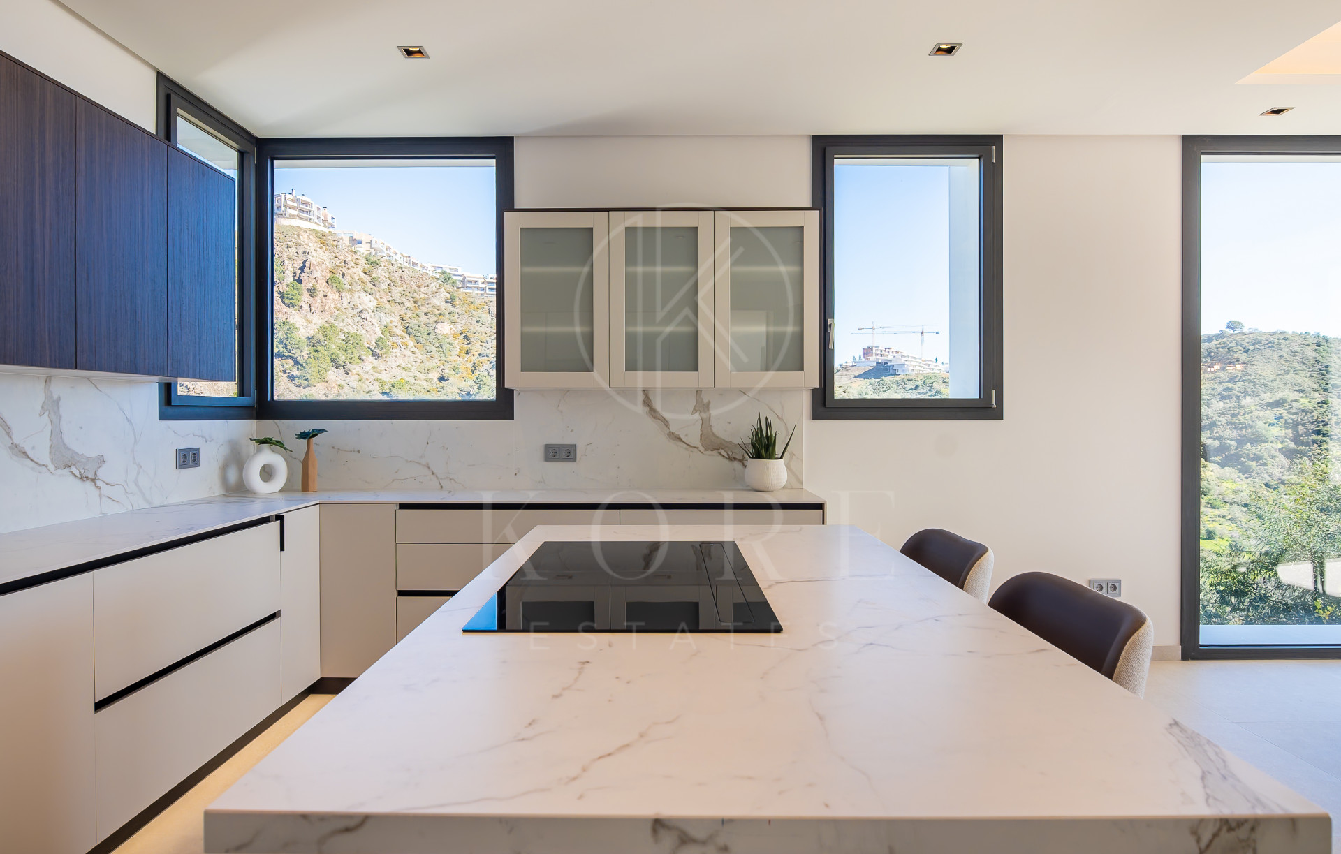Set on a 1,377m² plot, this 764m² home blends modern architecture, sophisticated living spaces, natural elements and outstanding customisation potential. You enter the house through a landscaped courtyard and an oversized timber pivot door into the main level that features two lounge areas with panoramic sea views, a fully equipped open-plan kitchen and dining area that looks both to the sea and mountains, plus two spacious guest bedrooms with ensuites and an aseo. The main living area features a fireplace and double height-ceiling that opens out onto the main terrace, where you can dine or relax by the saltwater infinity pool (with pre-installation for heating) and jacuzzi while enjoying panoramic views.