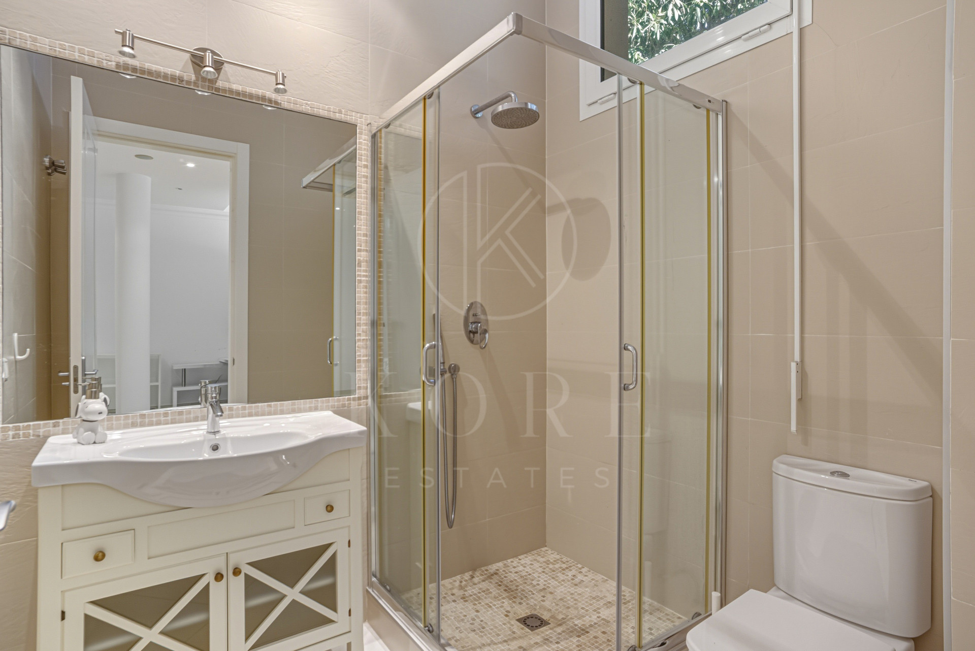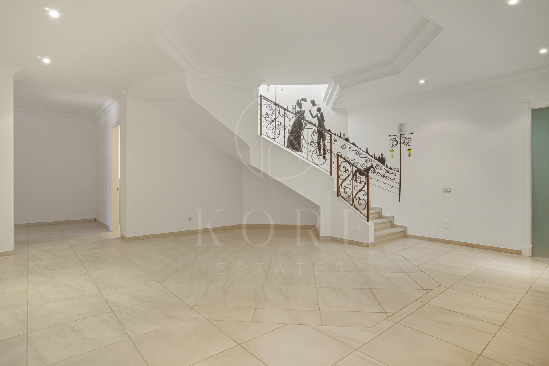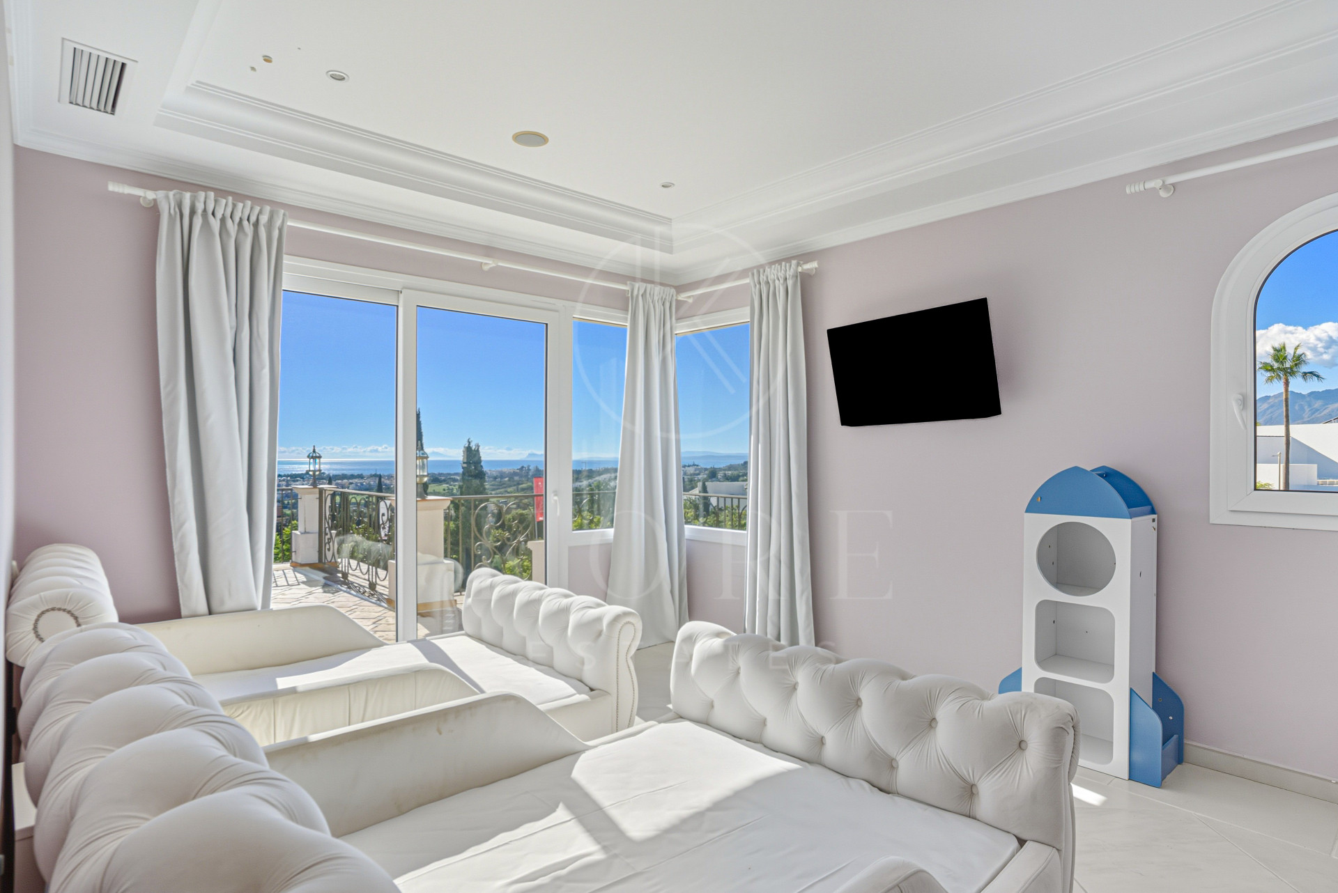 Exceptional eight-bedroom, south-facing villa located in the prestigious gated community of Los Flamingos, Benahavis, offering 24-hour security, a private garden, and a private pool, all within close proximity to amenities. Spanning four impressive levels, including a vast solarium with breathtaking panoramic sea views, this remarkable residence welcomes you with a grand entrance showcasing spectacular views. The villa features two elegant living rooms, a large kitchen with utility room, private garage for four cars, large driveway, and lift connecting all floors. The master suite boasts his and hers bathrooms and walk-in closets, while all three bedrooms on the first floor enjoy direct access to a spacious terrace overlooking the sea. Each bedroom is en suite, complemented by three additional guest toilets. The versatile lower level offers immense potential, with numerous adaptable rooms and independent access from the garage, making it ideal for creating a self-contained apartment. This extraordinary property offers a perfect blend of luxury, space, and endless possibilities.