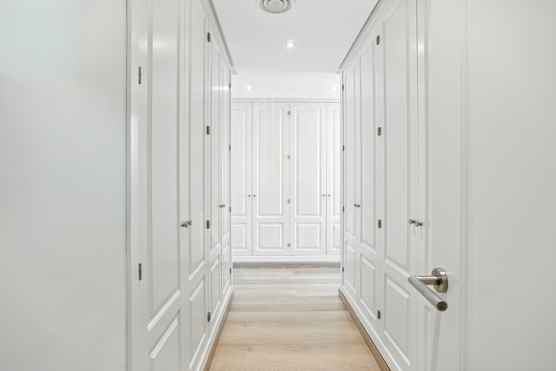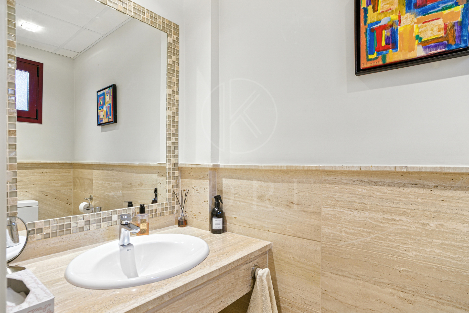 Beautiful semi-detached house in the prestigious community of Los Jaralillos, located in the sought after area of El Paraíso, Benahavís. Located near golf courses, this property offers an ideal combination of comfort, privacy and excellent location. This charming semi-detached house features a private garden and offers stunning sea views from several terraces. The main floor has a fully equipped kitchen, large living room, utility room, guest toilet and a large terrace with sea views, which offers direct access to the private garden, creating a perfect space to enjoy outdoors. On the upper floor are three rooms, one of them studio type, ideal as office, work room or additional bedroom. Two of the bedrooms have access to a terrace overlooking the sea. The master bedroom is en suite, and this floor also has an additional bathroom and a small living room.The solarium floor offers a generous terrace, perfect for sunbathing or enjoying panoramic views. The basement houses the machine room and a multipurpose room, as well as direct access to the parking lot, which provides great comfort. The property is located within a gated community, with very well maintained gardens and three communal swimming pools. Additional features include wooden floors, air conditioning, parking space and solar panels, providing energy efficiency and sustainability. This townhouse perfectly combines comfort, privacy and a privileged location, ideal both as usual residence and holiday home.