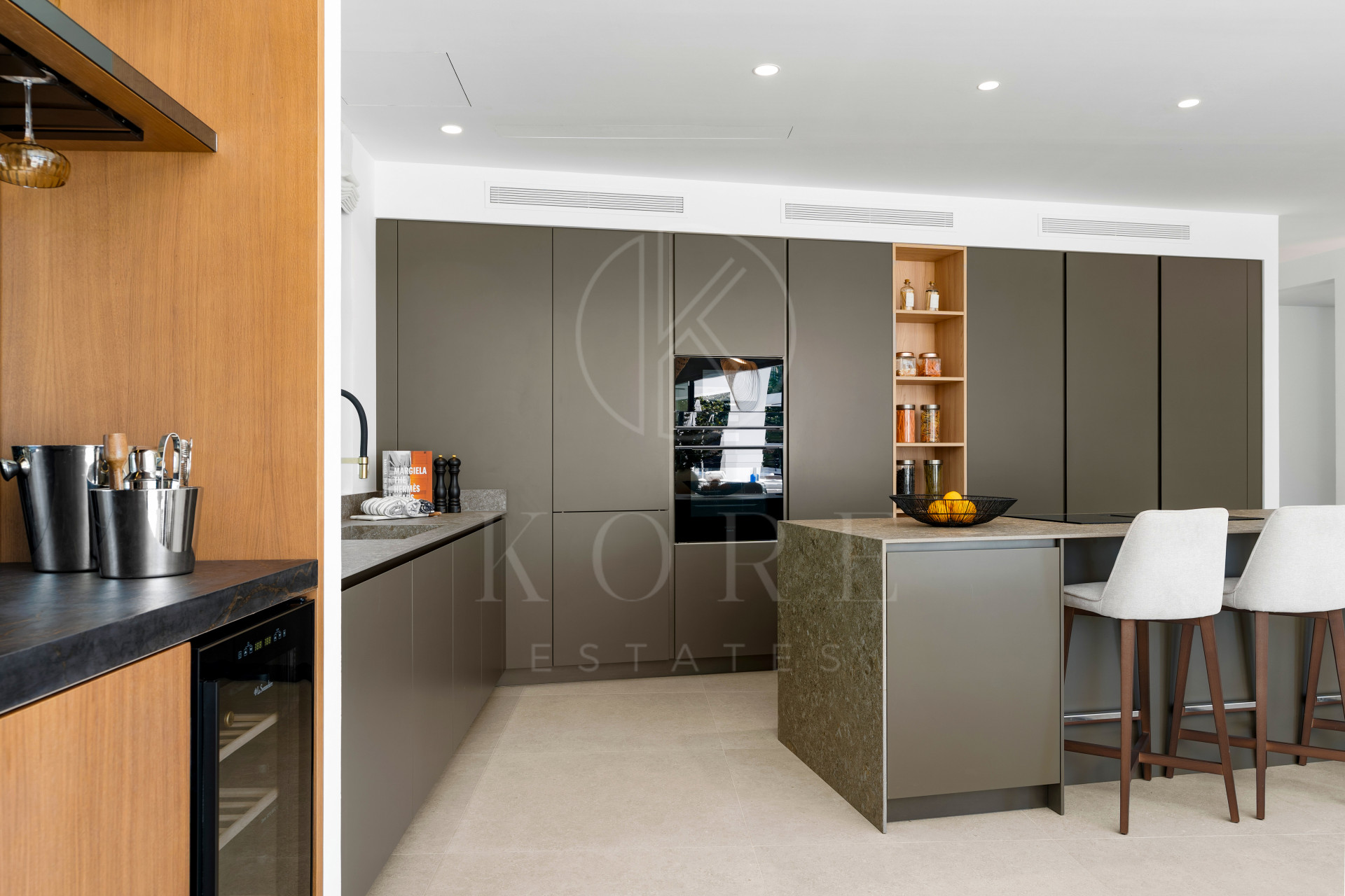 The villa features six bedrooms and impressive 3.5-metre ceilings on the main living level, creating an immediate sense of openness and depth. A spacious open-plan living and kitchen area connects directly to the pool and outdoor entertainment spaces, reinforcing the lifestyle appeal that defines a high-end villa in Marbella. The sleek modern kitchen is fully equipped with integrated Siemens appliances, extensive storage and a stylish dry bar with two wine fridges.