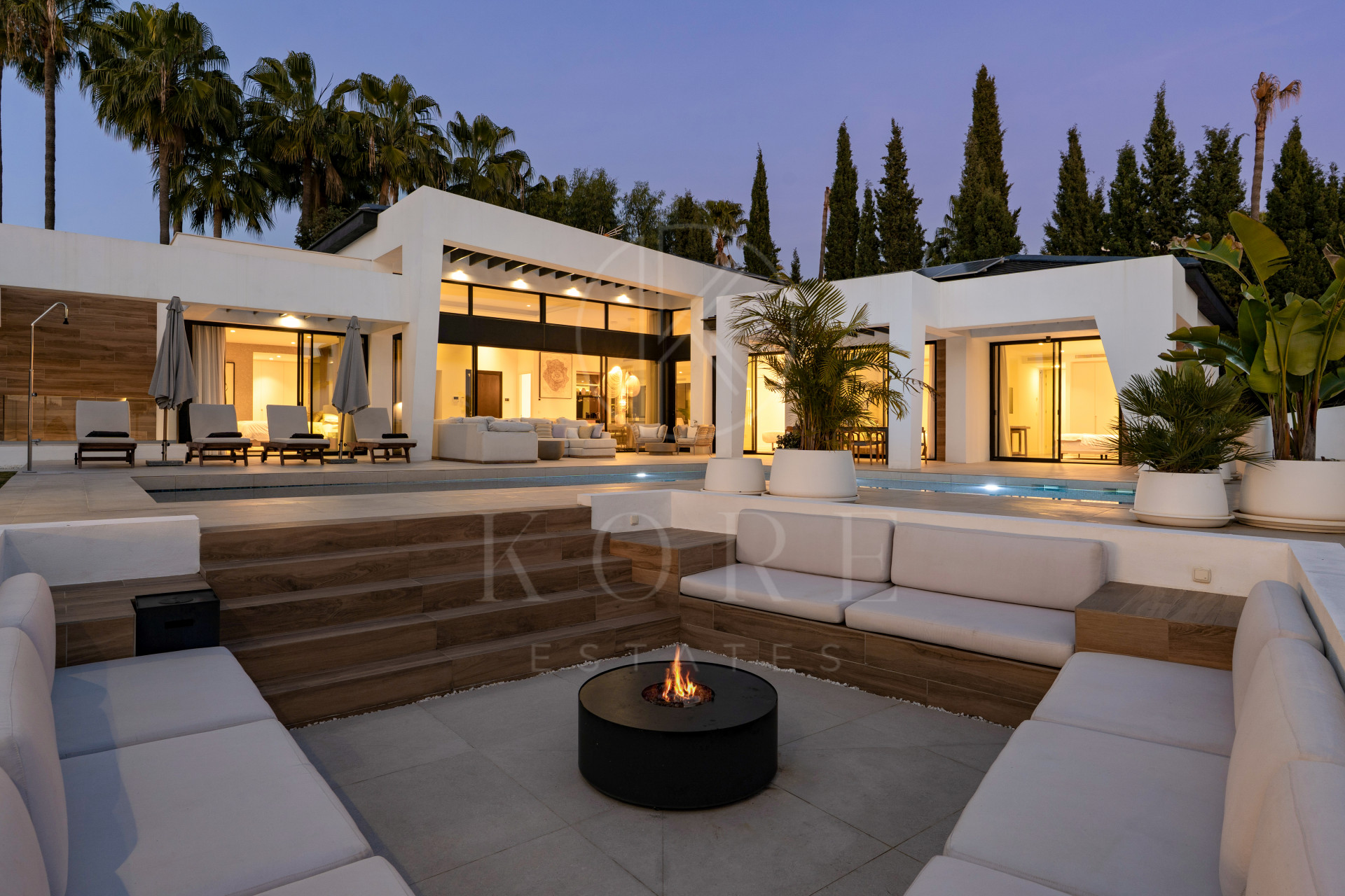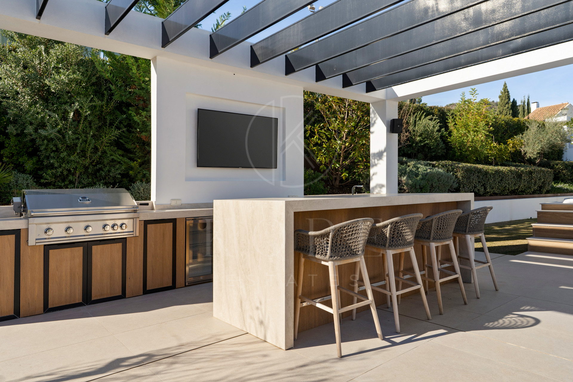 Outdoor living is a key highlight, with expansive terraces surrounding the swimming pool, a large sunken fire-pit seating area, a jacuzzi, and a fully equipped outdoor kitchen complete with grill, fridges, storage, and a waterproof TV. This creates an ideal setting for entertaining and enjoying Marbella’s year-round climate.