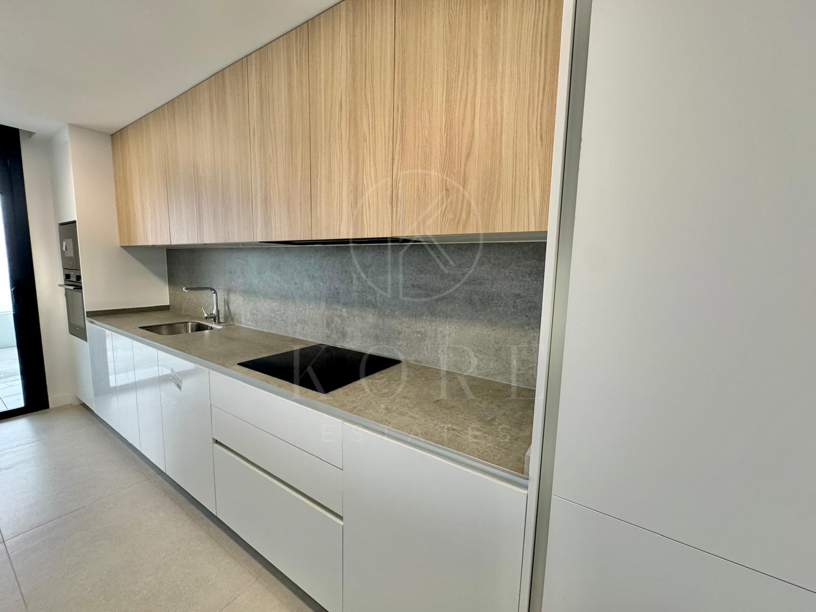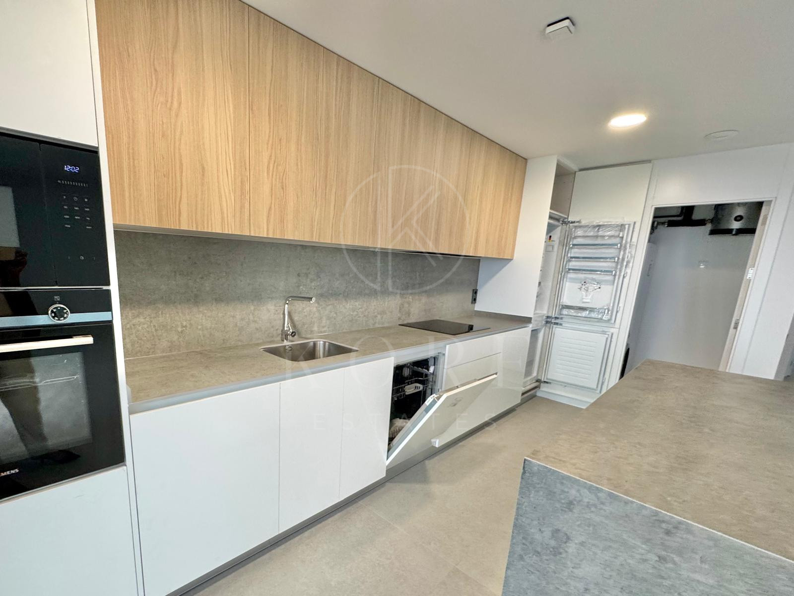 The open-plan kitchen is fully equipped with an oven, microwave, dishwasher, and an aerothermal system that ensures high energy efficiency, reducing electricity consumption by up to 80%.