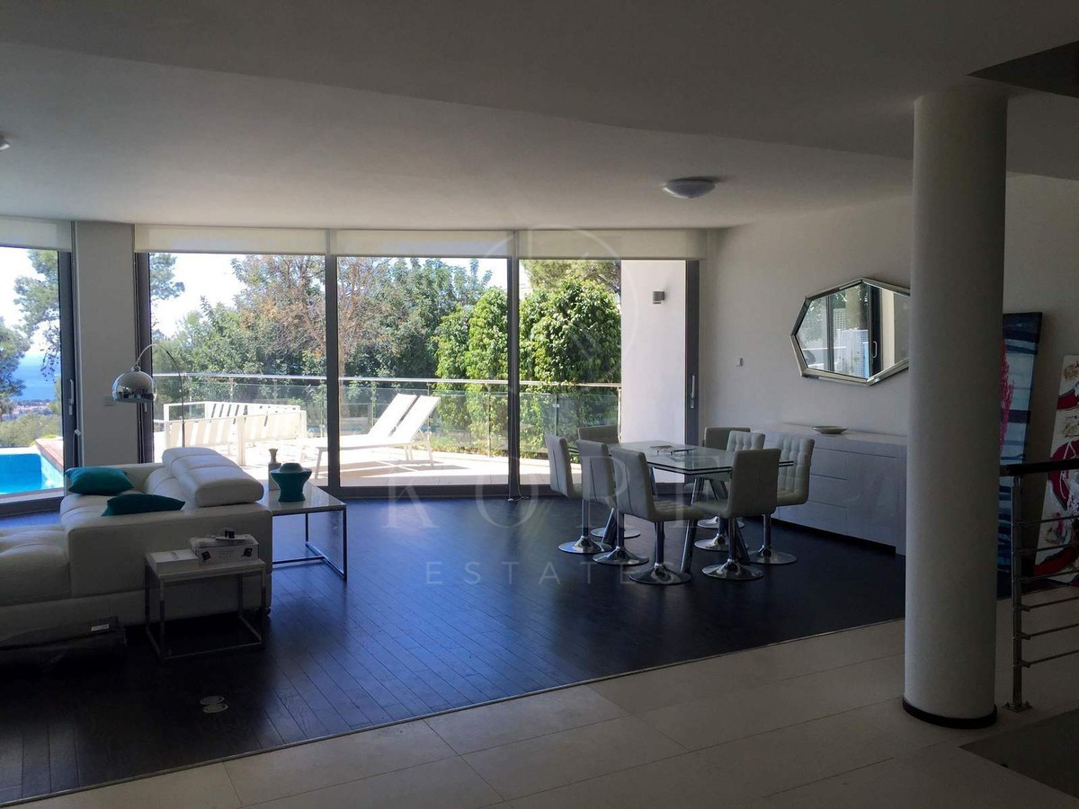The home stands out for its spacious layout, natural light and contemporary design. It features four bedrooms, each with its own en-suite bathroom equipped with a hydromassage bathtub and separate shower, as well as a guest toilet. The large open-plan living area connects seamlessly with a modern kitchen and leads out to the private garden, where a beautiful pool creates the perfect space to relax throughout the year. Two additional terraces offer ideal spots to enjoy the panoramic views, and the property includes a private garage for two cars.