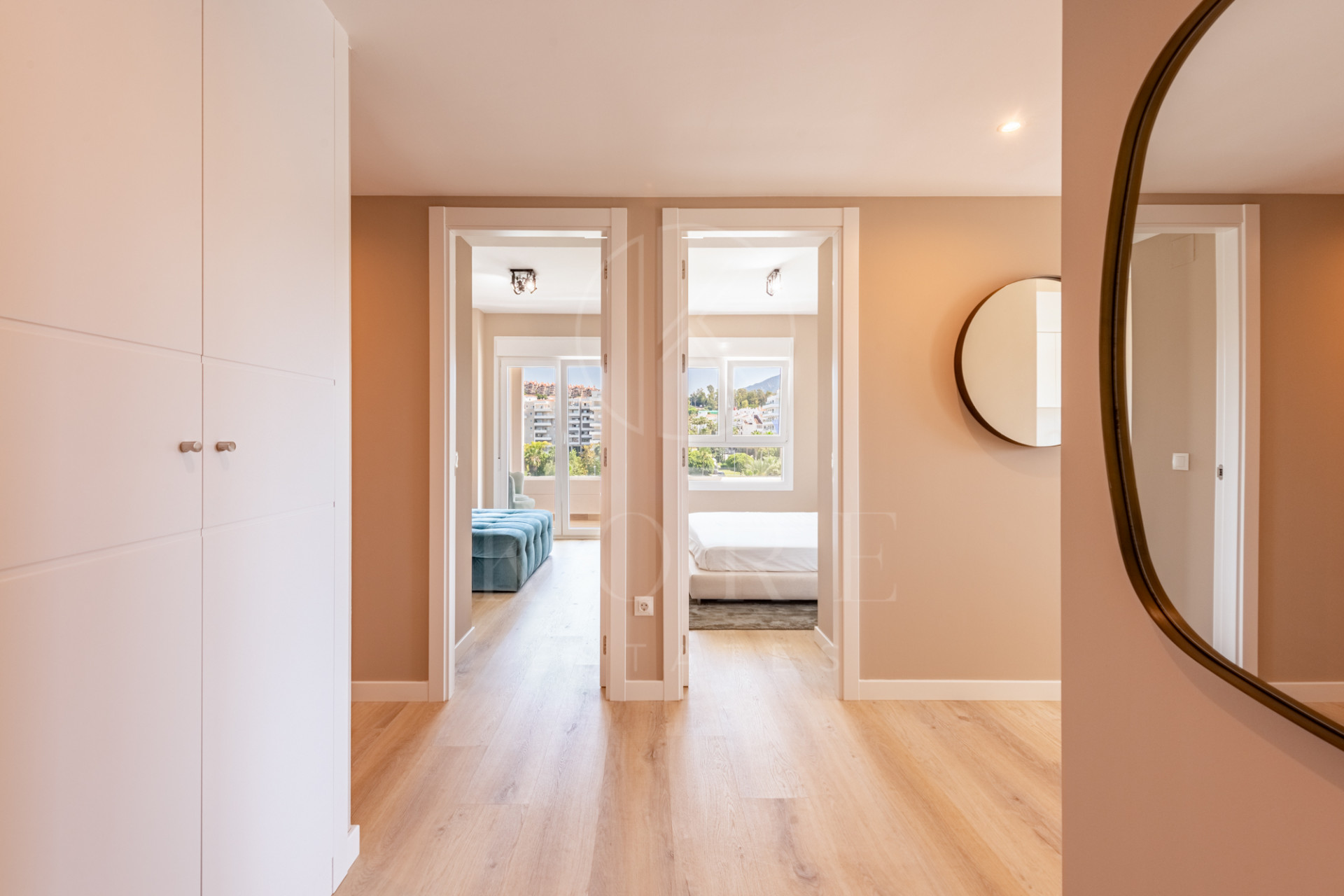 This brand new, never-before-occupied apartment is situated in the prestigious area of Nueva Andalucia, Marbella, Malaga, embodying both luxury and convenience on the renowned Costa Del Sol. Offering three bedrooms and two bathrooms, including an en-suite, this property is designed for modern living and is fully furnished to high standards, making it ready for immediate occupancy. The apartment enjoys a privileged corner position, ensuring abundant natural light throughout, and boasts impressive mountain, city, and partial sea views from its multiple terraces.