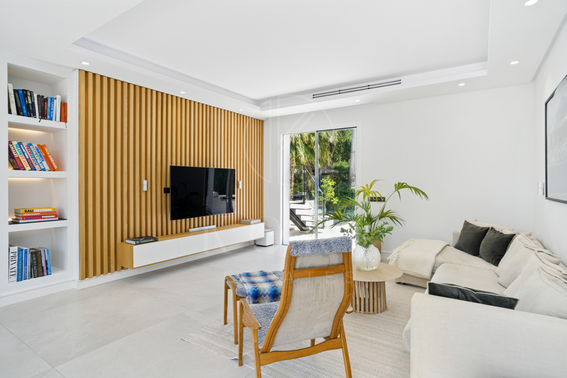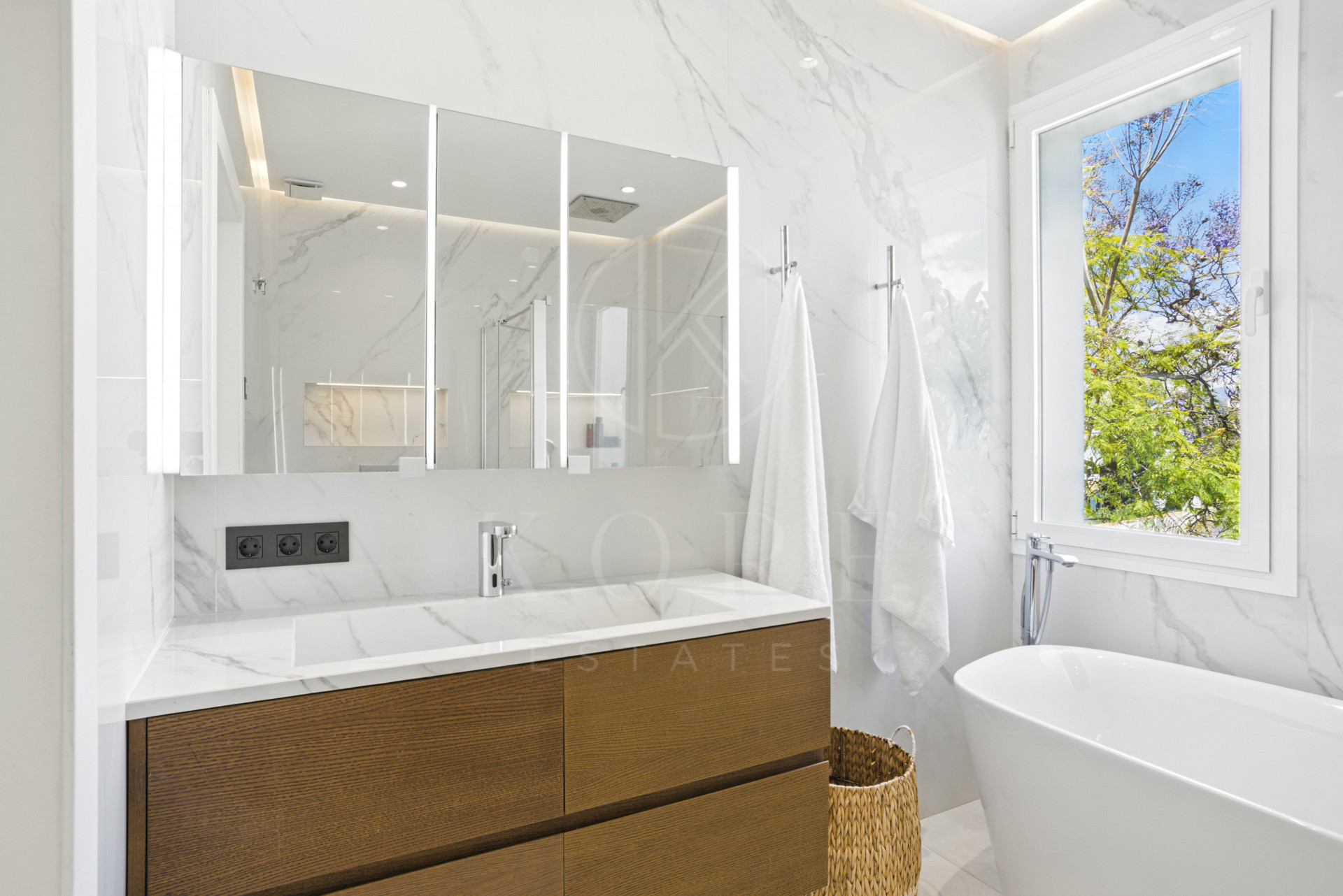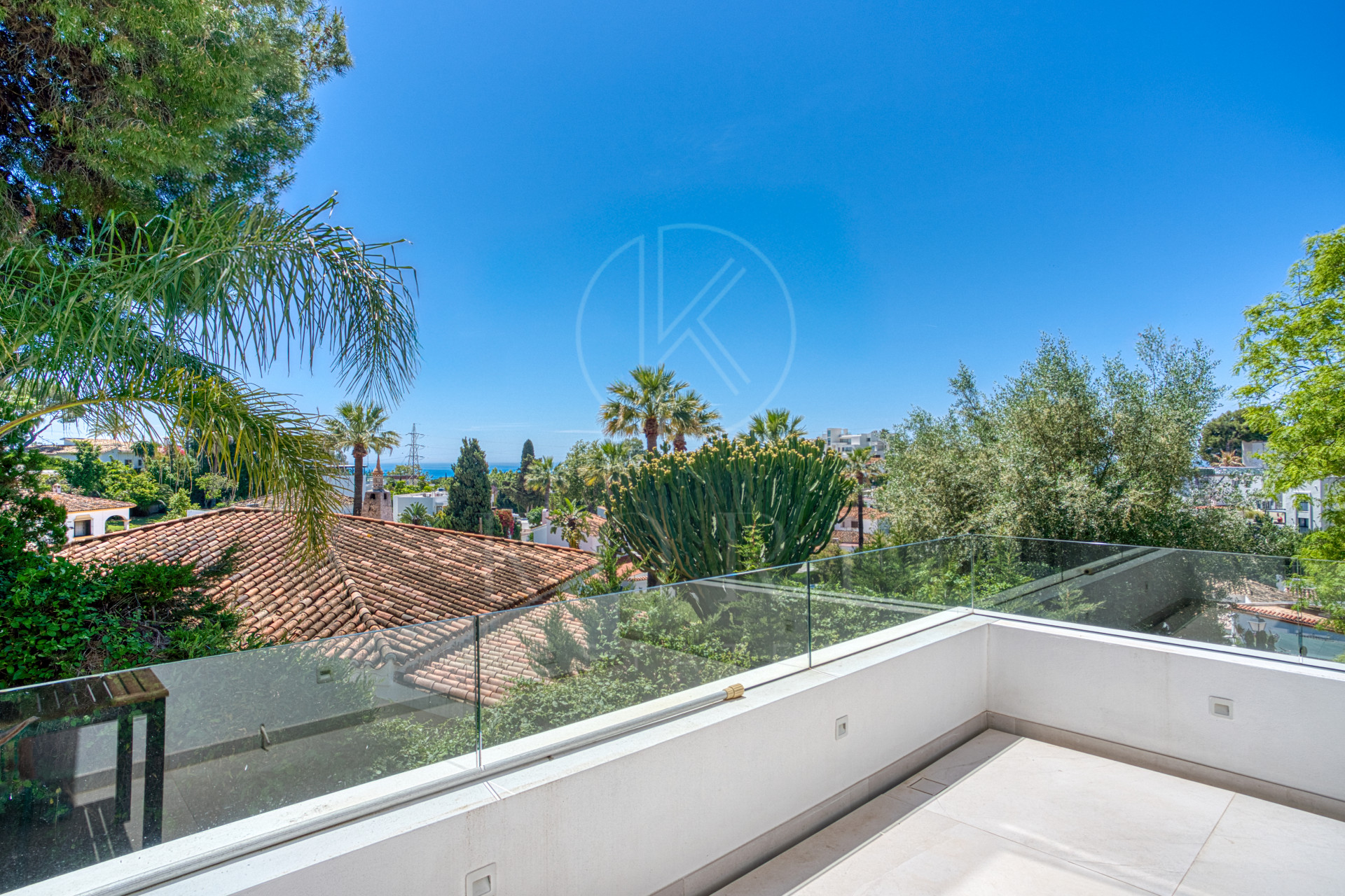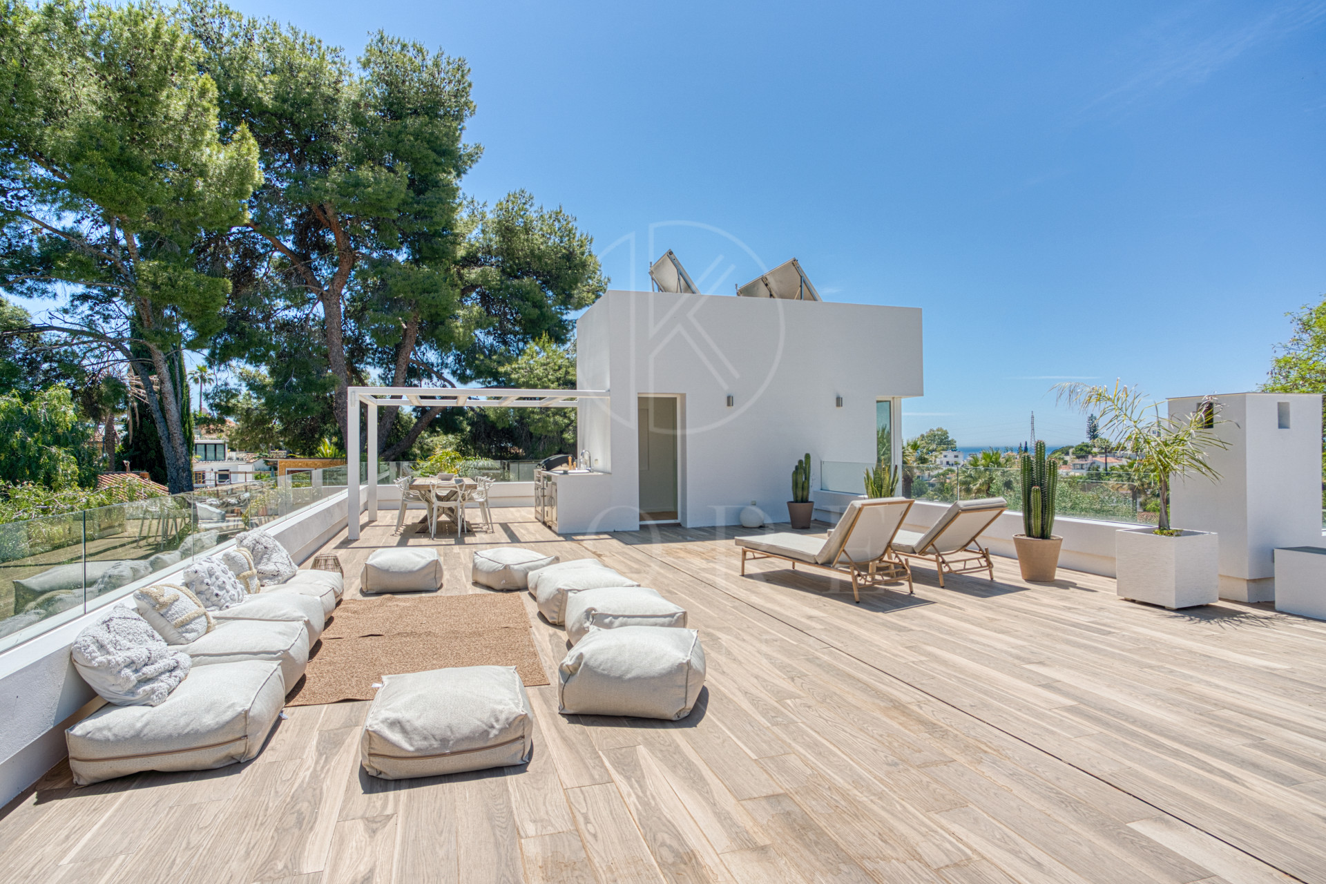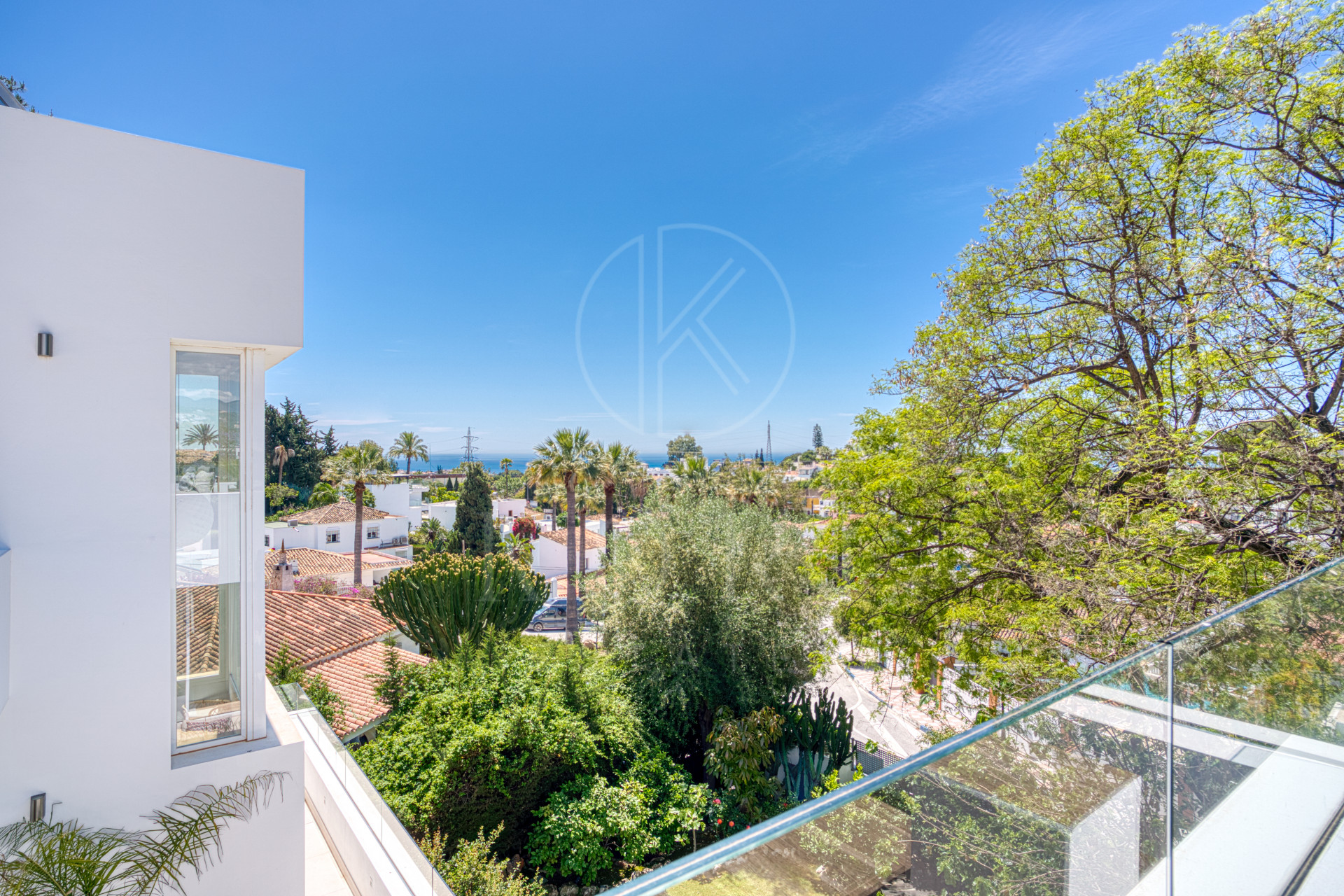 Modern, south facing six bedroom villa with sea views located in Nueva Andalucia, Marbella. Situated in a quiet and desirable area of lower Nueva Andalucía, this fully renovated contemporary villa offers a unique blend of luxury, comfort, and versatility. Designed with modern living in mind, the property includes six spacious bedrooms across the main house and a private guest house with a separate entrance, ideal for visitors. The villa features bright open-plan living areas, a high-spec kitchen, and a master suite with a walk-in closet and en-suite bathroom. Outdoor amenities include a heated saltwater pool, jacuzzi, gym area, and beautifully landscaped gardens, perfect for relaxing or entertaining. A newly added upper floor and rooftop solarium provide sweeping sea views, while the closed garage and additional parking for two cars add convenience. Just a short walk from local shops, restaurants, and everyday essentials, this home is equally suited as a stylish family residence or a smart investment property.