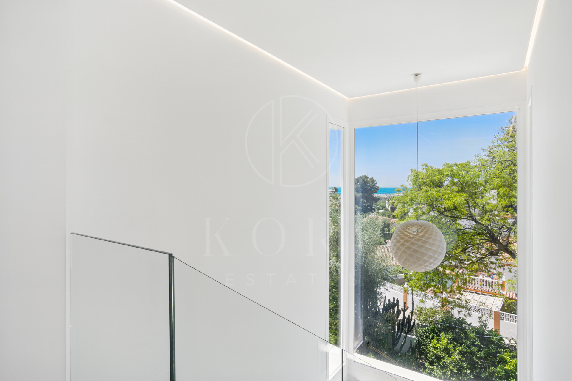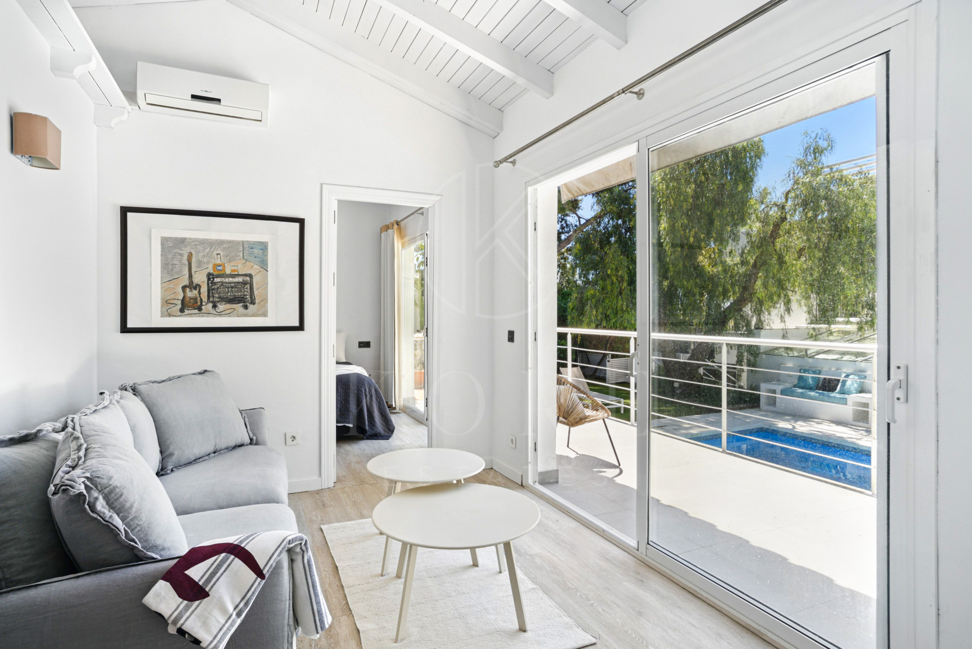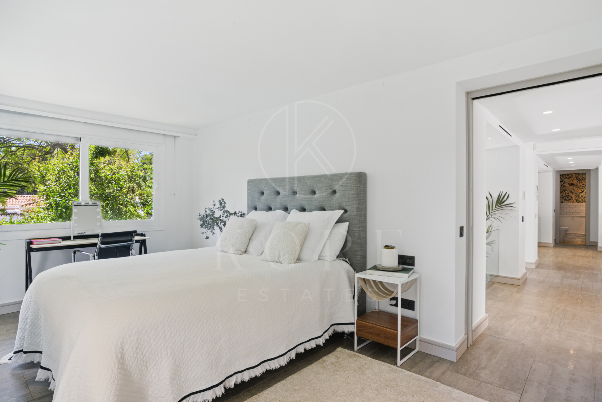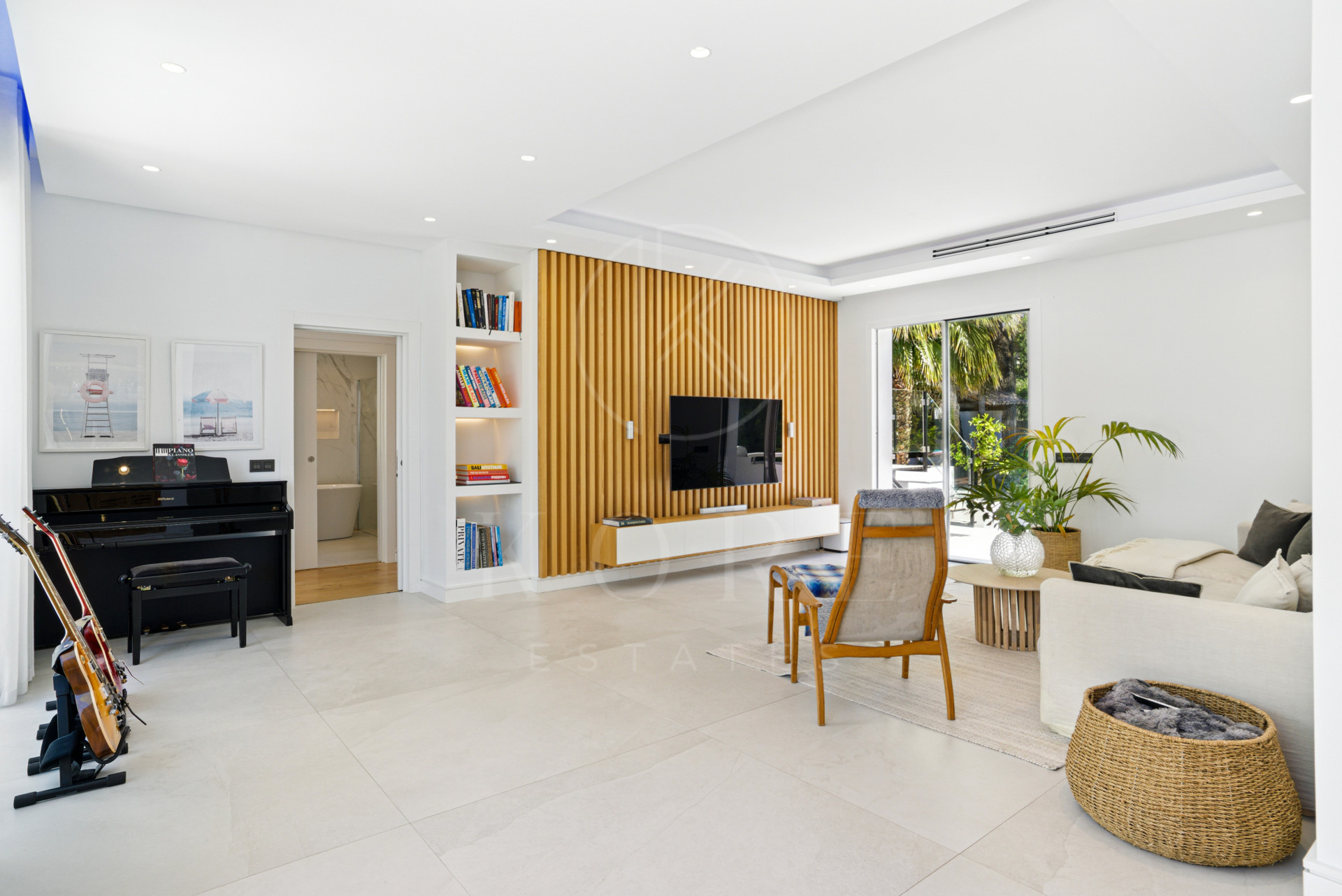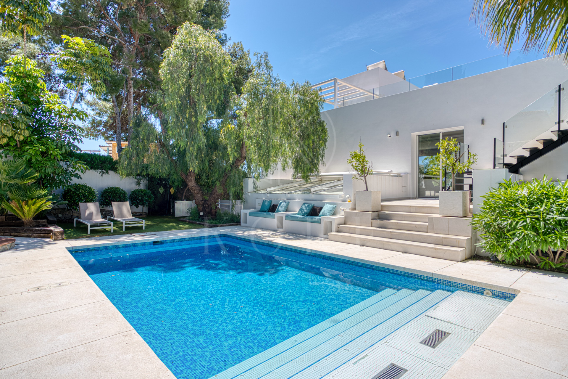 Modern, south facing six bedroom villa with sea views located in Nueva Andalucia, Marbella. Situated in a quiet and desirable area of lower Nueva Andalucía, this fully renovated contemporary villa offers a unique blend of luxury, comfort, and versatility. Designed with modern living in mind, the property includes six spacious bedrooms across the main house and a private guest house with a separate entrance, ideal for visitors. The villa features bright open-plan living areas, a high-spec kitchen, and a master suite with a walk-in closet and en-suite bathroom. Outdoor amenities include a heated saltwater pool, jacuzzi, gym area, and beautifully landscaped gardens, perfect for relaxing or entertaining. A newly added upper floor and rooftop solarium provide sweeping sea views, while the closed garage and additional parking for two cars add convenience. Just a short walk from local shops, restaurants, and everyday essentials, this home is equally suited as a stylish family residence or a smart investment property.