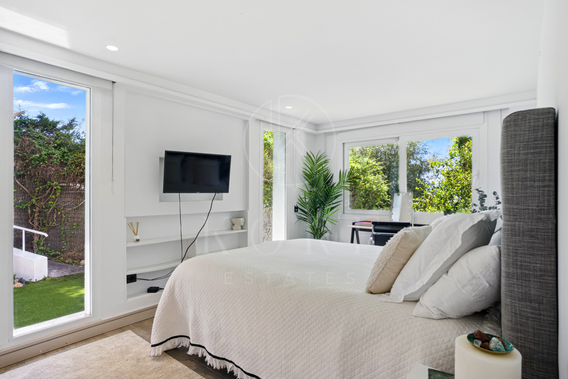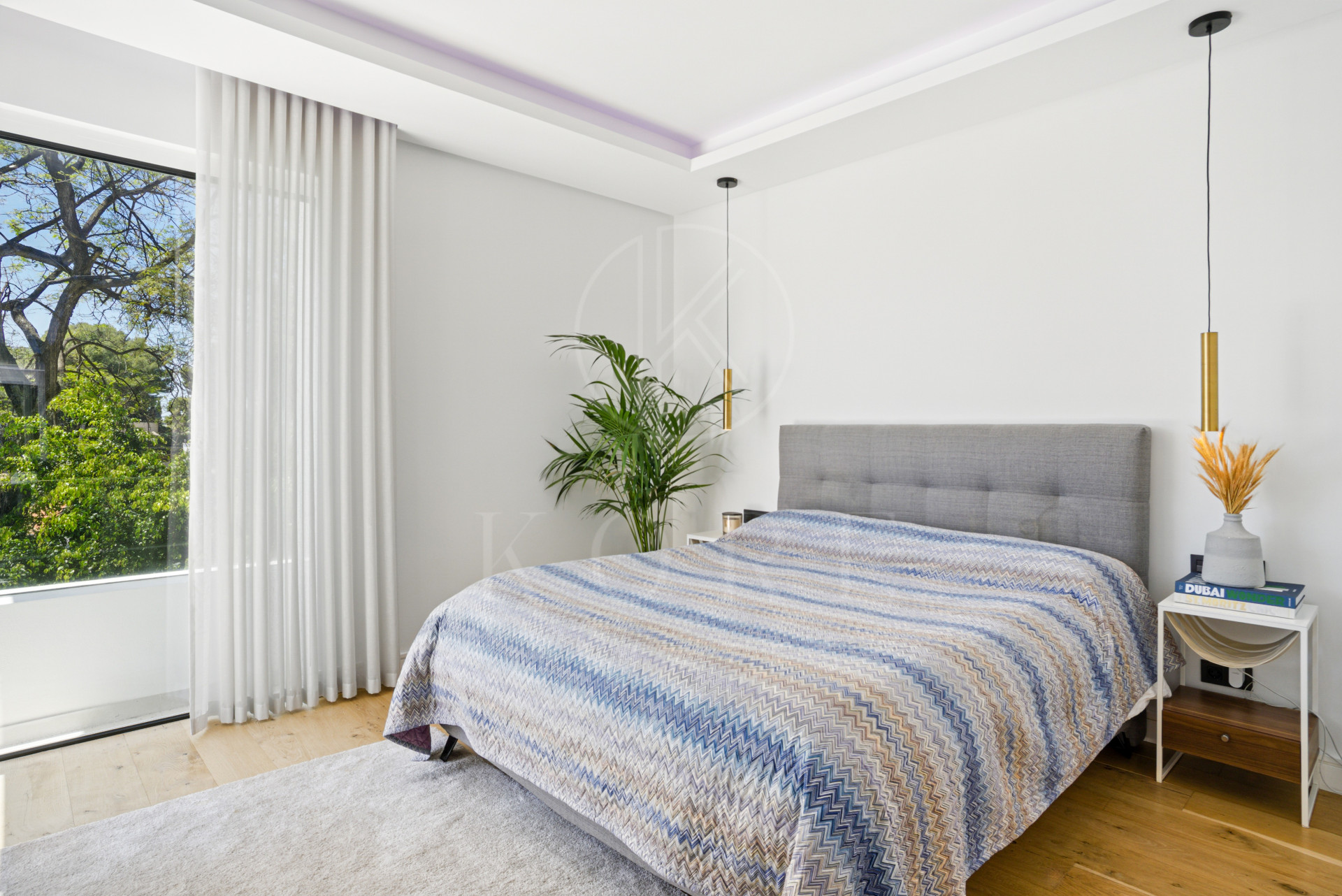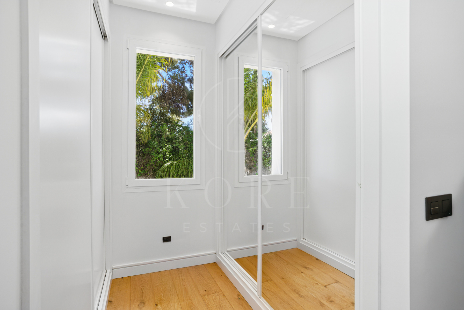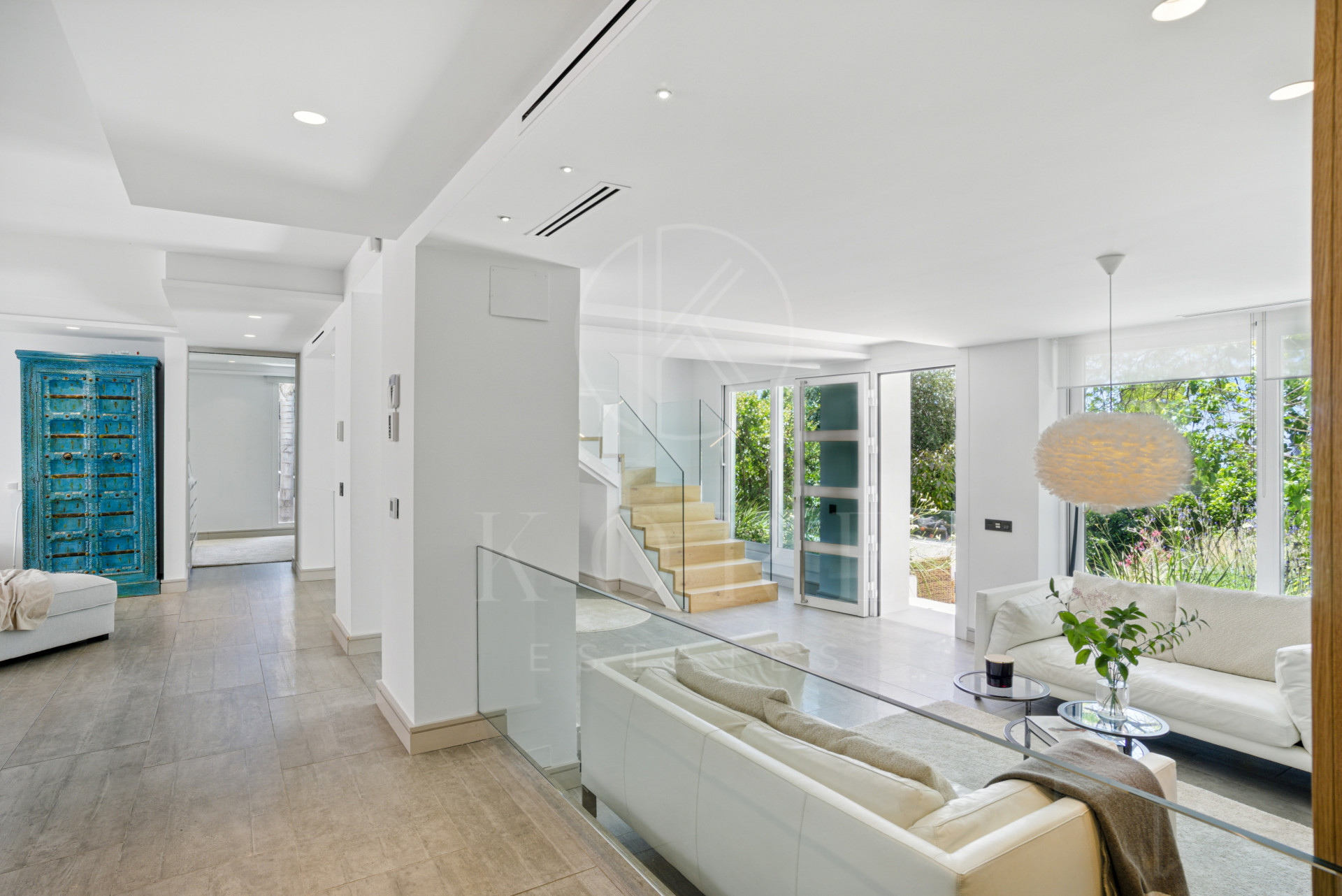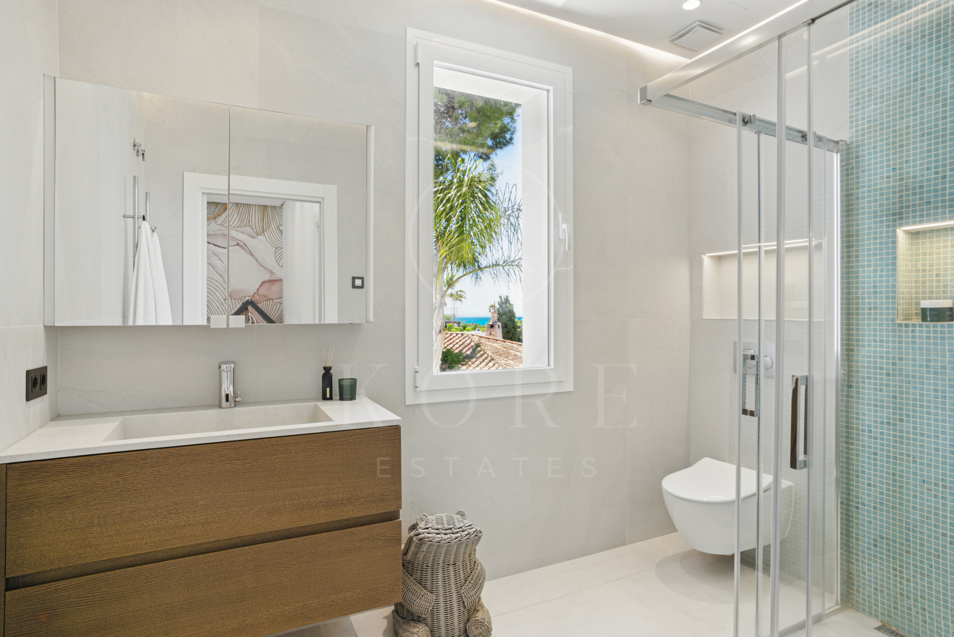 Modern, south facing six bedroom villa with sea views located in Nueva Andalucia, Marbella. Situated in a quiet and desirable area of lower Nueva Andalucía, this fully renovated contemporary villa offers a unique blend of luxury, comfort, and versatility. Designed with modern living in mind, the property includes six spacious bedrooms across the main house and a private guest house with a separate entrance, ideal for visitors. The villa features bright open-plan living areas, a high-spec kitchen, and a master suite with a walk-in closet and en-suite bathroom. Outdoor amenities include a heated saltwater pool, jacuzzi, gym area, and beautifully landscaped gardens, perfect for relaxing or entertaining. A newly added upper floor and rooftop solarium provide sweeping sea views, while the closed garage and additional parking for two cars add convenience. Just a short walk from local shops, restaurants, and everyday essentials, this home is equally suited as a stylish family residence or a smart investment property.