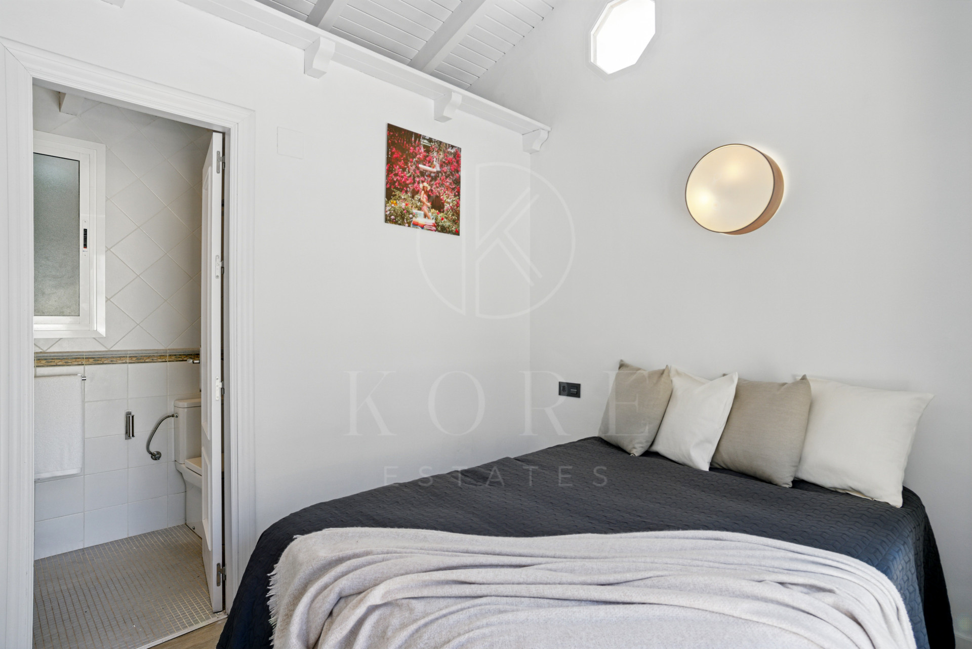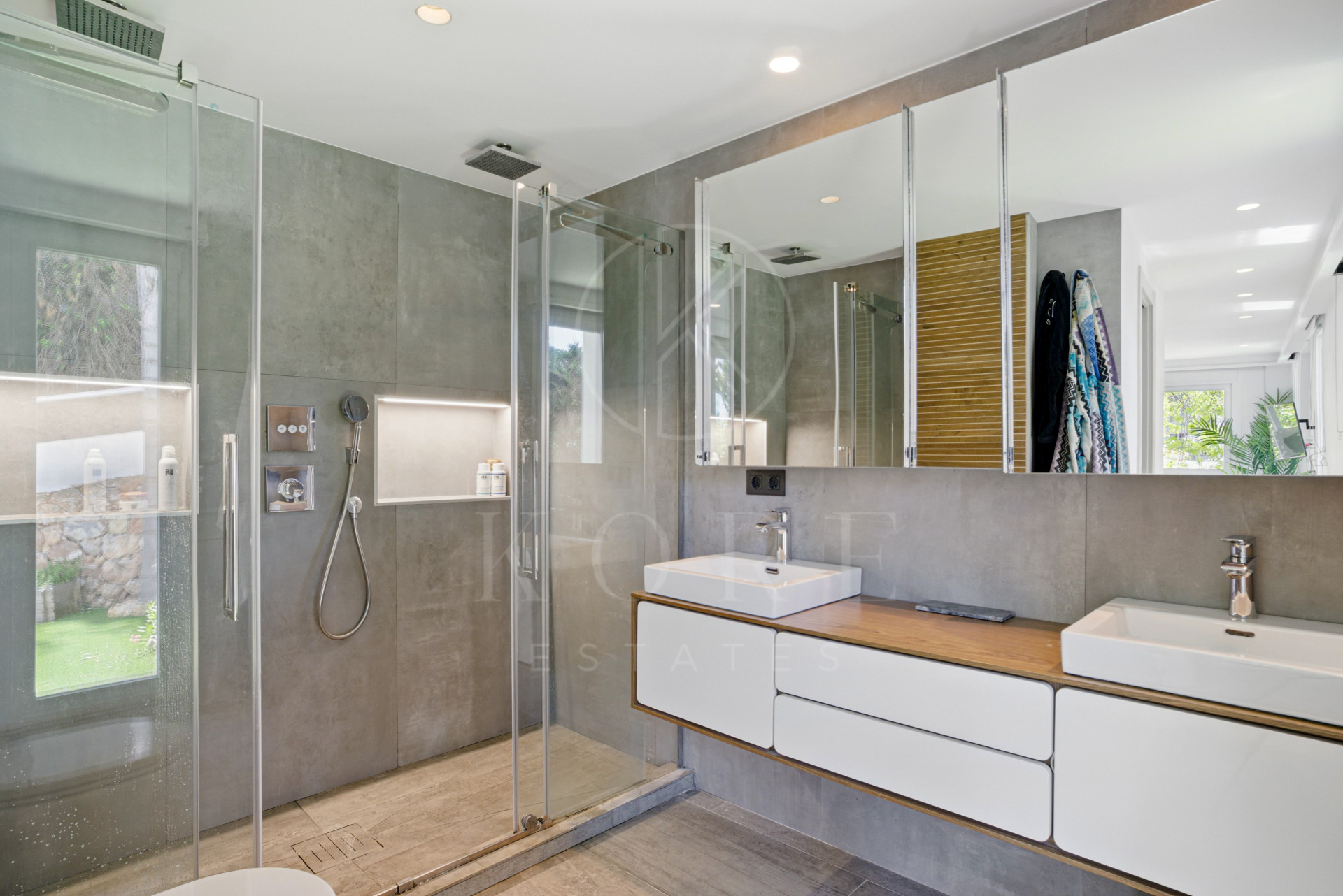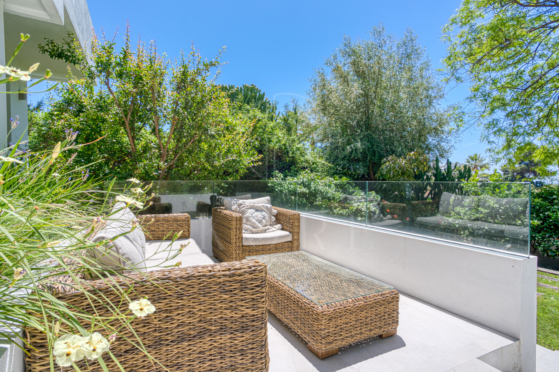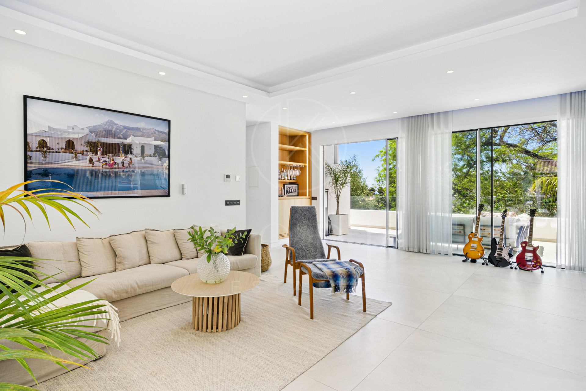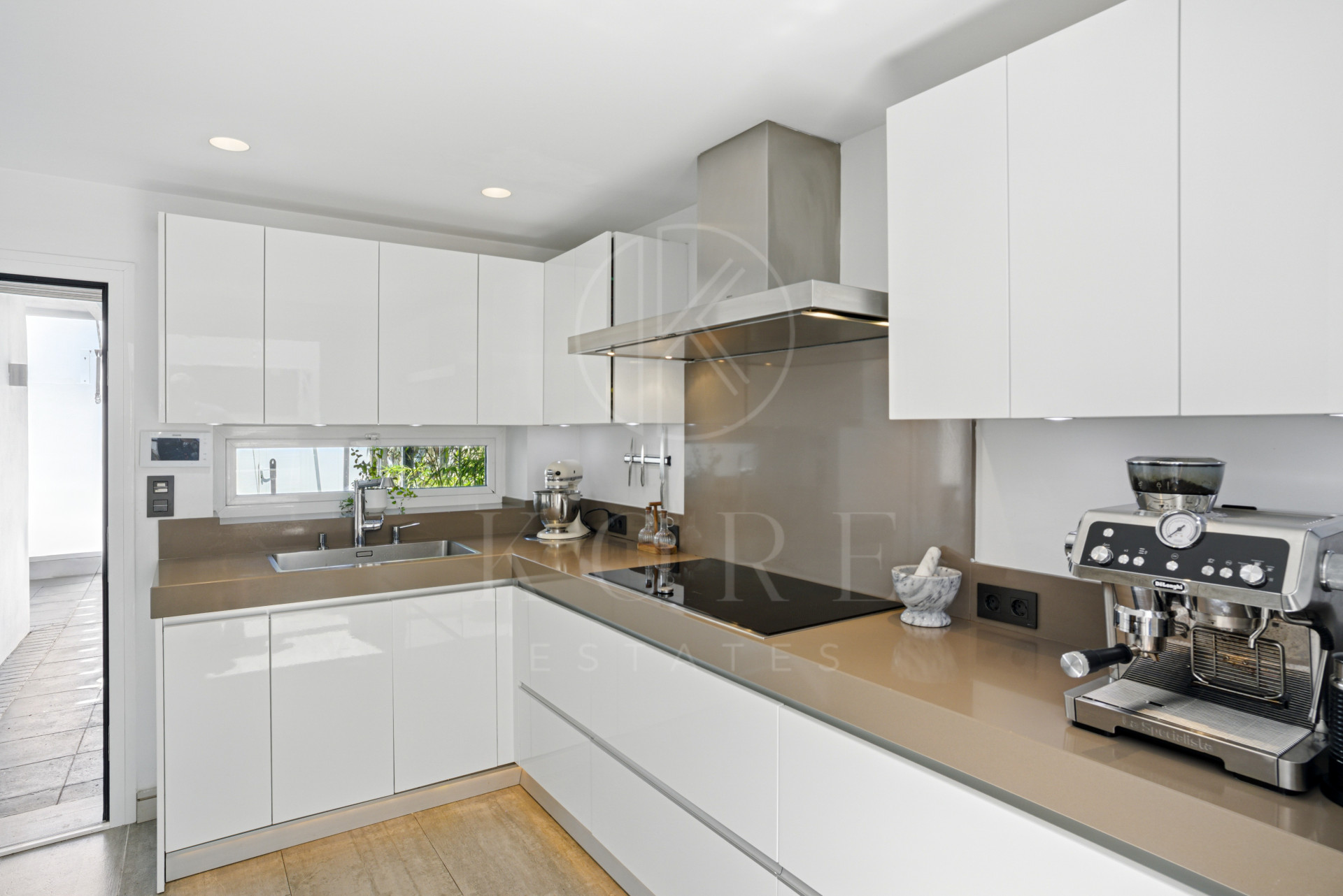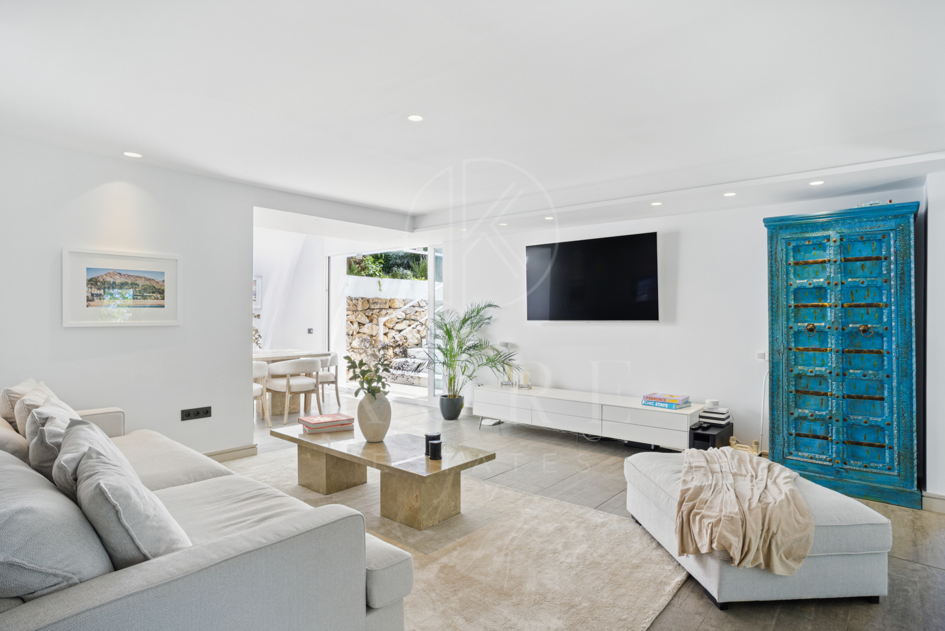Modern, south facing six bedroom villa with sea views located in Nueva Andalucia, Marbella. Situated in a quiet and desirable area of lower Nueva Andalucía, this fully renovated contemporary villa offers a unique blend of luxury, comfort, and versatility. Designed with modern living in mind, the property includes six spacious bedrooms across the main house and a private guest house with a separate entrance, ideal for visitors. The villa features bright open-plan living areas, a high-spec kitchen, and a master suite with a walk-in closet and en-suite bathroom. Outdoor amenities include a heated saltwater pool, jacuzzi, gym area, and beautifully landscaped gardens, perfect for relaxing or entertaining. A newly added upper floor and rooftop solarium provide sweeping sea views, while the closed garage and additional parking for two cars add convenience. Just a short walk from local shops, restaurants, and everyday essentials, this home is equally suited as a stylish family residence or a smart investment property.