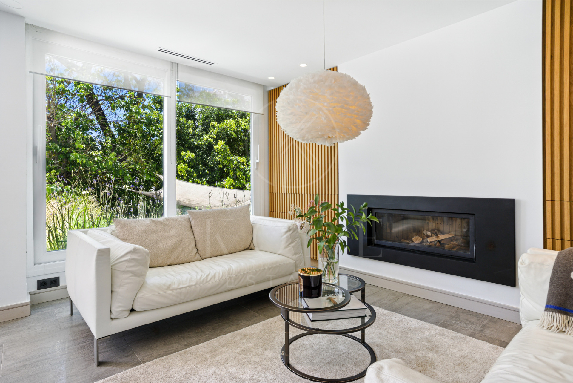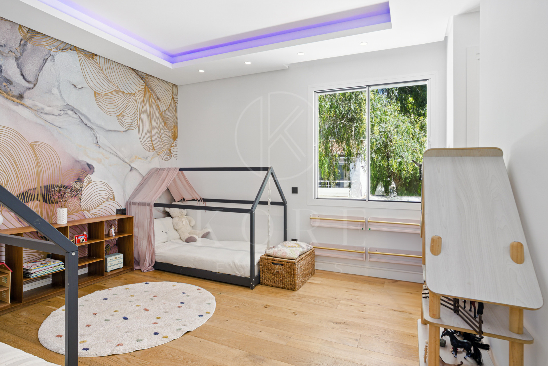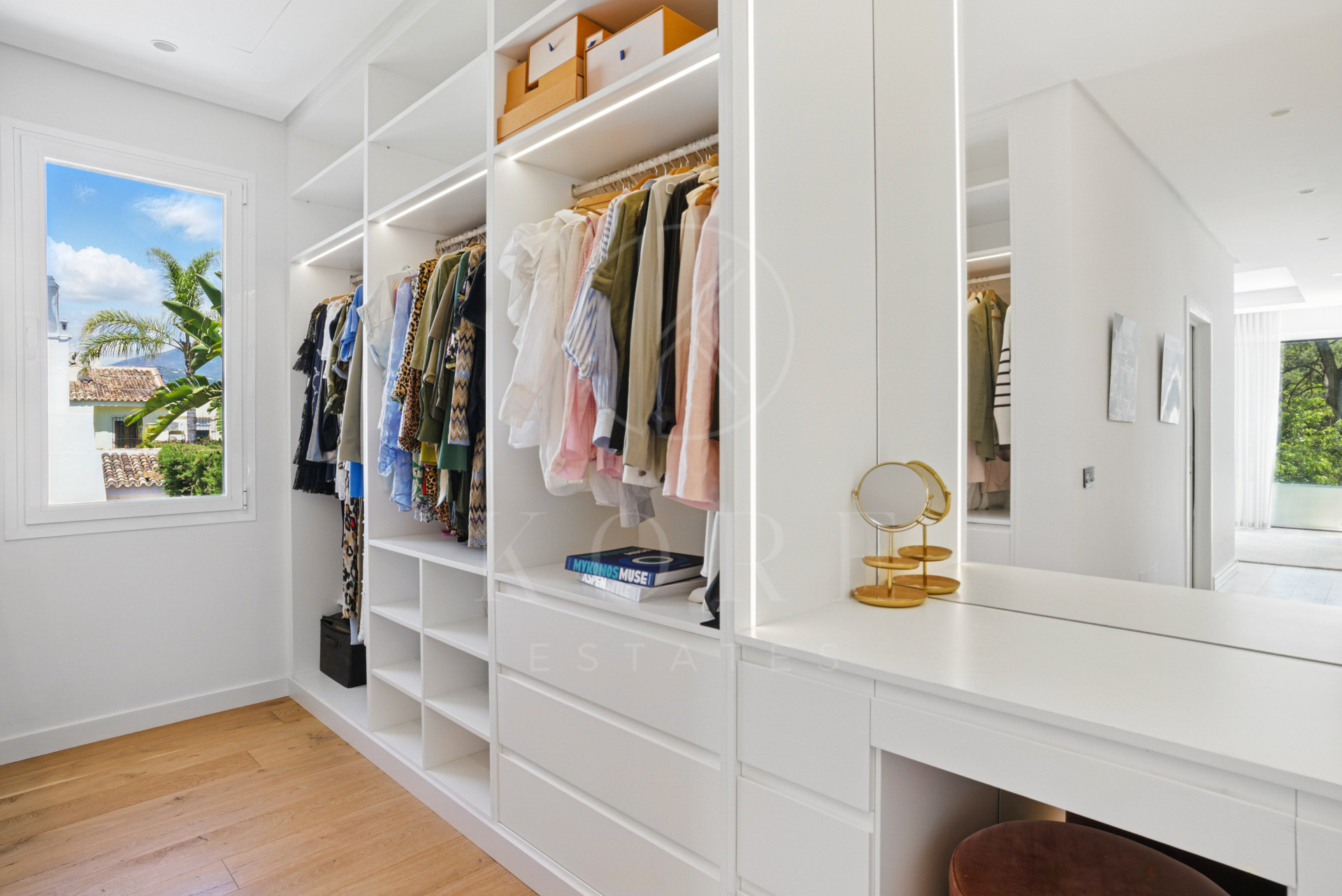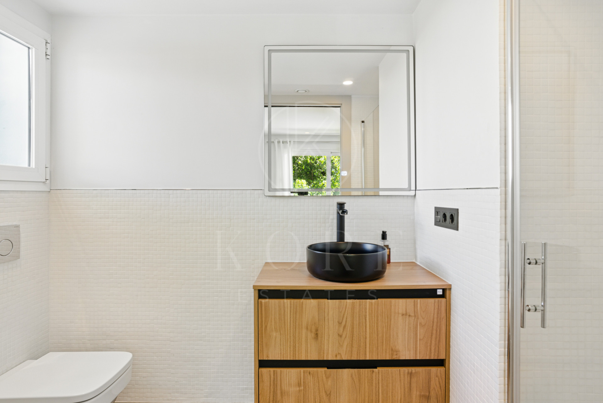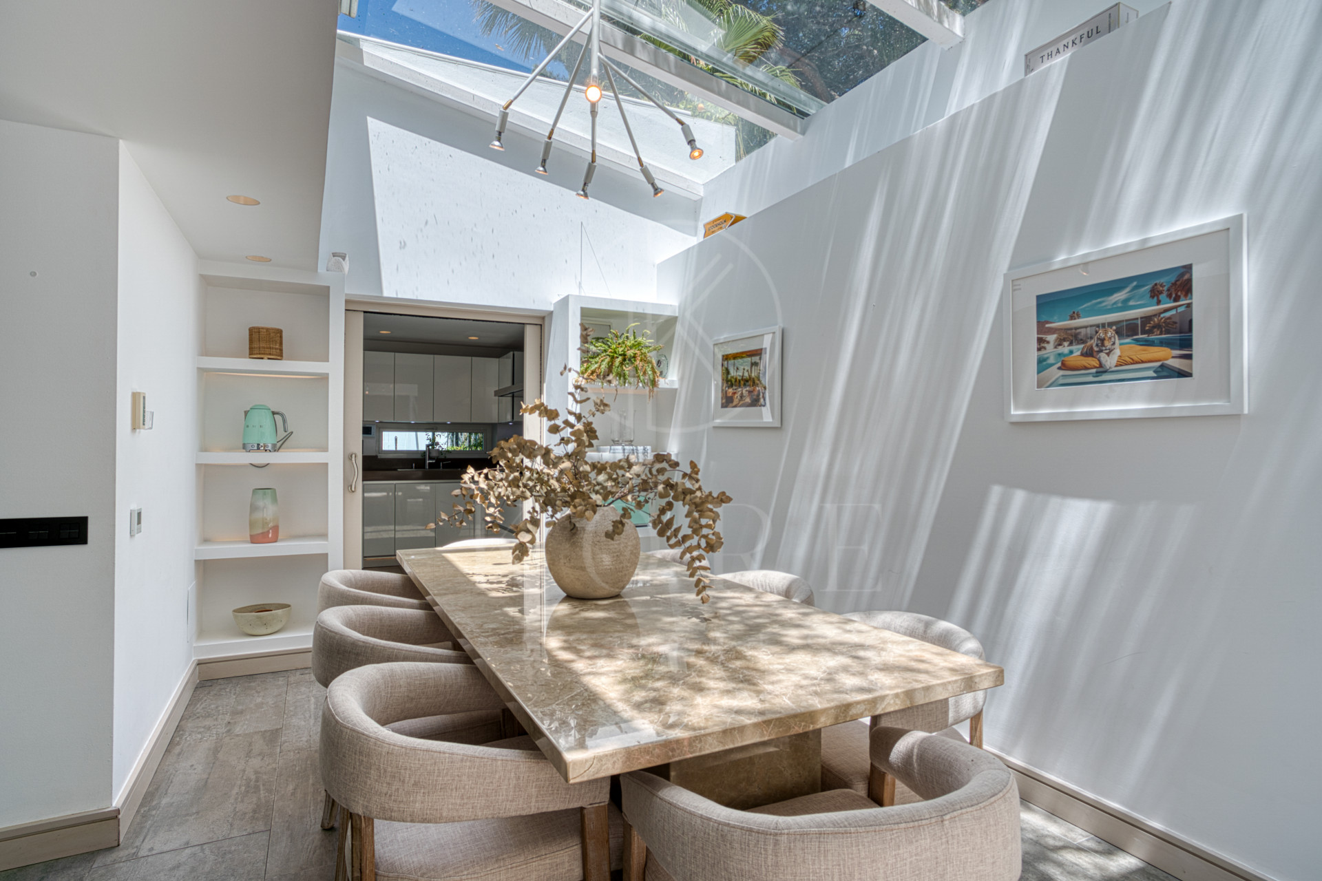Modern, south facing six bedroom villa with sea views located in Nueva Andalucia, Marbella. Situated in a quiet and desirable area of lower Nueva Andalucía, this fully renovated contemporary villa offers a unique blend of luxury, comfort, and versatility. Designed with modern living in mind, the property includes six spacious bedrooms across the main house and a private guest house with a separate entrance, ideal for visitors. The villa features bright open-plan living areas, a high-spec kitchen, and a master suite with a walk-in closet and en-suite bathroom. Outdoor amenities include a heated saltwater pool, jacuzzi, gym area, and beautifully landscaped gardens, perfect for relaxing or entertaining. A newly added upper floor and rooftop solarium provide sweeping sea views, while the closed garage and additional parking for two cars add convenience. Just a short walk from local shops, restaurants, and everyday essentials, this home is equally suited as a stylish family residence or a smart investment property.