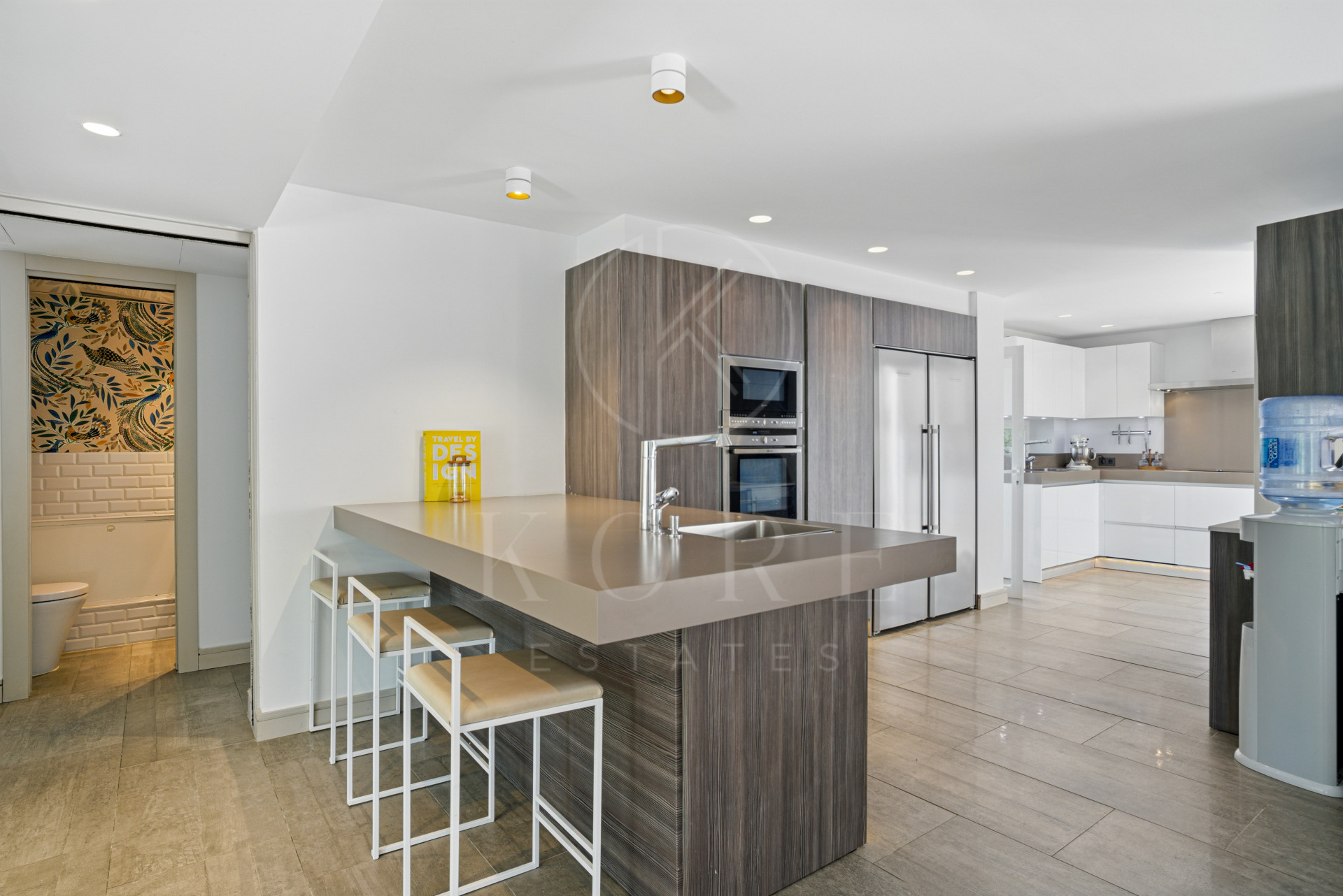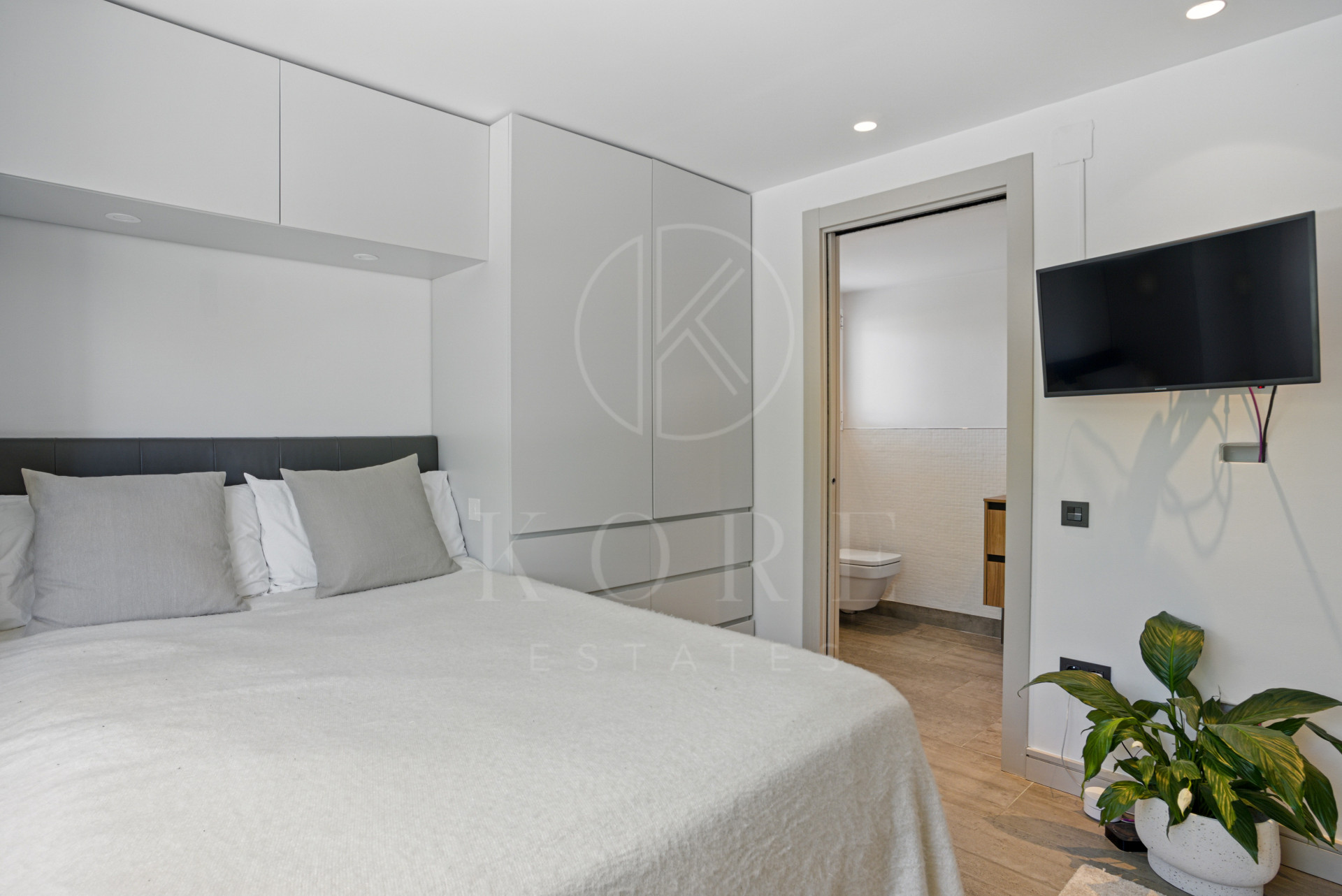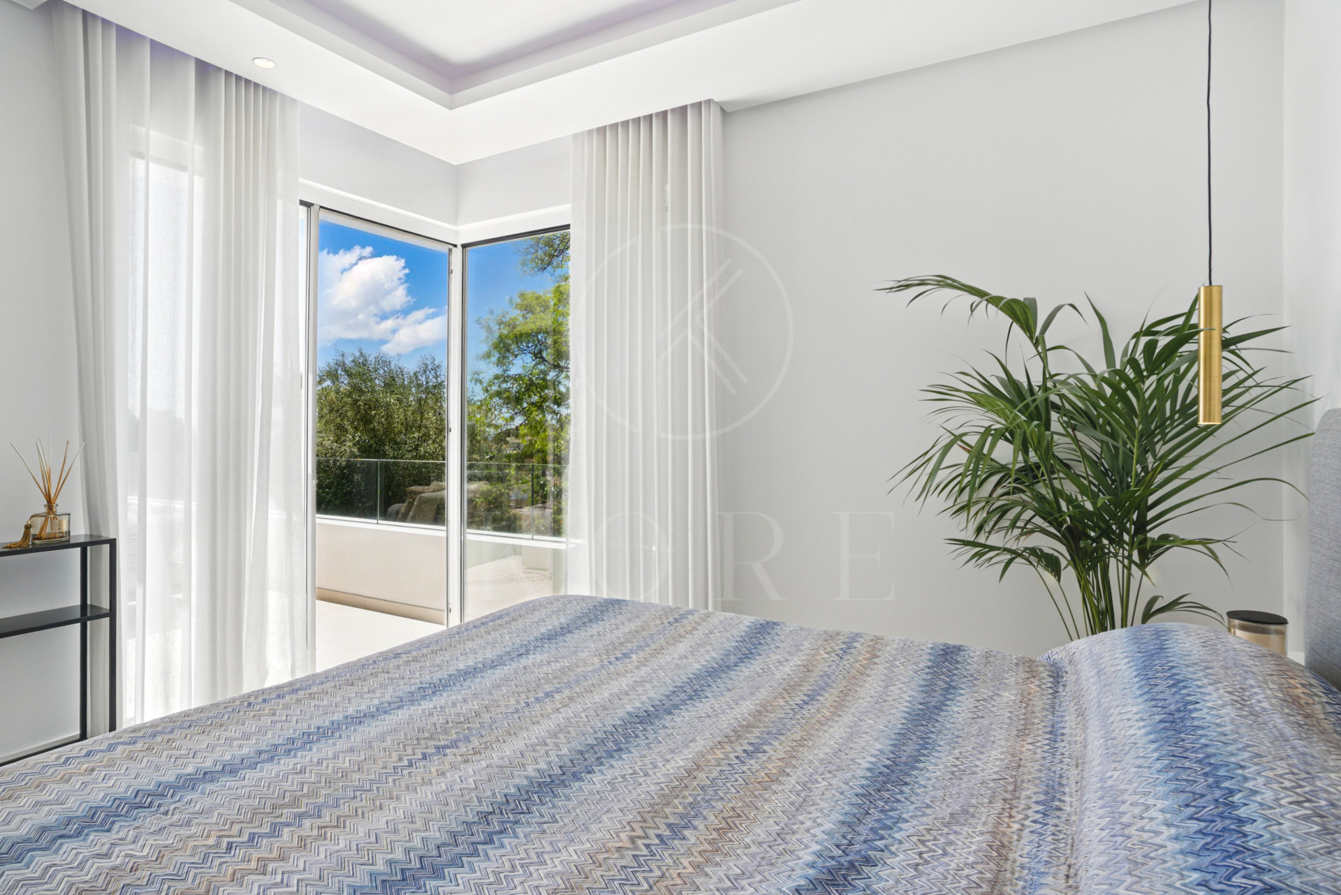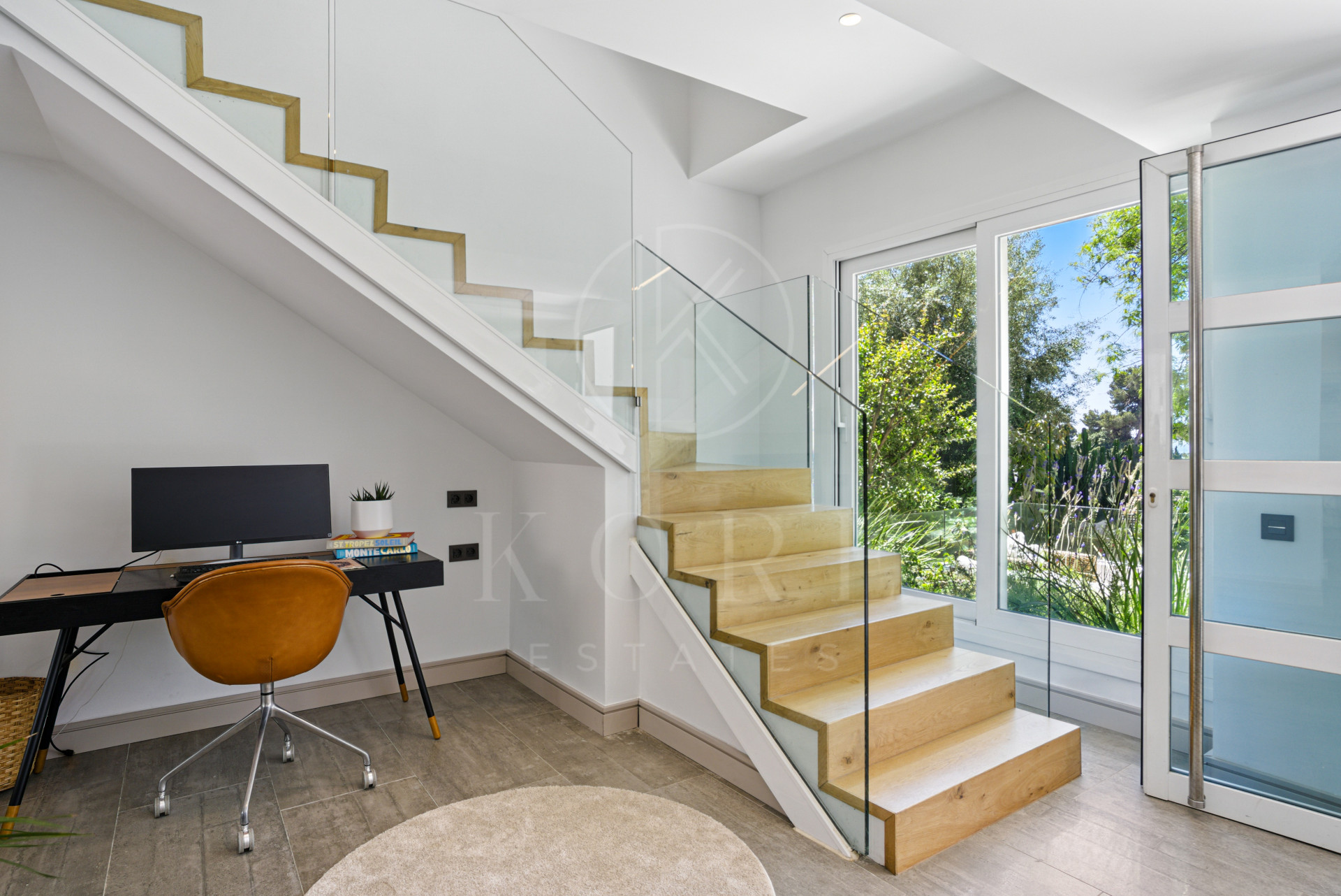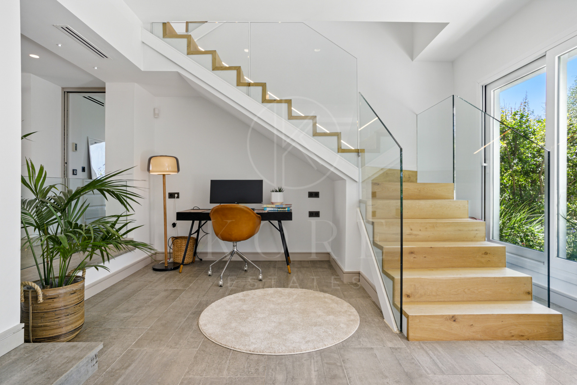 Modern, south facing six bedroom villa with sea views located in Nueva Andalucia, Marbella. Situated in a quiet and desirable area of lower Nueva Andalucía, this fully renovated contemporary villa offers a unique blend of luxury, comfort, and versatility. Designed with modern living in mind, the property includes six spacious bedrooms across the main house and a private guest house with a separate entrance, ideal for visitors. The villa features bright open-plan living areas, a high-spec kitchen, and a master suite with a walk-in closet and en-suite bathroom. Outdoor amenities include a heated saltwater pool, jacuzzi, gym area, and beautifully landscaped gardens, perfect for relaxing or entertaining. A newly added upper floor and rooftop solarium provide sweeping sea views, while the closed garage and additional parking for two cars add convenience. Just a short walk from local shops, restaurants, and everyday essentials, this home is equally suited as a stylish family residence or a smart investment property.