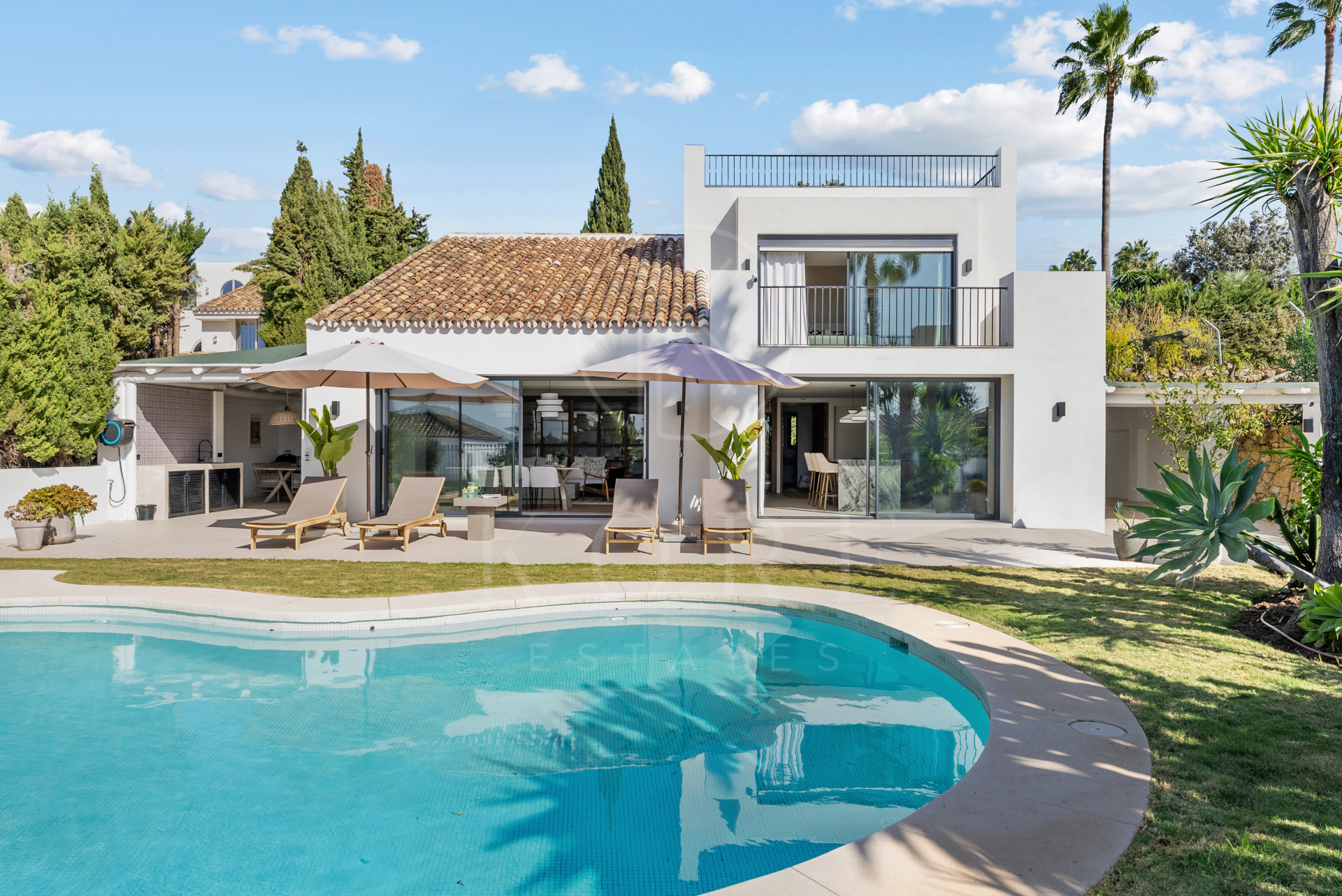 Welcome to Villa Lucalle, a contemporary masterpiece located in the picturesque grounds of Los Naranjos Hill Club in La Cerquilla, Nueva Andalucía.
