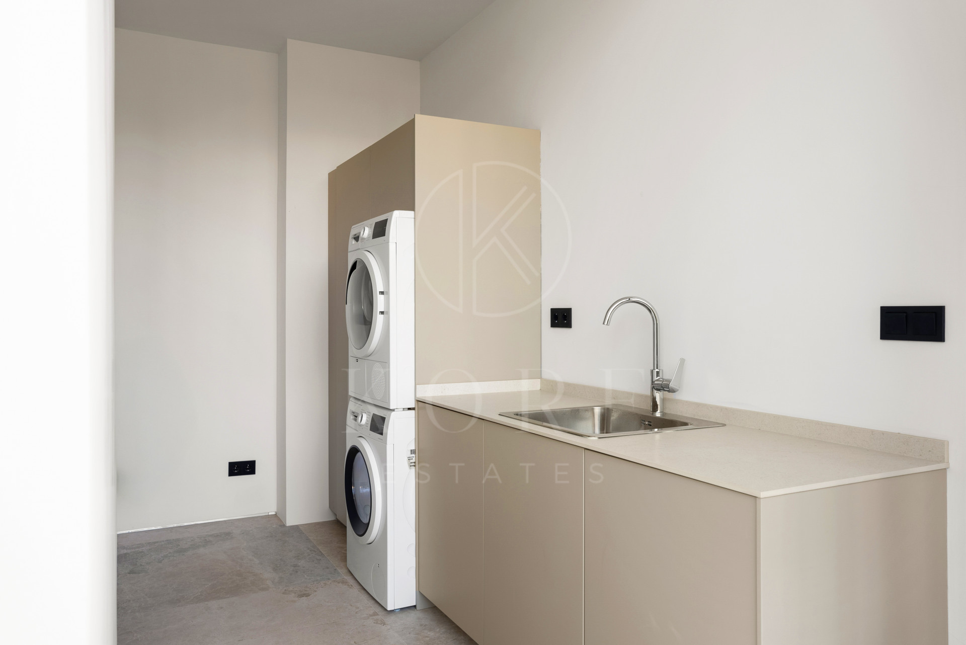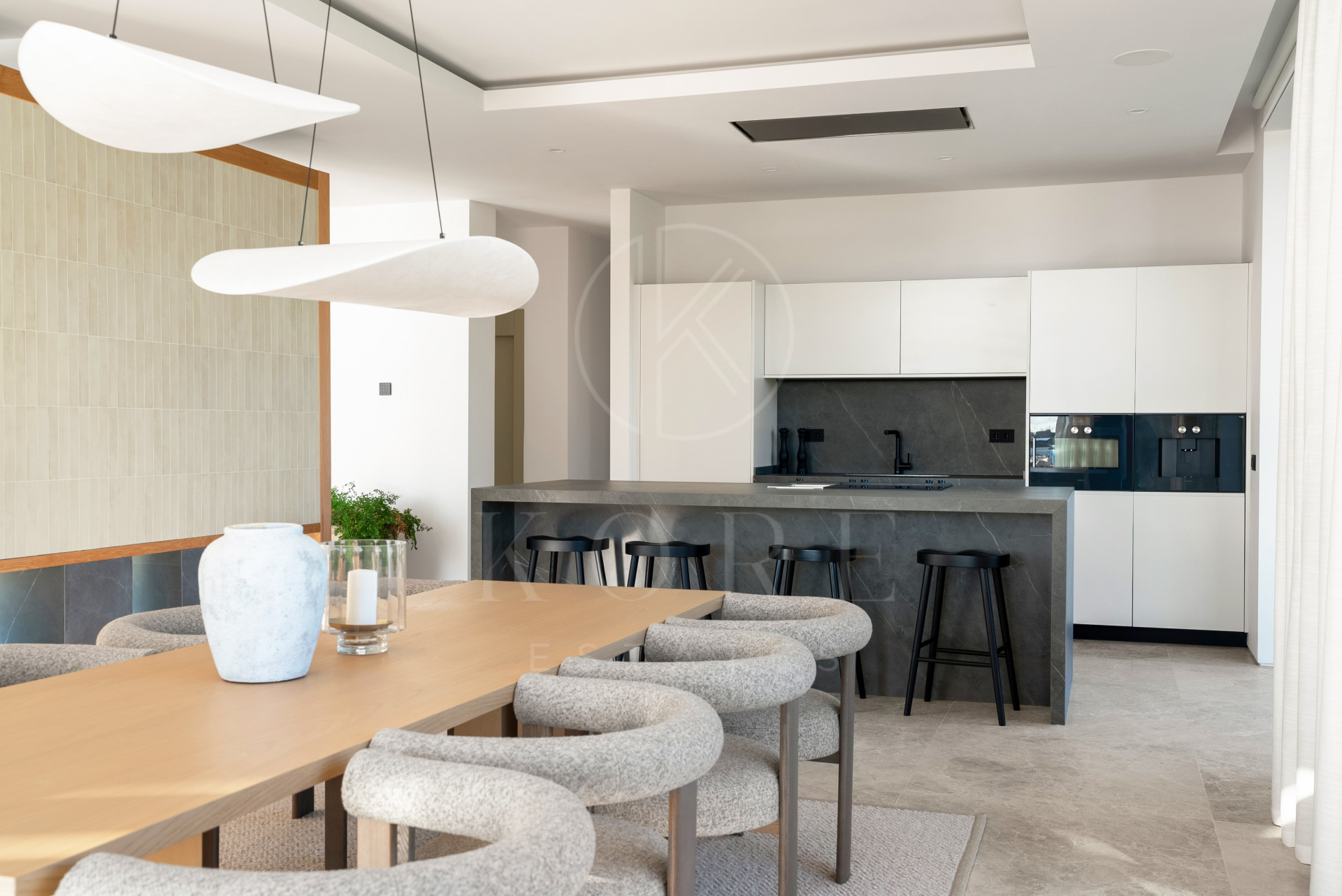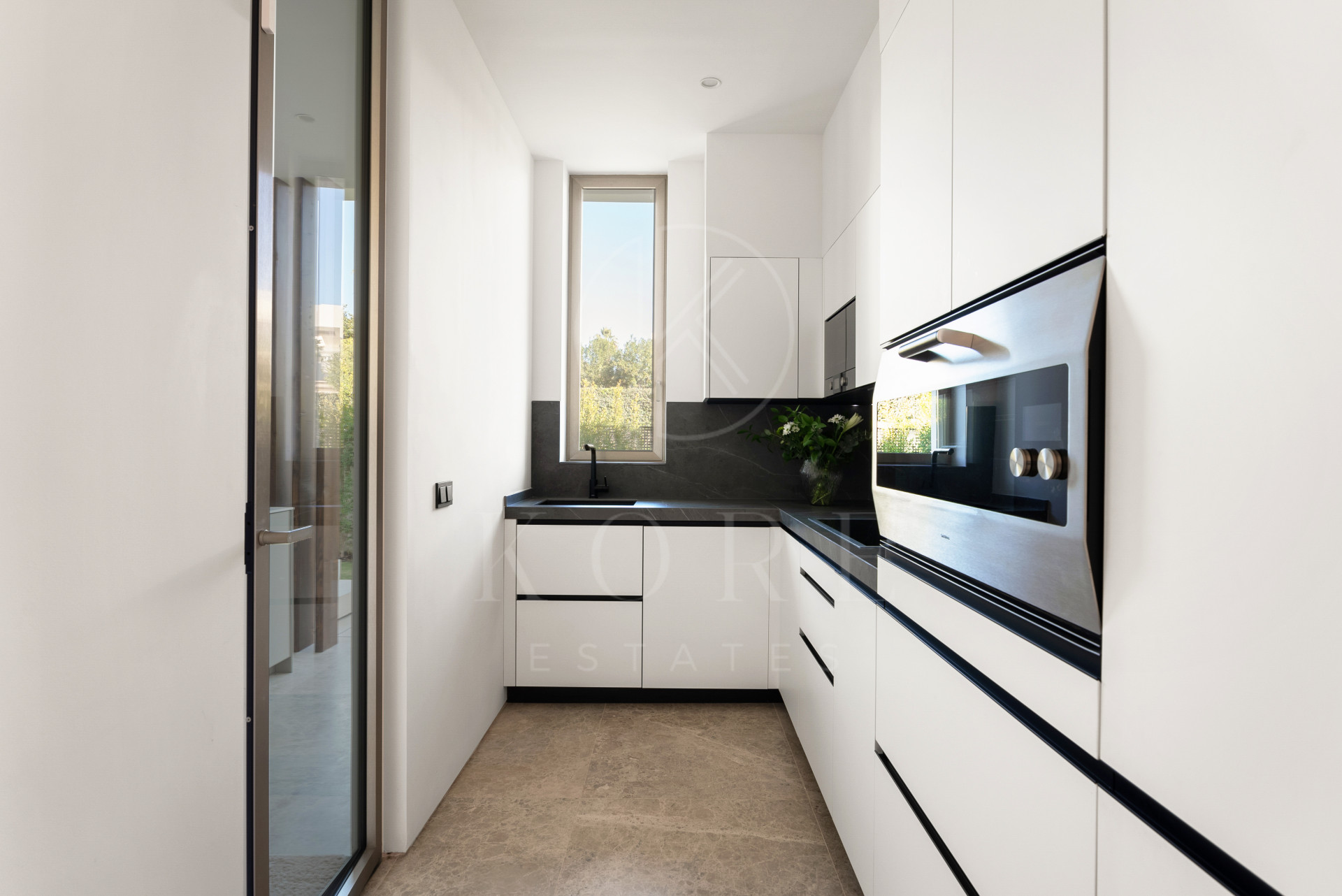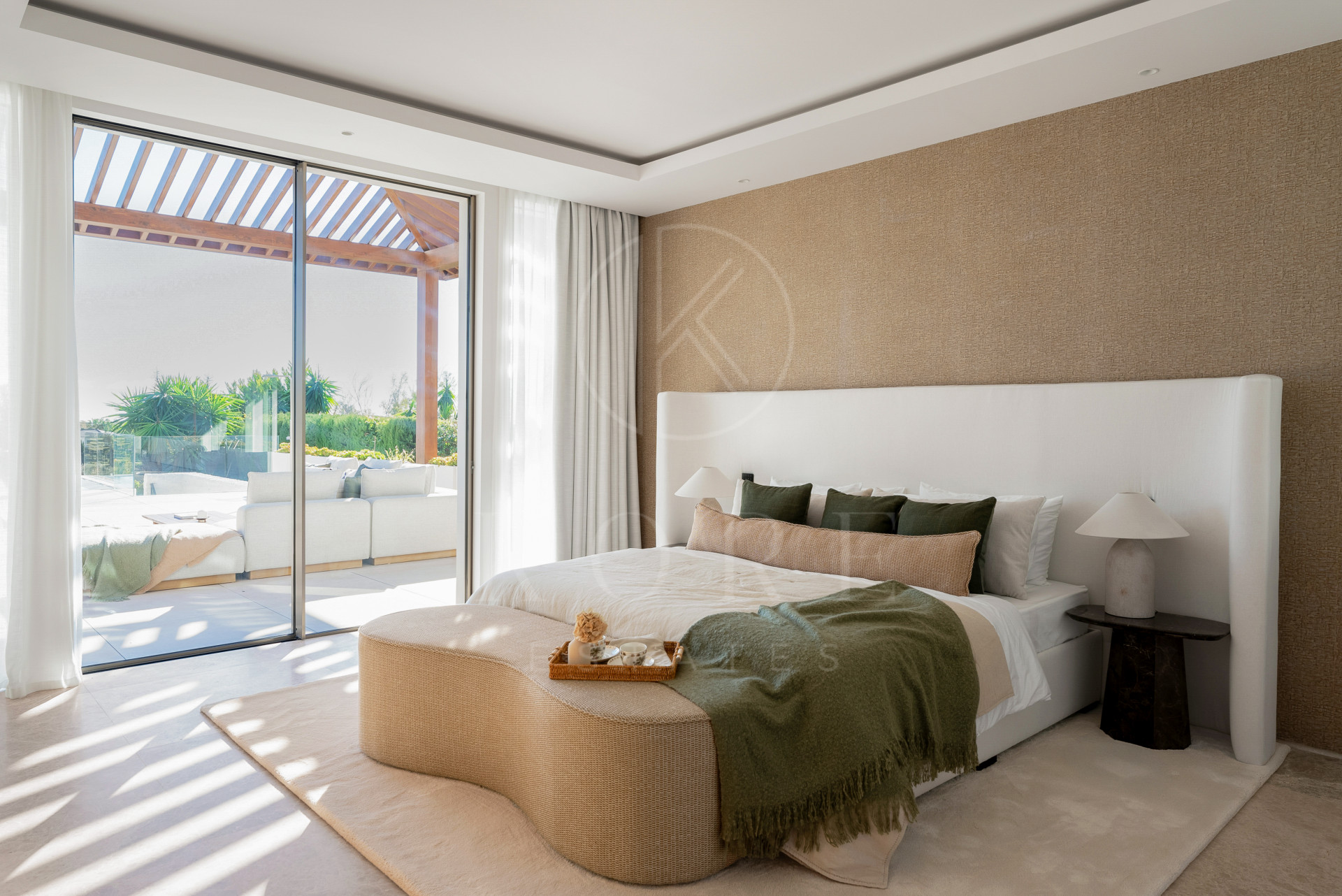 The interior is bright and open, with soft neutral tones and large windows that flood the spaces with natural light throughout the day. The kitchen is sleek and fully equipped, flowing seamlessly into the living areas and out onto spacious terraces designed for relaxed outdoor living. The villa offers six well-proportioned bedrooms, including a standout master suite with direct terrace access, a walk-in wardrobe, and a beautifully finished bathroom.