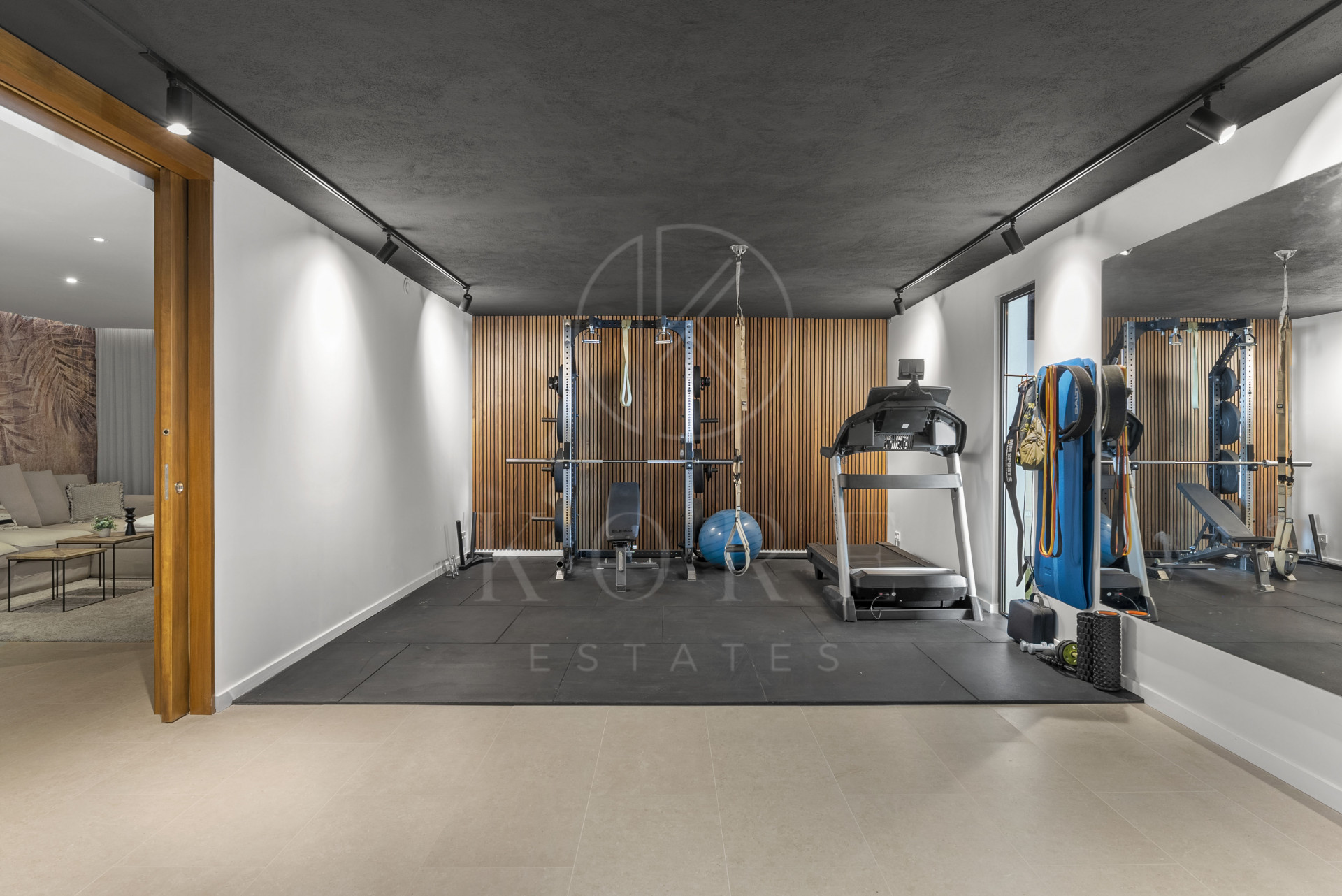 The lower level offers a guest suite with en-suite bathroom, a laundry room, a private gym, and a garage with space for at least two cars.