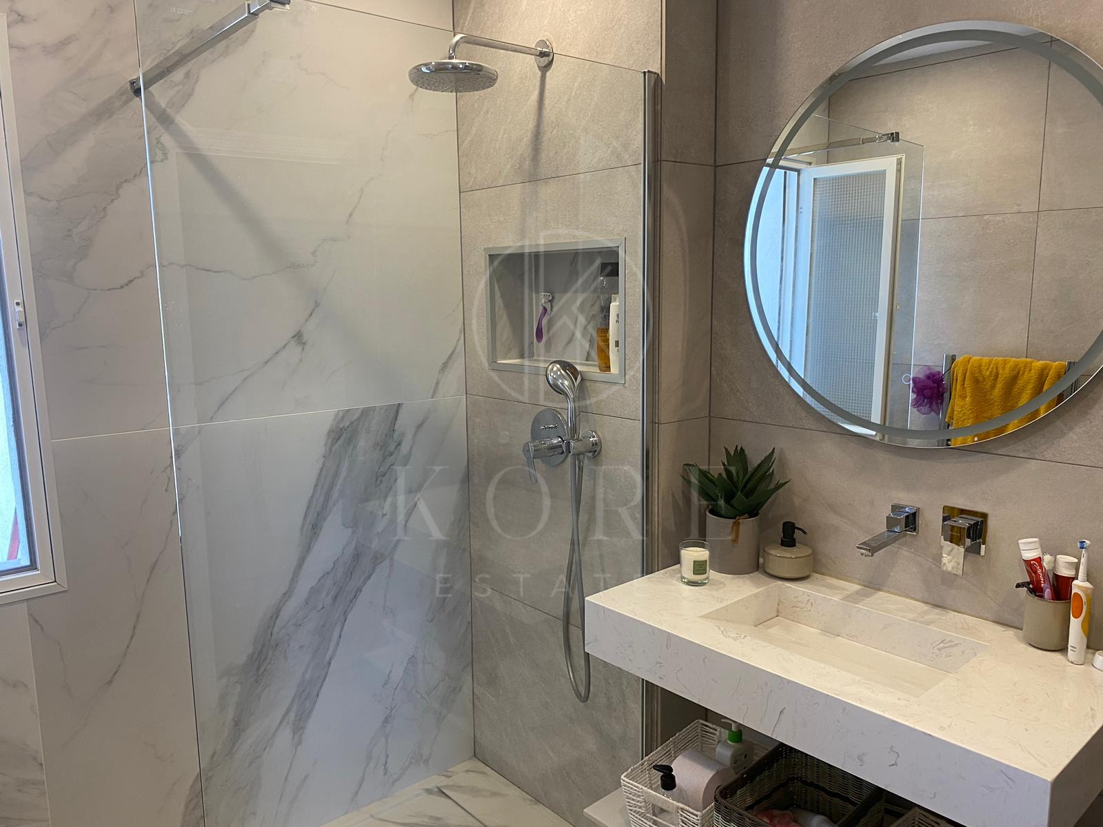 At the same level, to the right from the entrance, we have three bedrooms and two bathrooms, one of which is en-suite with a bathtub.
