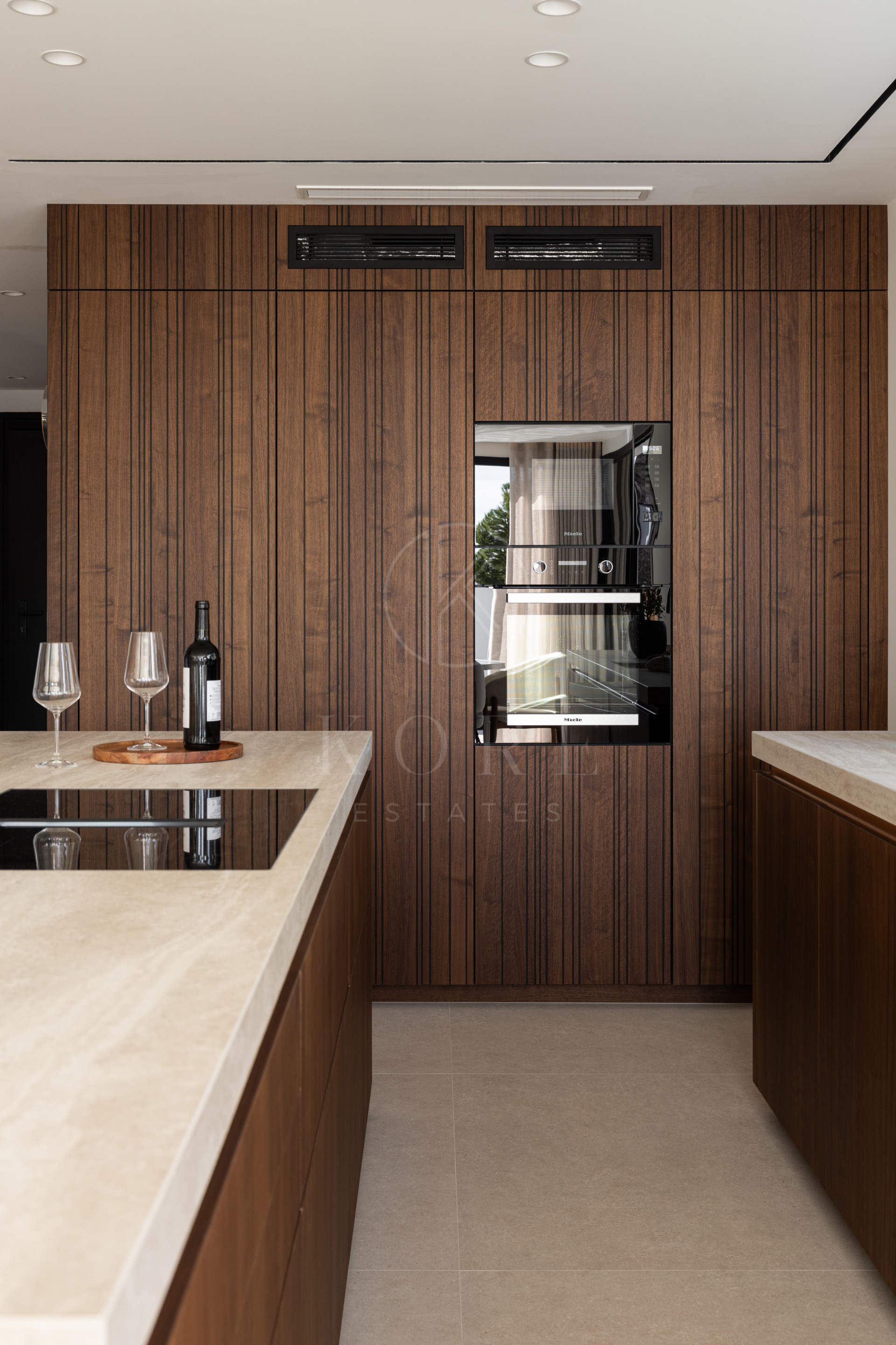 Upon entering, a beautifully designed hallway leads to a generous living room, dining area, and a fully equipped open kitchen by Licht, featuring top-of-the-line Miele appliances. The first floor also includes an ensuite bedroom, laundry facilities, and a guest toilet. The second floor houses the Master bedroom, 2 additional bedrooms with a shared bathroom, terraces, and access to the rooftop.