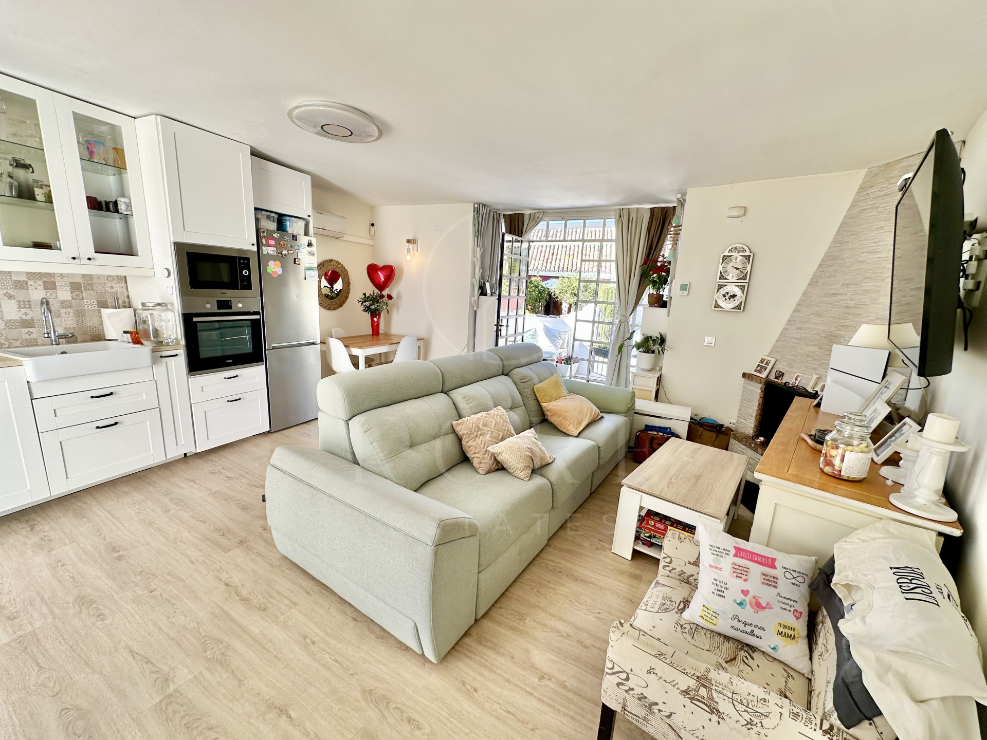 Built in 1986 and thoughtfully refurbished in 2023, this 78 m² useful Andalusian-style townhouse spans two floors with an open-concept design that maximises natural light and space. The ground floor features laminated flooring, an inviting open fireplace for cooler evenings, air conditioning, and a porch with awnings for summer shade. The Swedish-style open kitchen is fully equipped with an integrated oven and microwave, ample storage, and seamless integration into the living-dining area. A convenient outdoor guest toilet completes this level. Upstairs, two bedrooms boast large windows and balcony access, high vaulted ceilings for a rustic yet spacious feel, optimised storage with two floor-to-ceiling wardrobes, and a full bathroom with shower. Dual north and south orientations ensure balanced light, with direct access to communal areas. Private terraces include a northwest-facing front one perfect for barbecues and lounging, and a sunny south-facing rear terrace ideal for sunbathing or relaxation. Upgrades like PVC windows enhance energy efficiency and comfort.