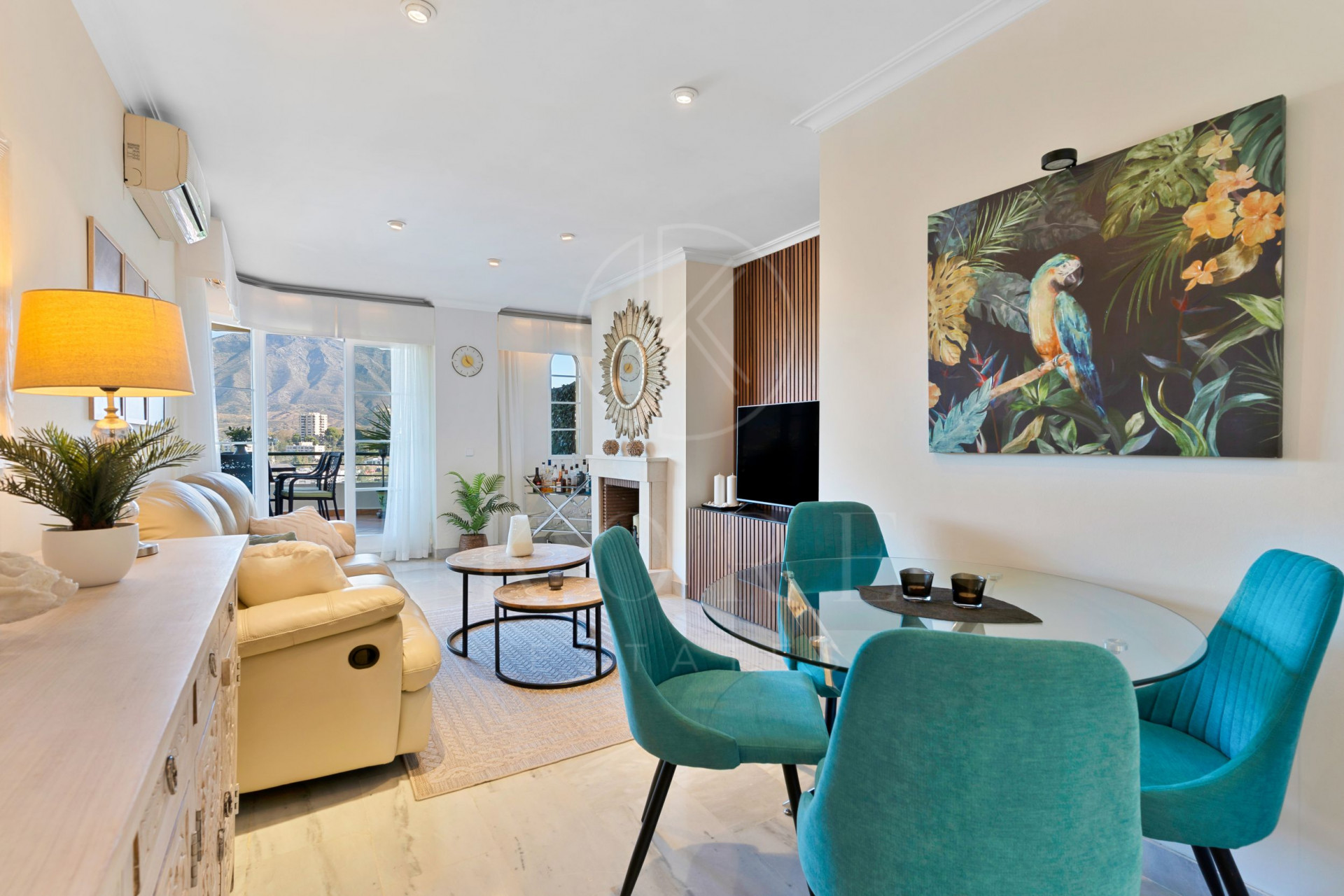 The apartment features a fully fitted kitchen, air conditioning, marble floors, and a fireplace in the living room. Double glazing, fitted wardrobes, and an armoured door add to the comfort and safety of the home. The property is sold in good condition, partly furnished. High-speed fibre optic internet is also installed.