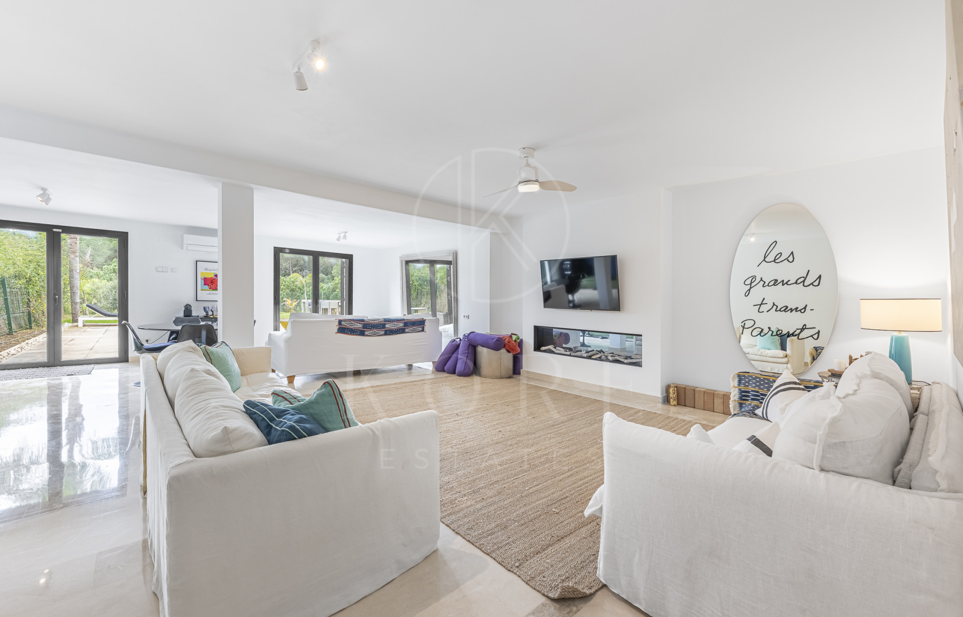 This beautiful semi-detached house sits on a generous plot surrounded by lush green foliage and mature gardens, offering privacy and a wonderful sense of tranquillity. The outdoor area is perfect for family living and entertaining, featuring a lovely modern private pool and a large, spacious chill-out terrace that flows seamlessly from the house to the poolside.