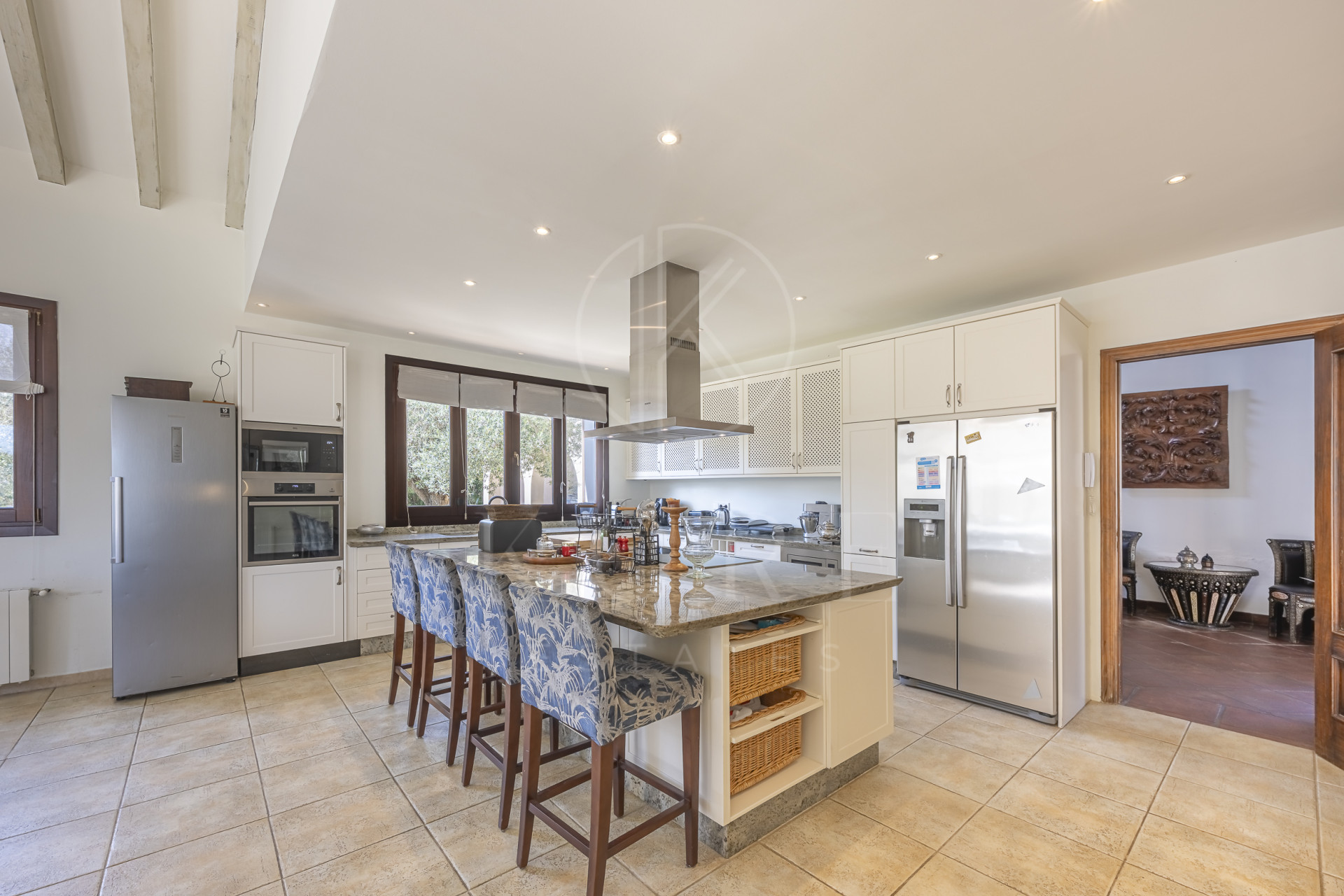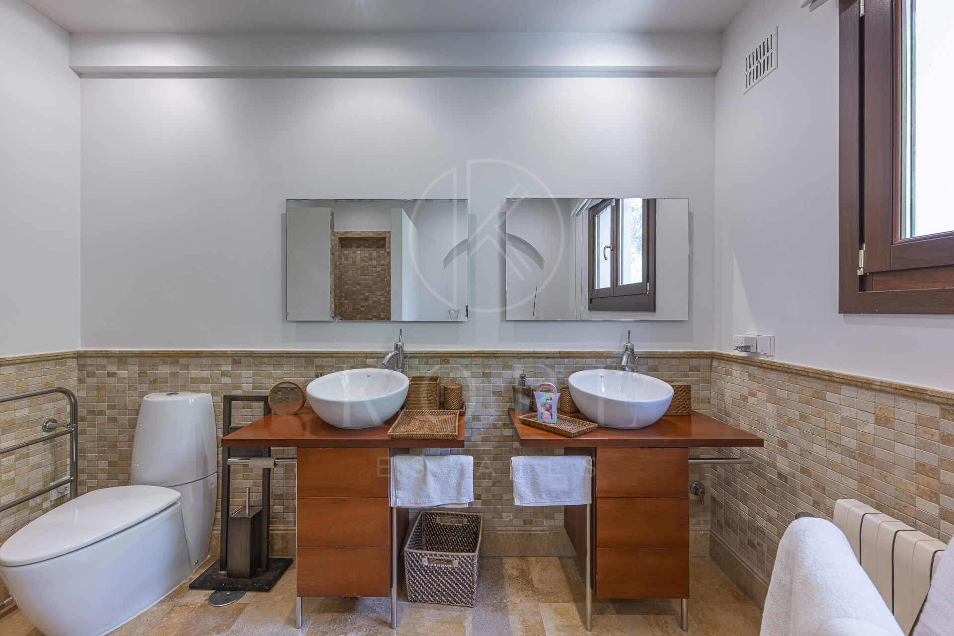 The villa is mainly built on one level, with an additional guest annex above the garage, offering privacy and convenience for visitors or staff. Its typical Andalusian terracotta floors and exposed wood beams on the high ceilings create a warm Mediterranean flare. The bathrooms feature traditional Andalusian tiles reminiscent of Spanish handmade ceramics found in country houses which combine prefectly with wood.