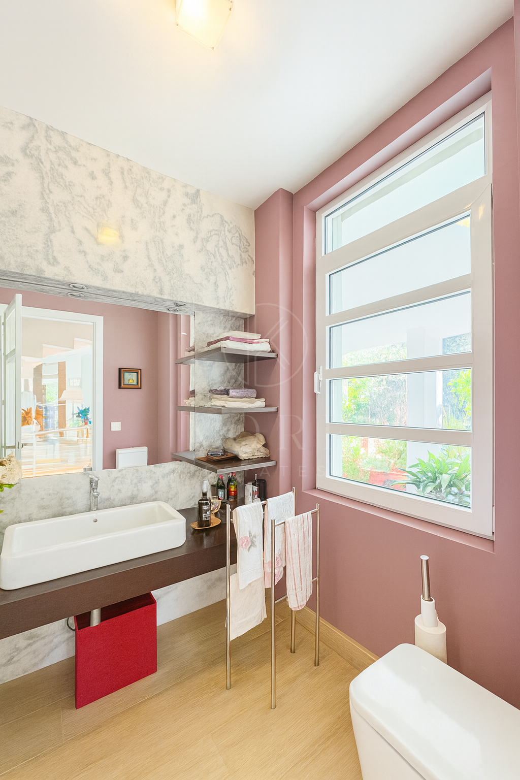 The architecture harmoniously blends modern lines with traditional craftsmanship, featuring hand-crafted Corian bricks, elegant serpeggiante marble flooring, and rich iroko wood parquet in the bedrooms — creating an ambiance of understated sophistication throughout.