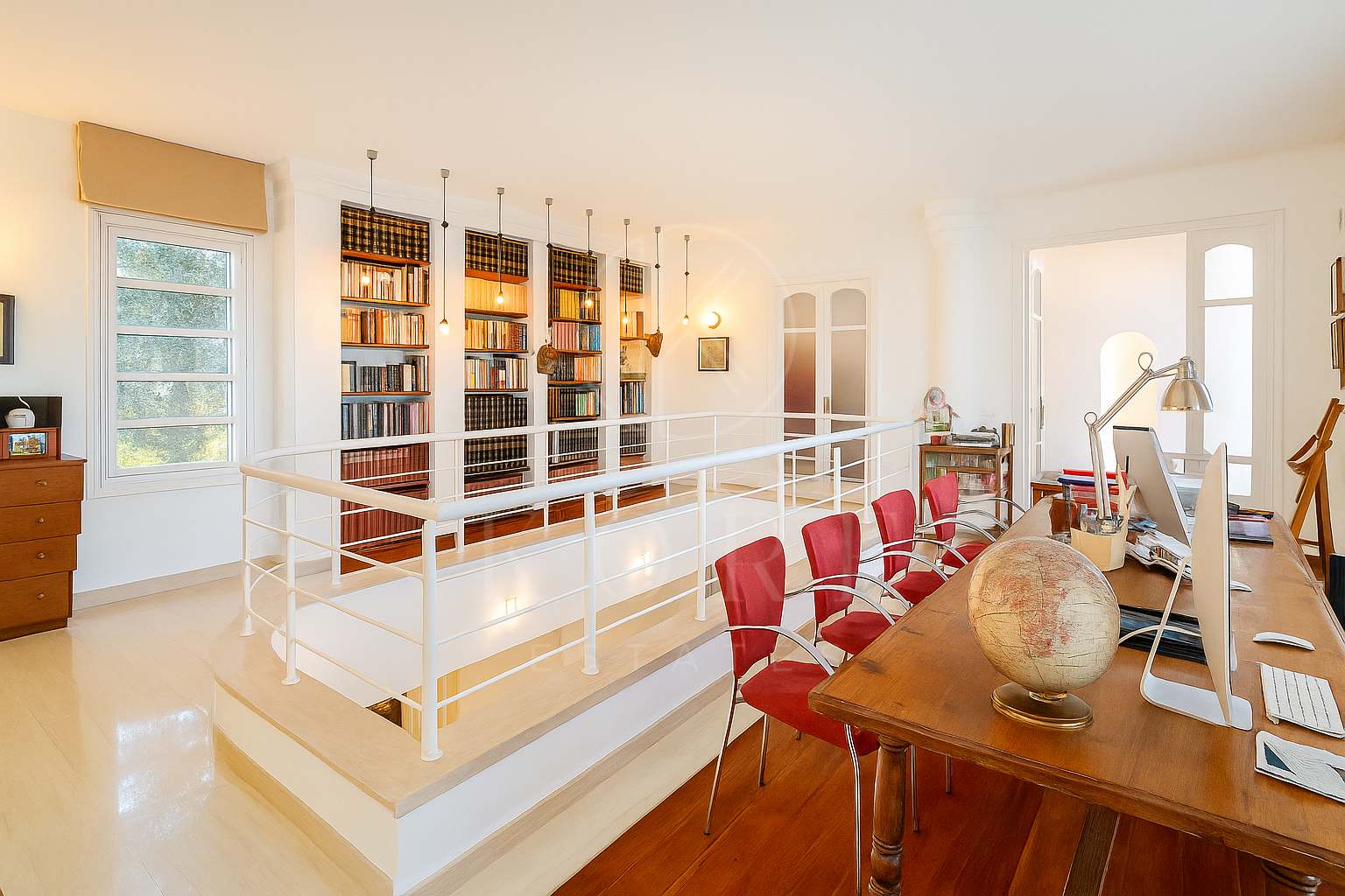 On the upper floor, three bedrooms await, including a spacious primary suite with a walk-in closet. A stunning library mezzanine overlooks the main living area, providing an inspiring space for work or relaxation.