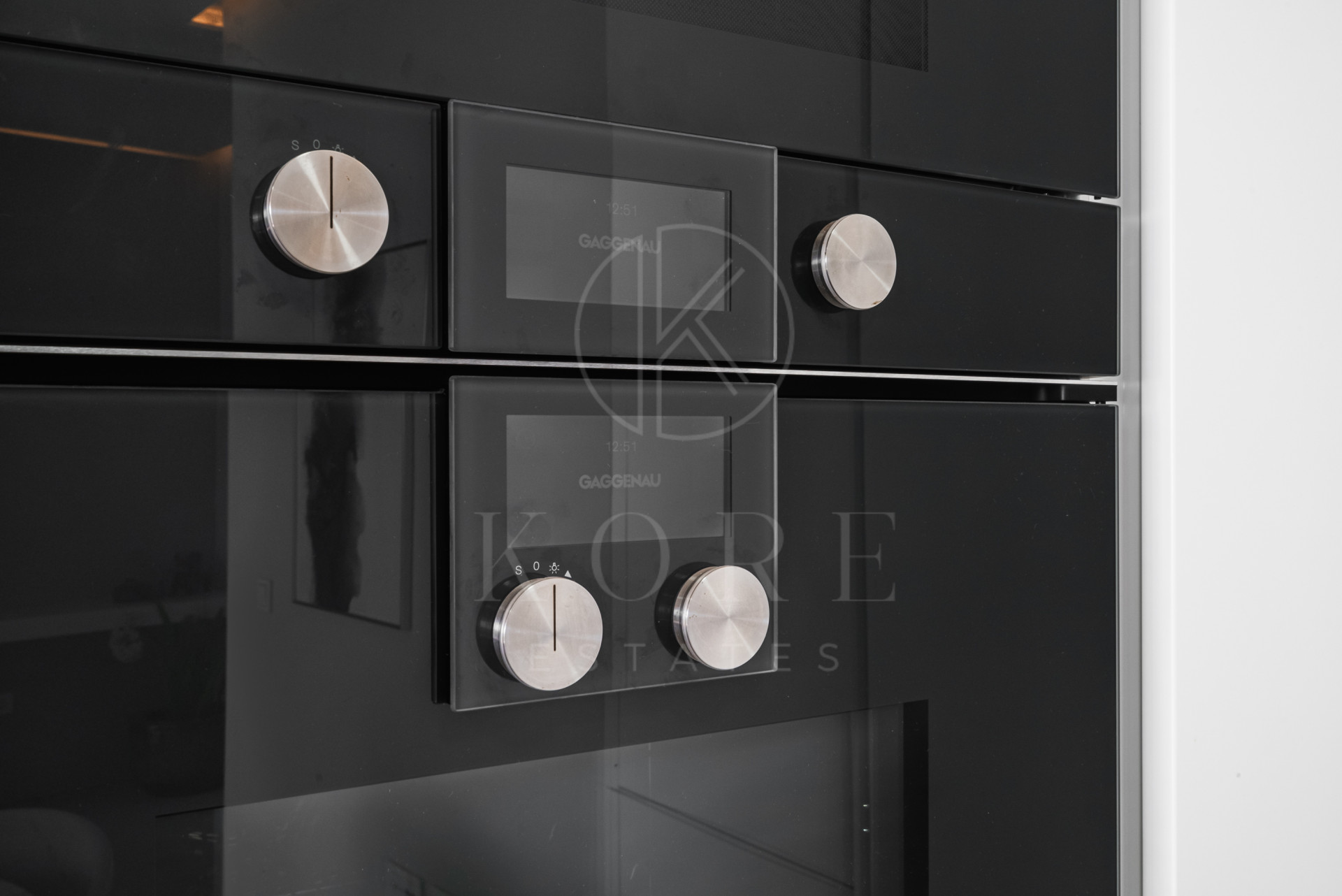The kitchen is a chef’s dream, fully equipped with sleek Gaggenau appliances and a stylish design that seamlessly integrates with the living area—ideal for hosting guests or preparing family meals in an elegant space.