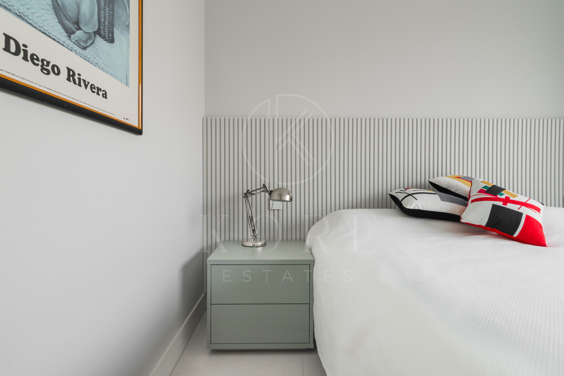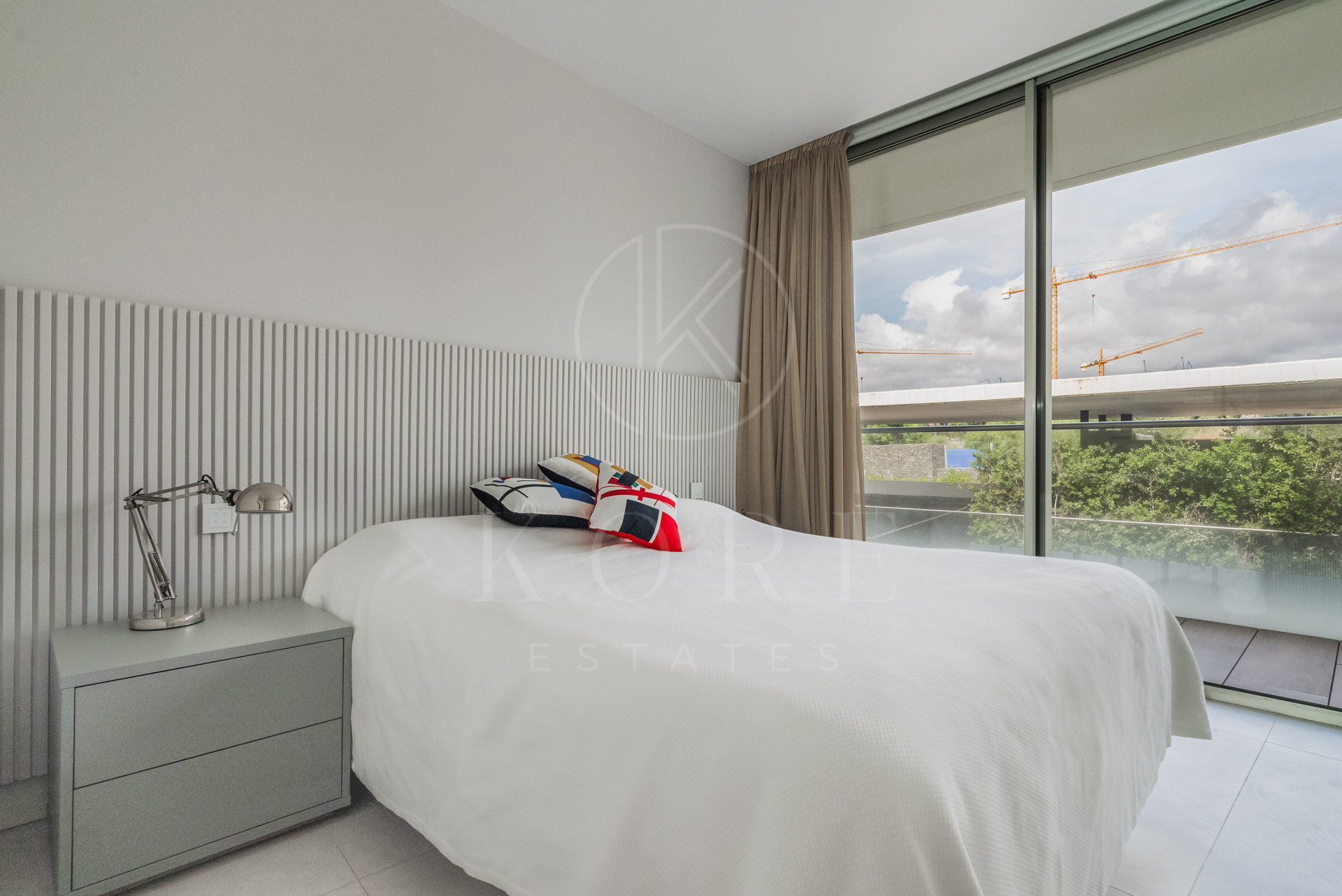 This stunning modern apartment in The Edge, Estepona’s premier beachfront development, offers a luxurious living experience with 92m² of contemporary, open-plan space. Built in 2019, the apartment features 2 spacious bedrooms and 2 elegant bathrooms, finished by the prestigious Dornbracht brand, known for its high-end design and attention to detail. The bright and airy layout creates a sense of calm and sophistication, while floor-to-ceiling glass doors lead onto a generous 25m² private terrace. Here, you can soak in spectacular sea views, making it the perfect setting for both relaxation and entertaining.