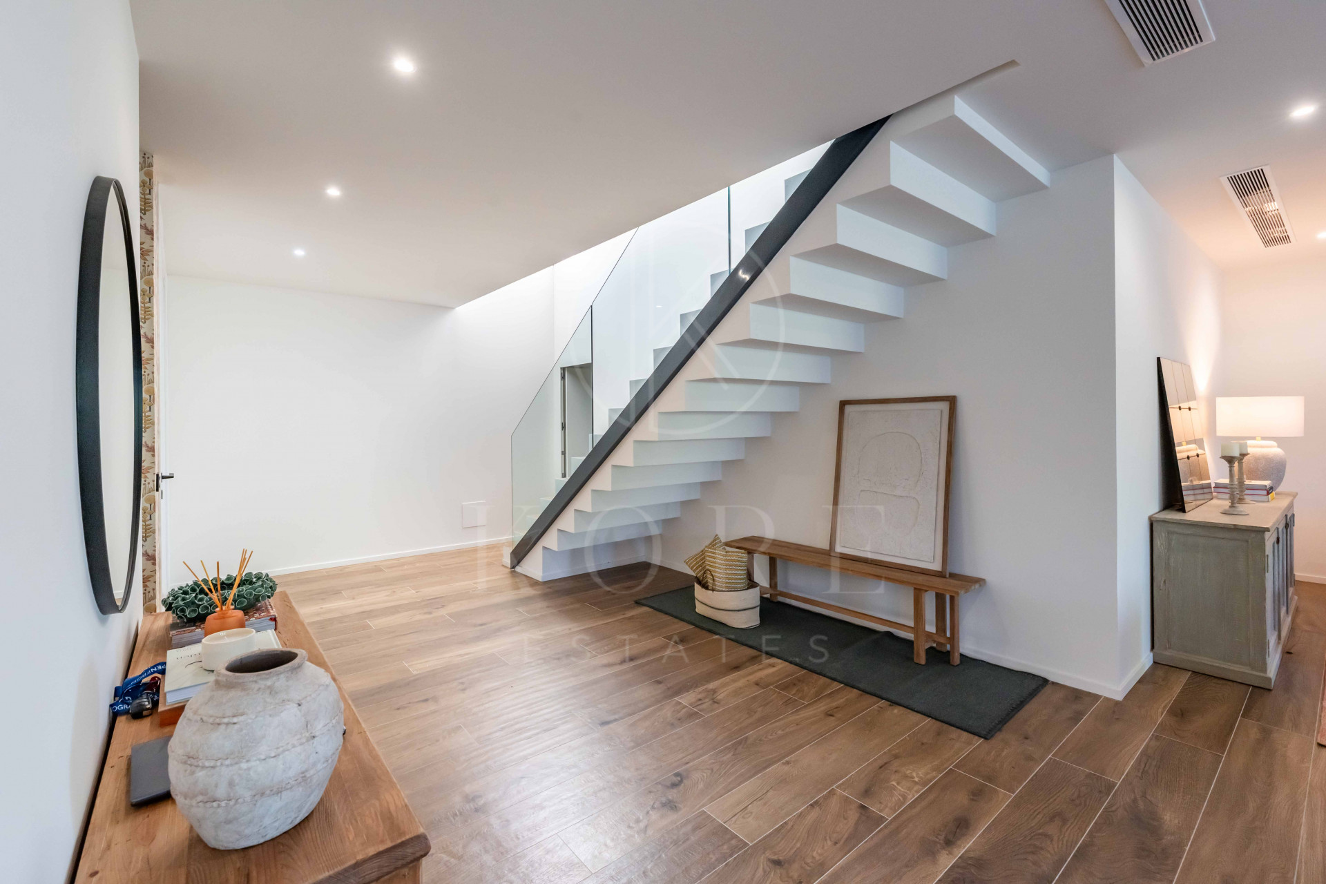 The villa includes air conditioning and pre-installation for solar panels, offering a sustainable approach without giving up comfort or aesthetics.