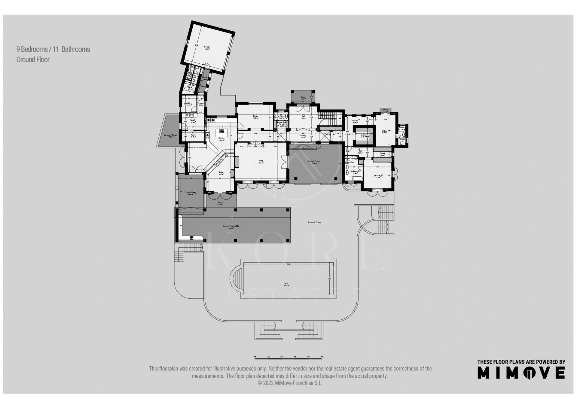 The villa offers nine bedrooms and eleven bathrooms, providing ample accommodation for residents and guests alike. The interior spans 720m² within a total built area of 1,084m², ensuring each room feels airy and bright. The property is equipped with air conditioning, underfloor heating throughout, and a fireplace, ensuring comfort in every season. There is a dedicated guest apartment, a guest room, and an office room for flexible living arrangements, while the basement, storage room, and laundry room add practical convenience. The villa’s unfurnished status presents a blank canvas for personalisation.