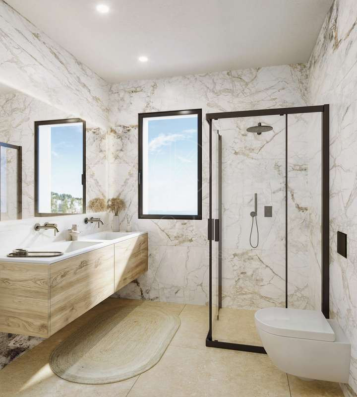 Etajul superior: Două dormitoare elegante cu băi en-suite, zone de dressing mari și dulapuri încorporate. Fiecare dormitor are o terasă privată cu vedere panoramică.
