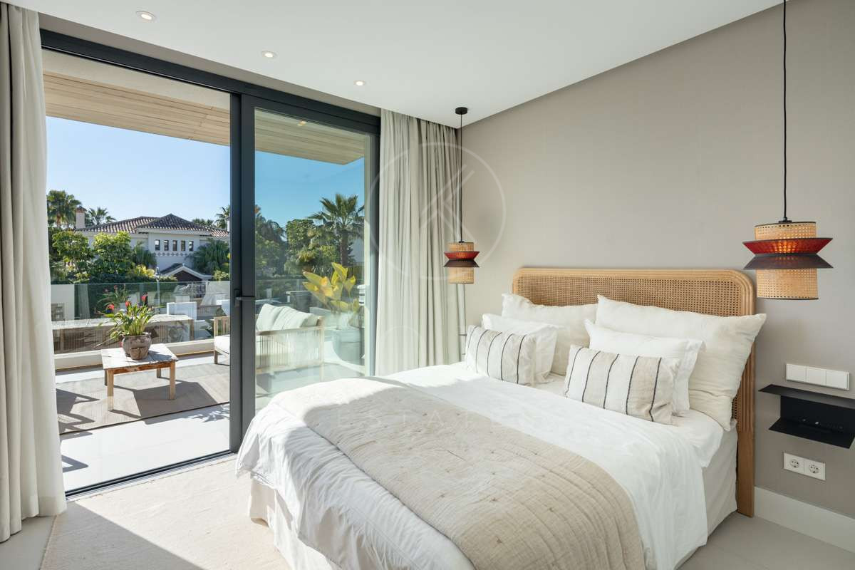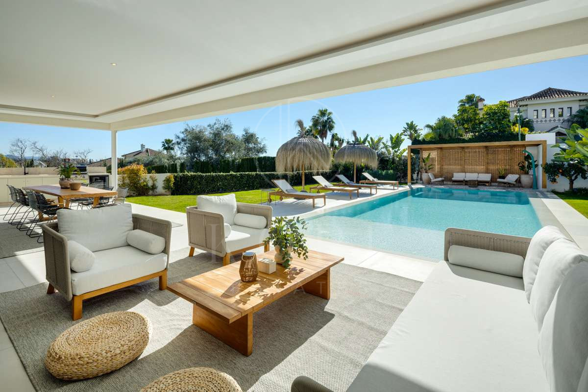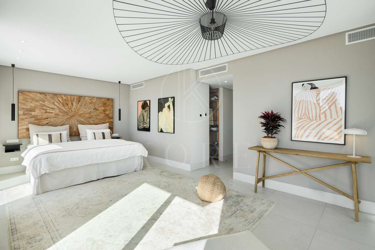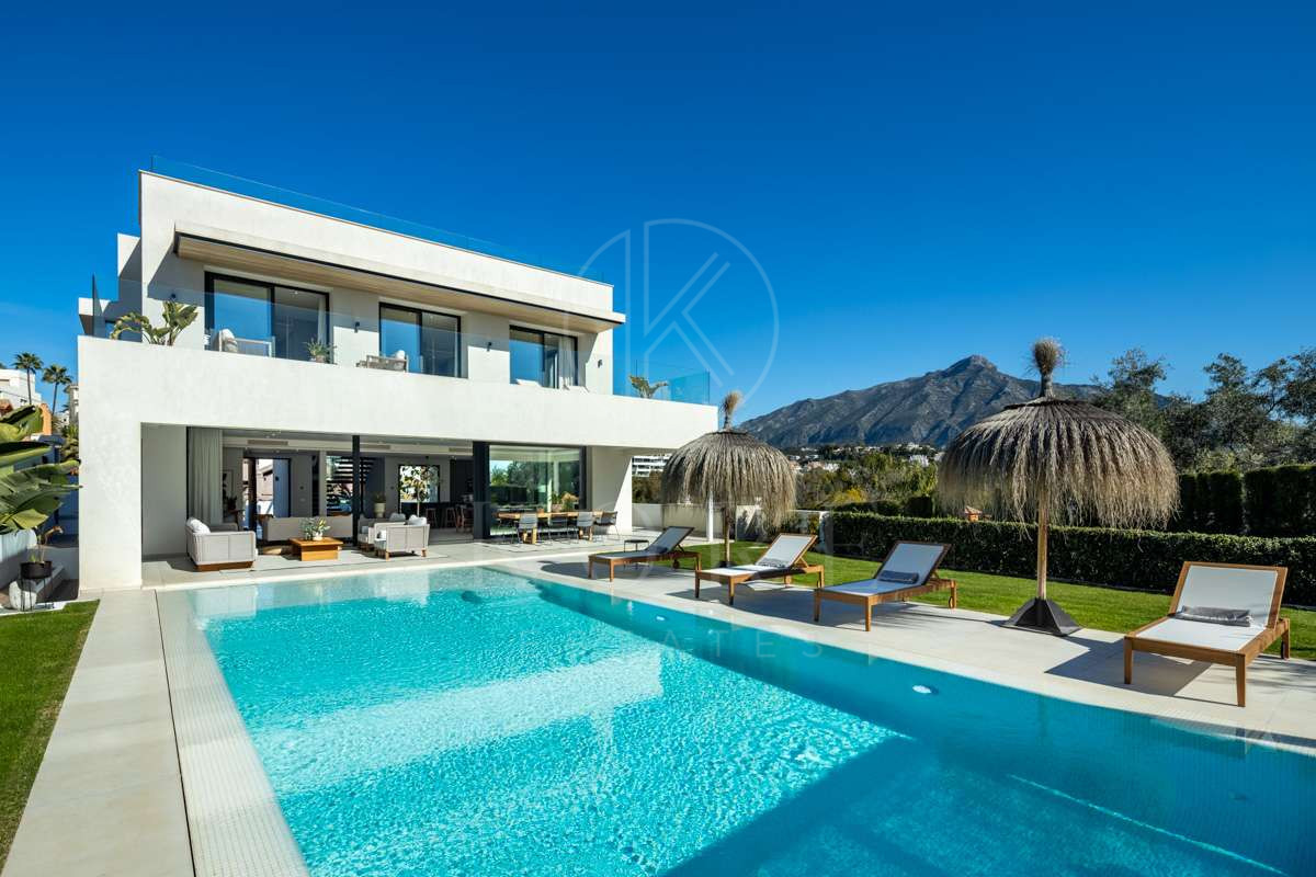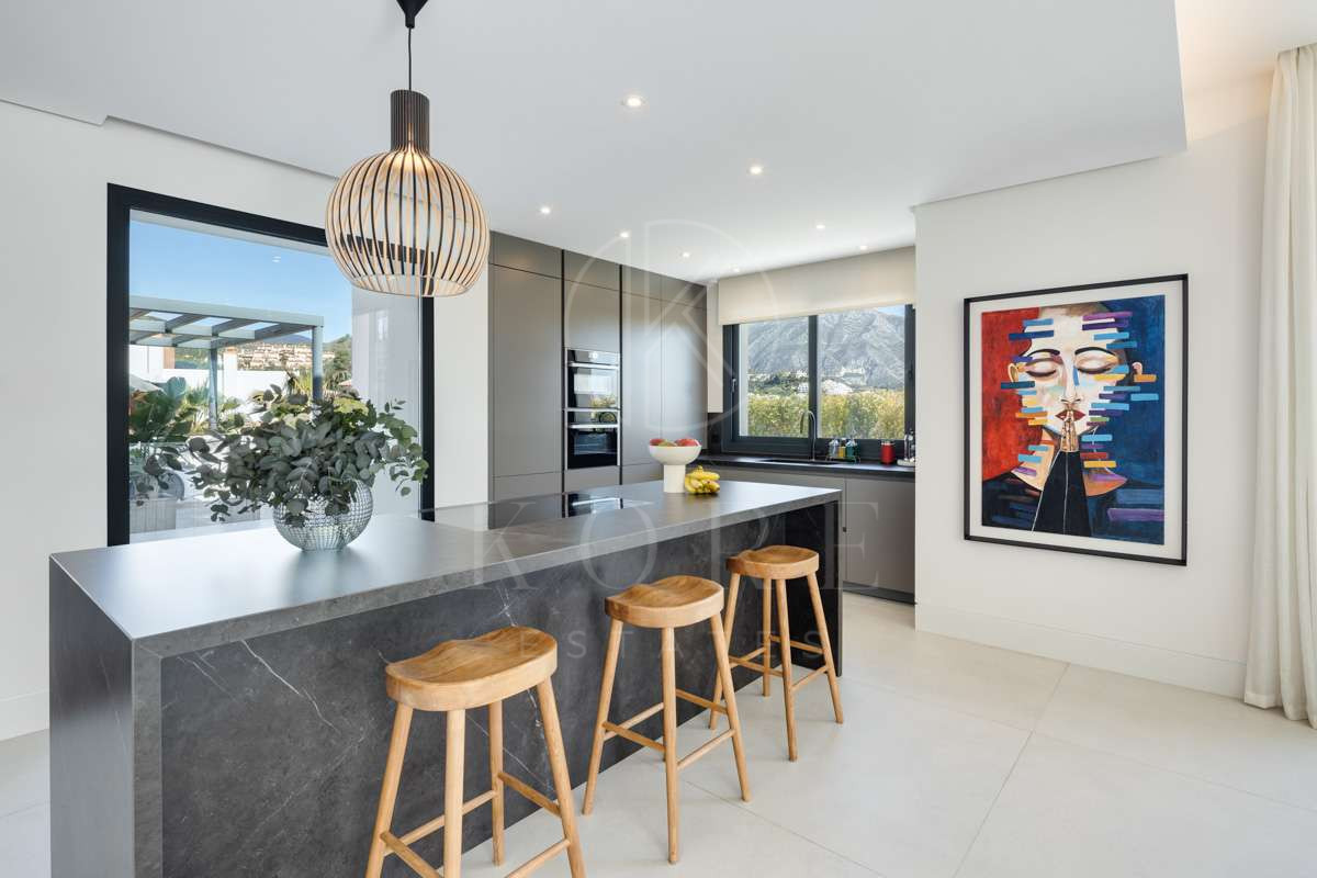 O vilă modernă în zona rezidențială de top La Cerquilla, oferind o combinație excepțională de lux și confort. Situată în Golf Valley, zona căutată din Marbella, proprietatea se bucură de vedere la mare și munte, fiind la doar câteva minute de toate facilitățile cheie. Designul contemporan al vilei maximizează lumina naturală, cu uși glisante din sticlă de la podea până la tavan care conectează perfect spațiile de locuit interioare și exterioare. Configurația deschisă îmbunătățește atât funcționalitatea, cât și sofisticarea, cu o bucătărie modernă elegantă dotată cu o insulă centrală din marmură și electrocasnice integrate de ultimă generație.