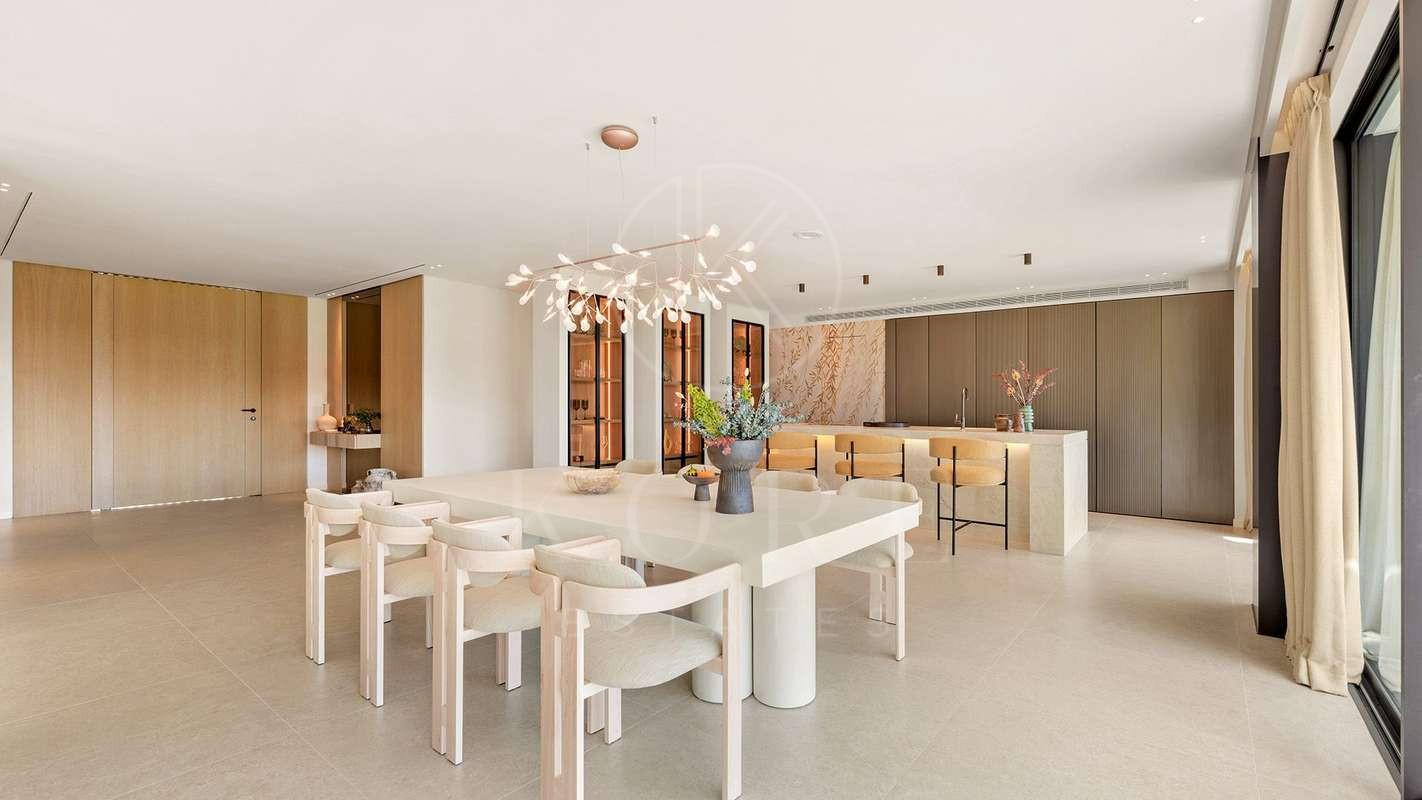 Este o vilă cu un design remarcabil, care datorită poziției sale de prim-plan în fața terenului de golf este dedicată în totalitate divertismentului și golfului. Intrând, veți fi întâmpinați de un spațiu de locuit modern și elegant, cu o bucătărie frumos proiectată, deschisă către zona de dining și living. Prin ușile mari de sticlă de la podea până la tavan, veți avea o priveliște uimitoare asupra terenului de golf Los Naranjos. În plus, la acest nivel se află 4 dormitoare, toate cu baie proprie și terasă. Dormitorul principal, cu aproape 40 m2, include un dressing și o baie de designer, deschisă pentru a crea acea senzație de suită luxoasă. Zona piscinei și terasei oferă mai multe zone de relaxare și elemente de apă conectate frumos cu piscina. Aici se află și garajul pentru buggy cu acces direct către terenul de golf. Terasa de pe acoperiș este visul oricărui organizator de evenimente. Aici veți găsi bucătăria în aer liber, zonele de relaxare și de luat masa, cinema în aer liber și a doua piscină a vilei. Toate oferind priveliști uimitoare asupra terenului de golf și văii. În subsol se află o sală de sport îmbrăcată în pereți și tavan din lemn închis, precum și biroul de acasă.