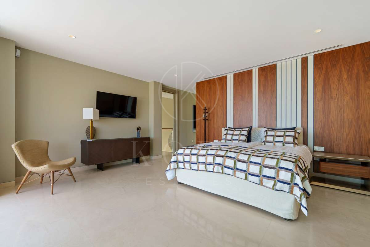 Răspândită pe trei niveluri, vila oferă șase dormitoare luxoase și opt băi, inclusiv o suită de lux cu o terasă privată și o baie inspirată de spa.