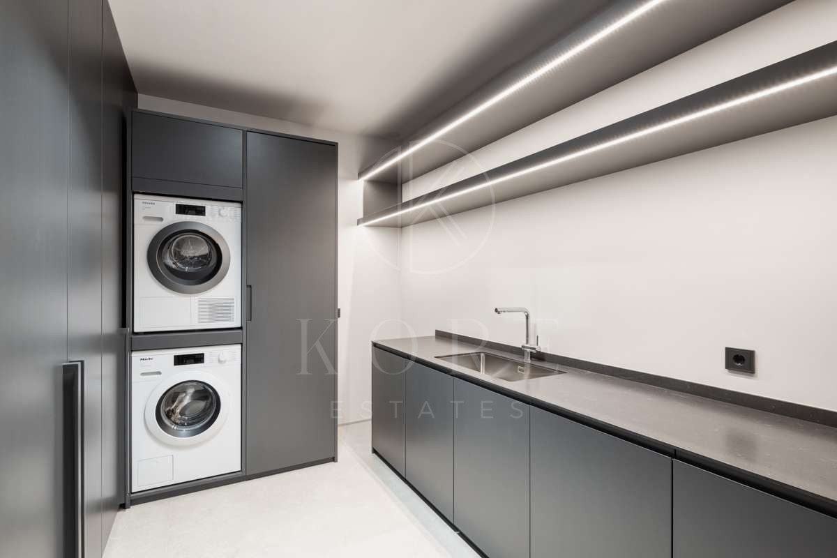 Intrați într-un interior care nu este deloc mai prejos. Zona de living, dining și bucătărie deschisă este luminată natural, datorită ferestrelor de la podea până la tavan și a unui tavan cu înălțime dublă care emană o senzație aerisită și spațioasă. Zona de living prezintă pereți uimitori din piatră Travertino Tajal, imitând exteriorul vilei, și un colț cozy decorat cu arbori frumoși. Bucătăria este un vis, cu proporții generoase, electrocasnice de ultimă generație, accente din stejar natural, spații ample de depozitare și acces direct atât către zonele de dining formale, cât și către cele intime. Un lift conectează toate nivelele pentru o mai mare comoditate, precum și duce către terasa de pe acoperiș care oferă vederi de 360º către La Concha și Marea Mediterană.
