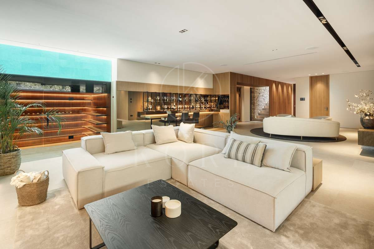 Descoperiți această oportunitate uimitoare, o capodoperă arhitecturală în Nueva Andalucia, unde fiecare detaliu este proiectat pentru a oferi un stil de viață de neegalat. La doar câteva minute de Puerto Banus și la distanță de mers pe jos de toate facilitățile, această proprietate extraordinară combină un design modern uimitor cu o locație de neegalat. Exteriorul vilei se mândrește cu o piscină infinită impresionantă, întinzându-se fără sudură de la grădină la interior, îmbogățită de lumini LED care creează o atmosferă fermecătoare pe timp de noapte. O terasă generoasă oferă mai multe zone de relaxare și spații pentru cină în aer liber, perfecte pentru divertisment sau relaxare în stil. Accesibilă printr-o alee privată, vila include o garaj privat convenabil, asigurând intimitate și securitate ultime.