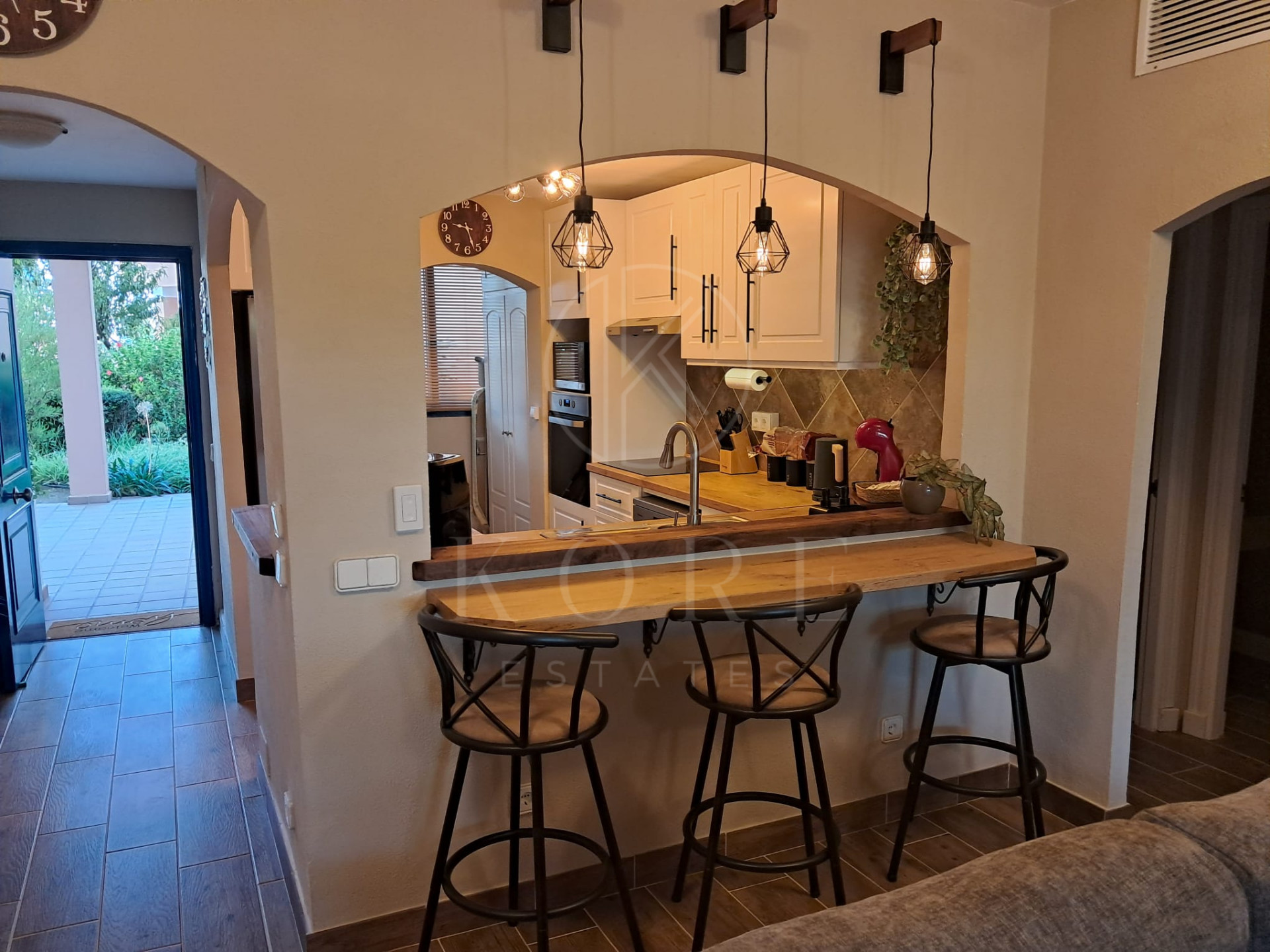Apartamentul este compus din două dormitoare bine proporționate și două băi moderne, inclusiv un elegant dormitor matrimonial cu baie proprie, precum și o toaletă pentru oaspeți pentru un plus de comoditate. Bucătăria open space, complet utilată, este echipată cu electrocasnice de înaltă calitate și este completată de o cameră separată pentru utilități și spălătorie. Zona de luat masa se integrează armonios în spațiul de living, care dispune de un șemineu primitor și acces direct la terasa acoperită, ideală pentru mese în aer liber sau relaxare în clima mediteraneană. Proprietatea este oferită complet mobilată, cu pachete opționale de mobilier disponibile, și se află într-o stare excelentă, recent renovată.