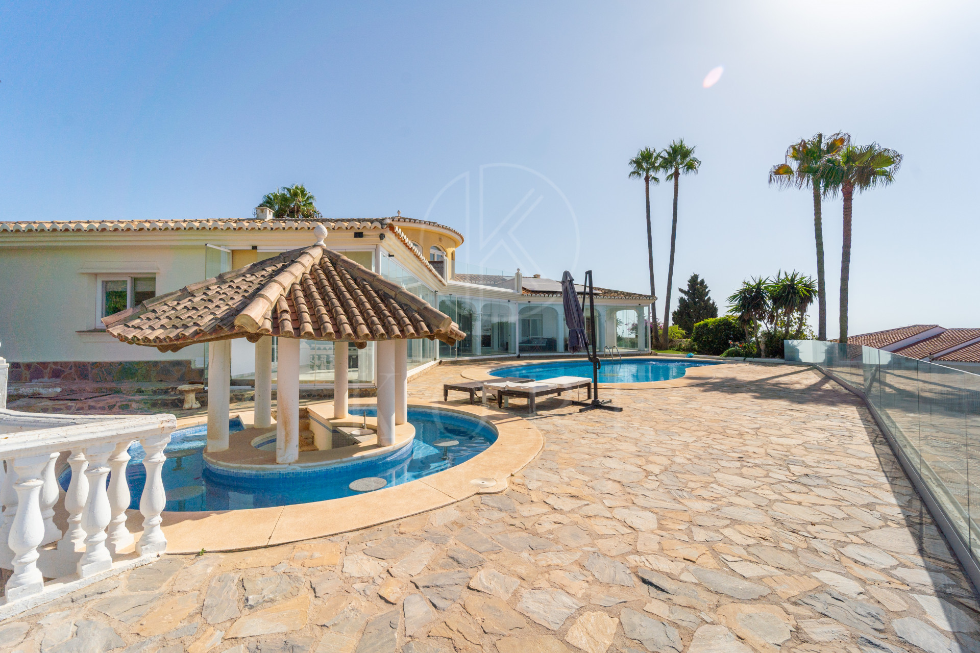 Terenul oferă grădini frumos amenajate și o piscină mare lângă un bar separat cu acces direct din piscină, terase însorite și priveliști incredibile.