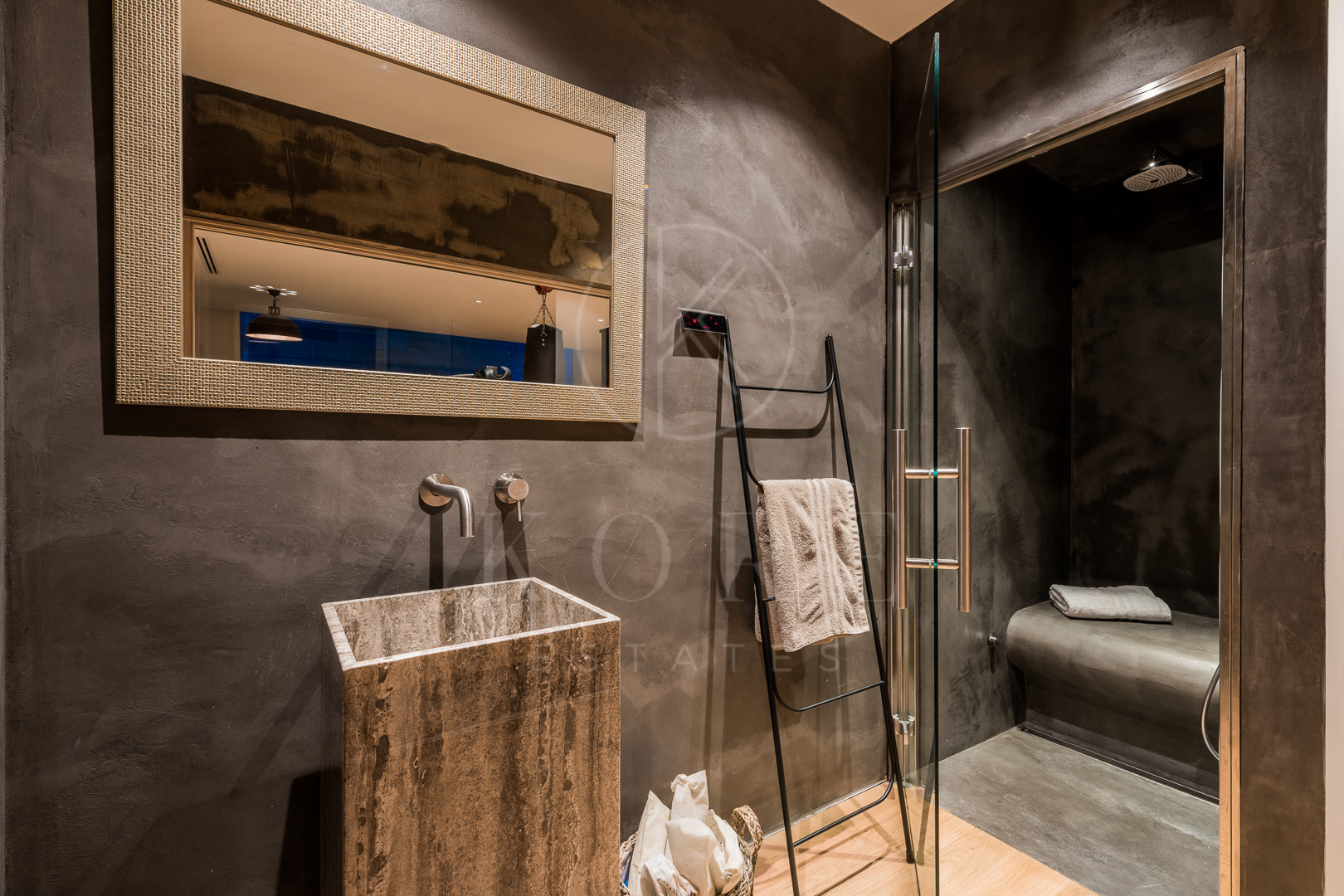 Ieșiți afară pentru a vă bucura de 123 m² de terase acoperite, un solariu privat și o zonă de piscină splendid amenajată — perfecte pentru divertisment sau relaxare liniștită. O casă separată pentru oaspeți oferă și mai multă versatilitate, complet echipată cu dormitor propriu, baie, garderobă și solariu pe acoperiș, toate legate de reședința principală printr-un pod elegant din sticlă.