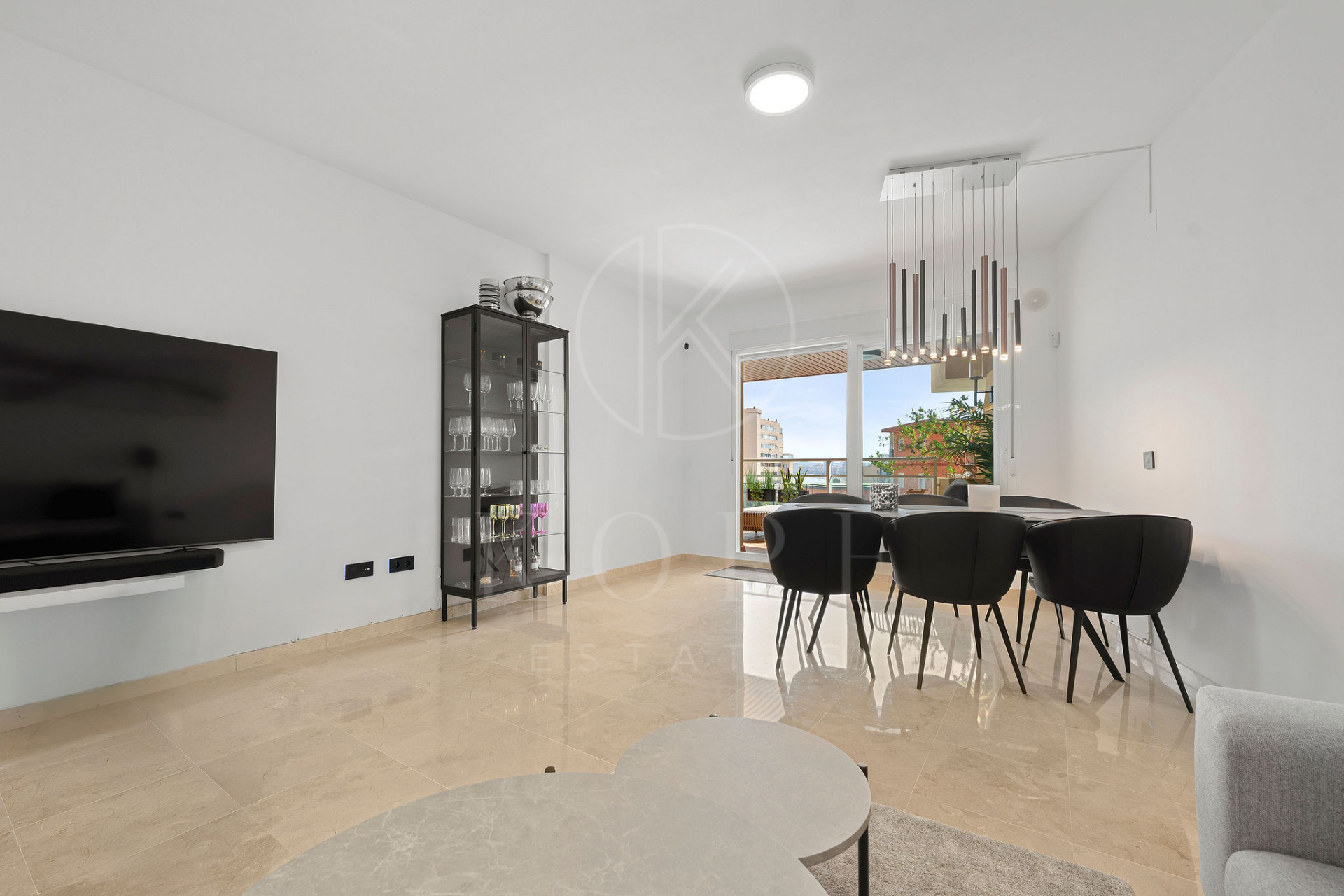 Bucurați-vă de un spațiu de locuit luminos și primitor, cu pardoseală elegantă din marmură și acces direct la o terasă mare acoperită cu orientare sud-vest, ce oferă vedere la piscină și vedere parțială la mare.